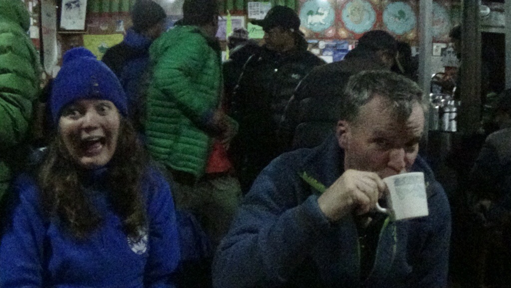 Our typical routine is waking up at 6am to a very cold room (I am rooming with my brother John). We put on our hiking clothes, pack our duffel bags and backpacks for the day. We put out our duffel bags to be picked at 7am and then head to breakfast. We typical have porridge and a hot breakfast along with tea or coffee. (I have been drinking black tea the entire trip). We then meet up at about 7:50am outside to access the weather and put on the appropriate layers for our hike. We leave about 8am for the hike. We periodically take breaks and usually stop for tea mid-morning for an extended break. We continue to hike and then stop for lunch. After lunch we finish up the hike and arrive at the tea house where they serve us snacks and tea. Usually our duffel bags have arrived when we arrive either from porters or yaks carrying them. We are given our room and we change out from our hiking clothes and usually go back to the dining room which is the only heated room in the tea house. Dinner is usually around 7pm and everyone staying at the tea house is there. Sometimes it is very crowded. Dinners are usually a mix of American food and Nepalese food. After dinner if you want to stay up you stay in the dining room and use the internet (if available – so far only about 50 % of the time), read a book or watch a movie. Sometimes the dining room can get very crowded but it is also warm. Once you are ready for bed then you slip into your sleeping bag and hopefully fall asleep