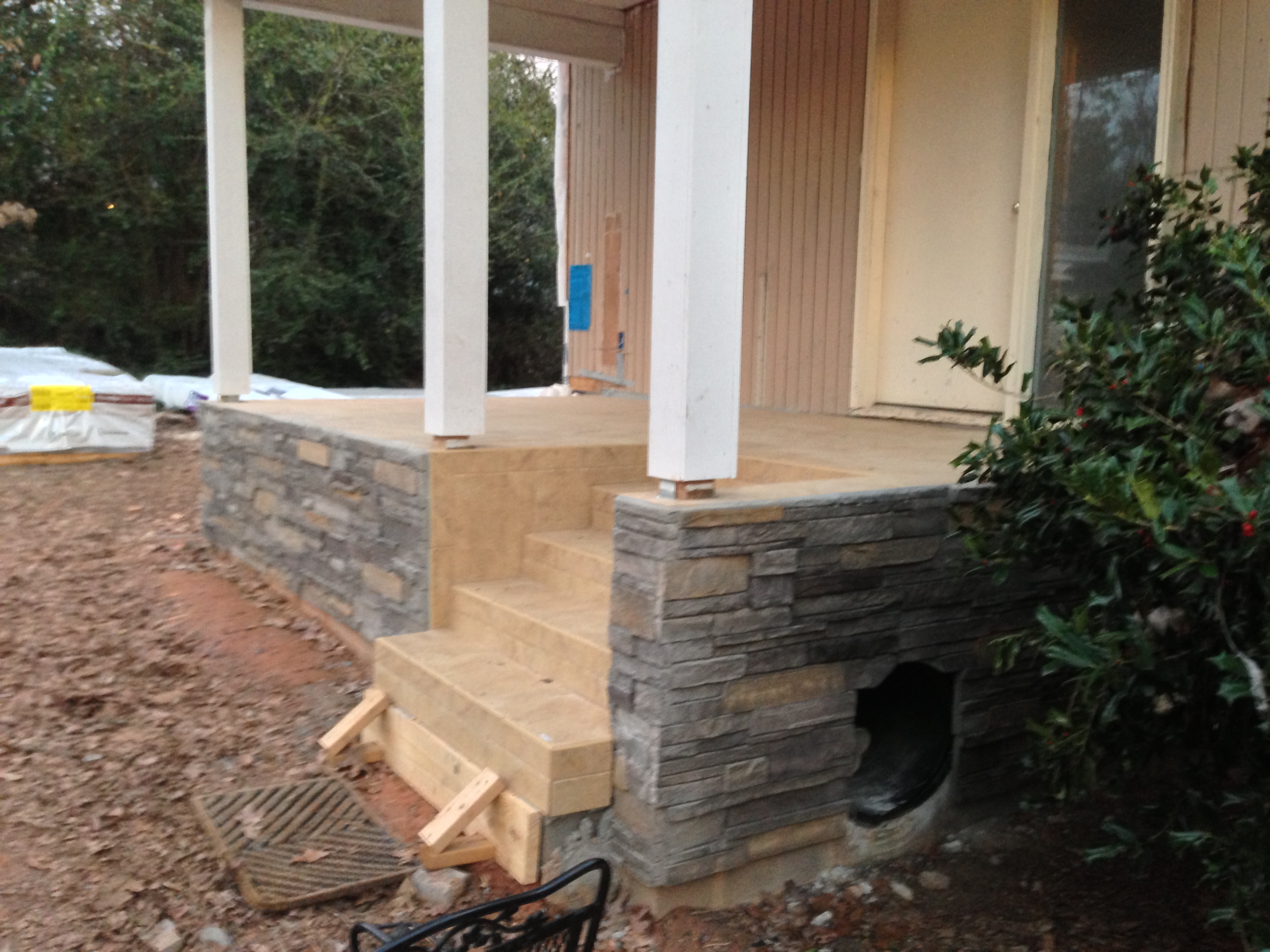At the time we bought the house I always had in the back of mind to build a model railroad layout and I thought that the outside of this house would work nicely. Since we were designing a new front porch I decided to include a tunnell through the center of the porch from side to side to accomodate a garden model railroad.