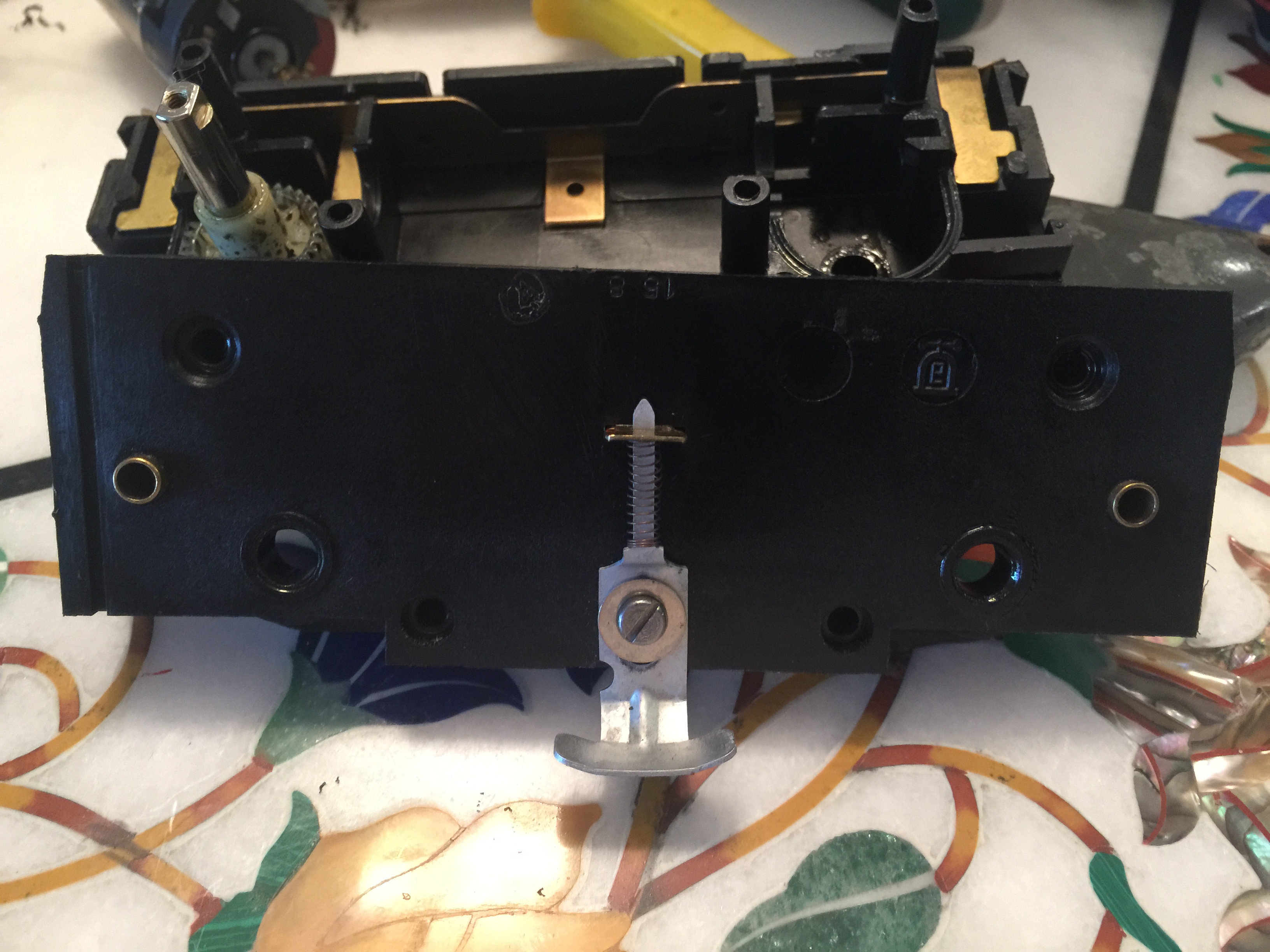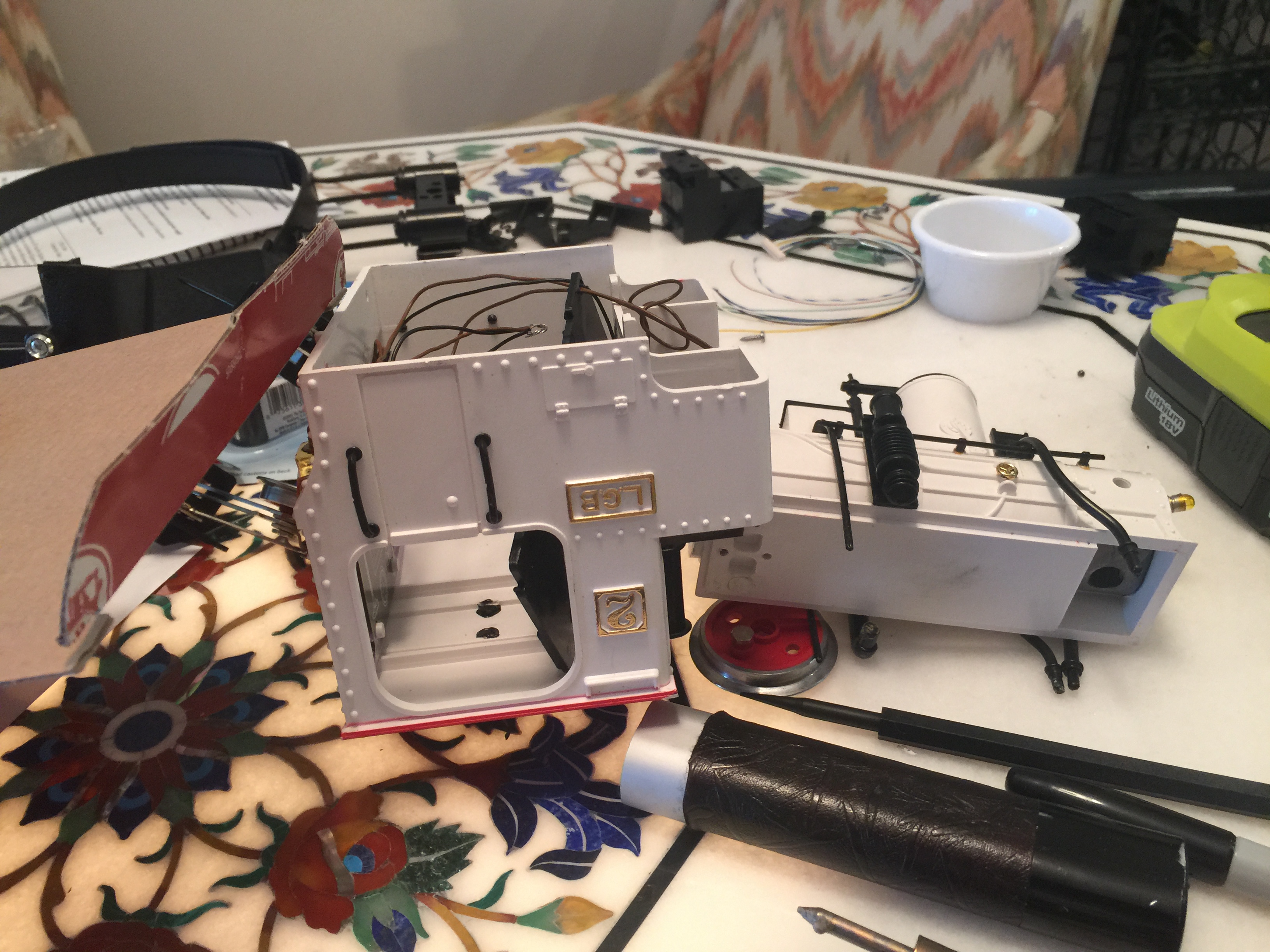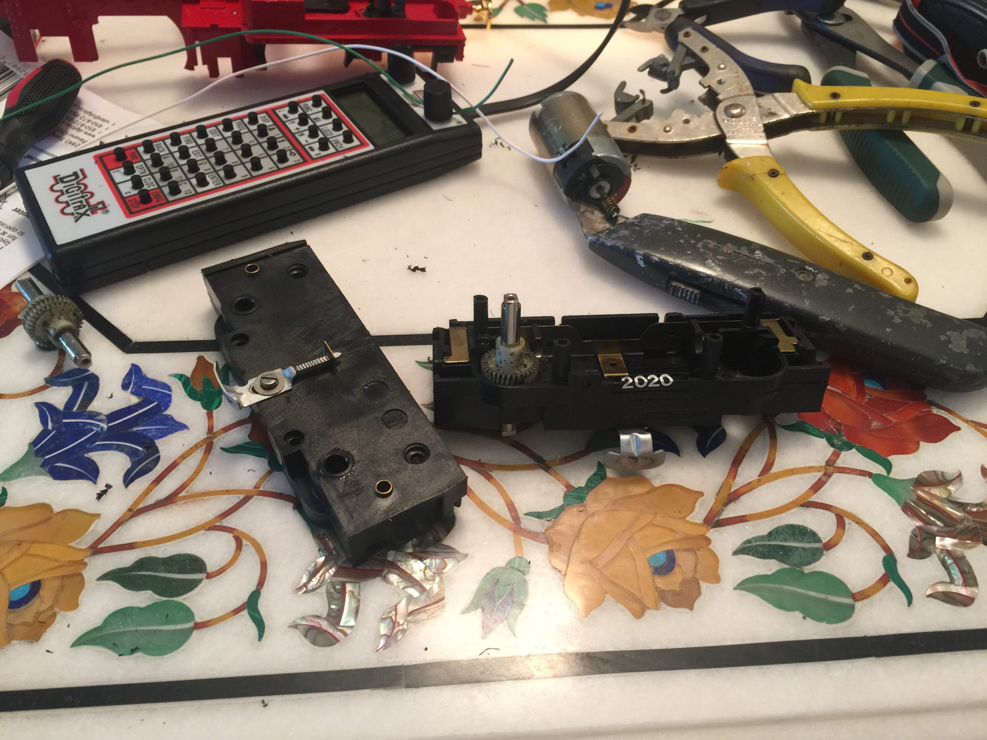 So now that I have selected both I have to get the controls, batteries and other items into the different locomotives. Some are easier than others. I decided to tacks and easy one and a hard one this past weekend. I first worked on the Kalamazoo Toy train Notre Dame locomotive. This is a steam locomotive with a coal car that follows. At my first attempt I could not get the locomotive entirely disassembled. The problem was getting the motor box out of the bottom of the locomotive. Eventually I found that one screw secured the back and a bolt for the smoke stack and then the motor box could be pulled out. I opened up the motor box and found that they used copper pieces to connect the track pickups to the motor leads. I then cut the copper piece that connected to the motor leads and soldered 2 wires onto the motor leads, drilled a hole in the box and brought the wires out. For the track pickups, there were two contacts already there for the lights and I just attached two more leads coming out. Unfortunately there was not room in the locomotive for the DCC card so I installed the card inside the coal car and ran the 4 leads back to the coal car. The DCC module only needed the 2 wires from the track pickup and 2 wires for the motor and I now had a DCC controlled locomotive. I will need to add batteries, switches, and a sound card into the coal car soon but at least (when the locomotive was reassembled) I had a working DCC locomotive.