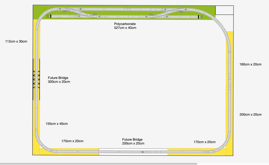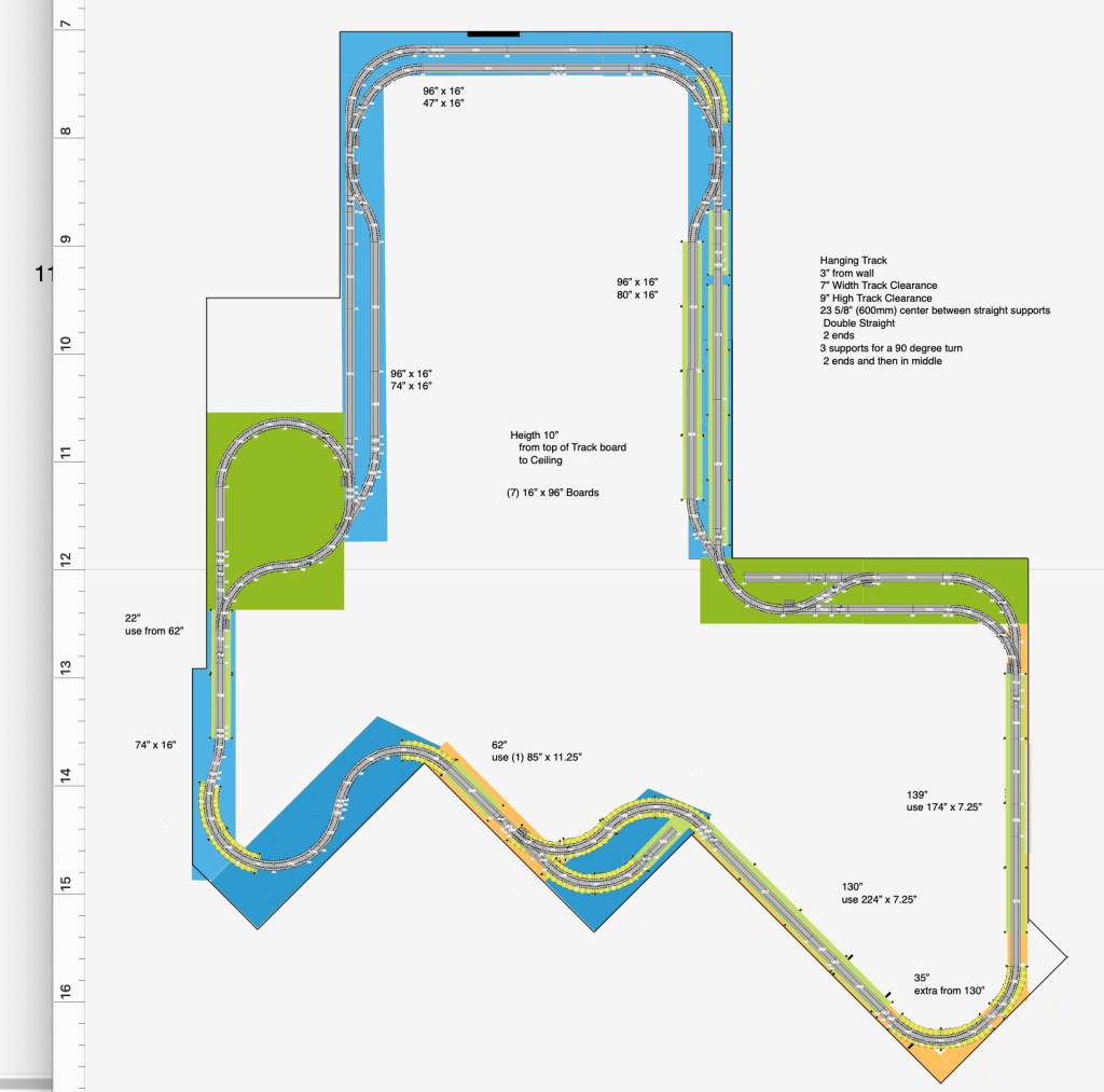 Build the shelves for the layout. I am trying to maintain at least 9” free height and 7.5” width on the layout but this will primarily be controlled by door heights and room challenges. Using Railmdelerprohttps://www.railmodeller.com/home-railmodeller.html I laid everything out including the track, wiring, shelving, brackets, and controls. For the shelves I am using wood shelving, plastic sheets, and hanging brackets. The brackets will come later on in the project. I decided to try clear plastic shelving so you can see the trains moving through the main/pass lines. I first tried 1/2” acrylic but found it be brittle and very heavy. I broke one of the pieces installing it the condo but was able to join it back together to use. For the shop I am trying 3/8” clear acrylic and it working out better. For single track I am using 7.5” shelving and for double track 16” plywood.