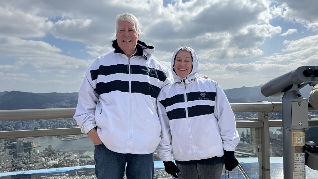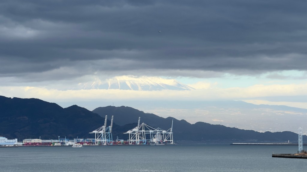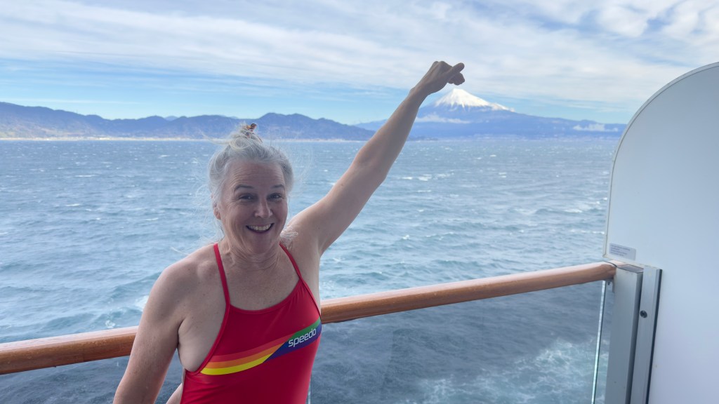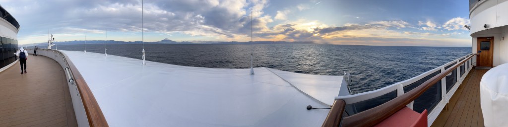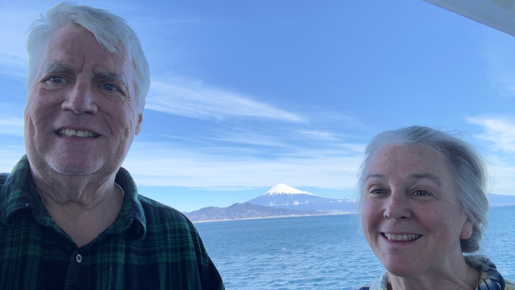 Today (February 16, 2024) we stopped in Shimizu, Japan. Nana and I took a break from excursions today and just stayed on the ship. The highlight of the day was seeing Mt. Fuji.  We were told it was very very rare to see the top. Some gorgeous views. It was very windy and cold as you can see from the photos.  Later in the day you can see it started to cloud over.