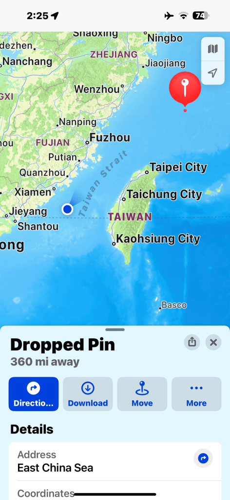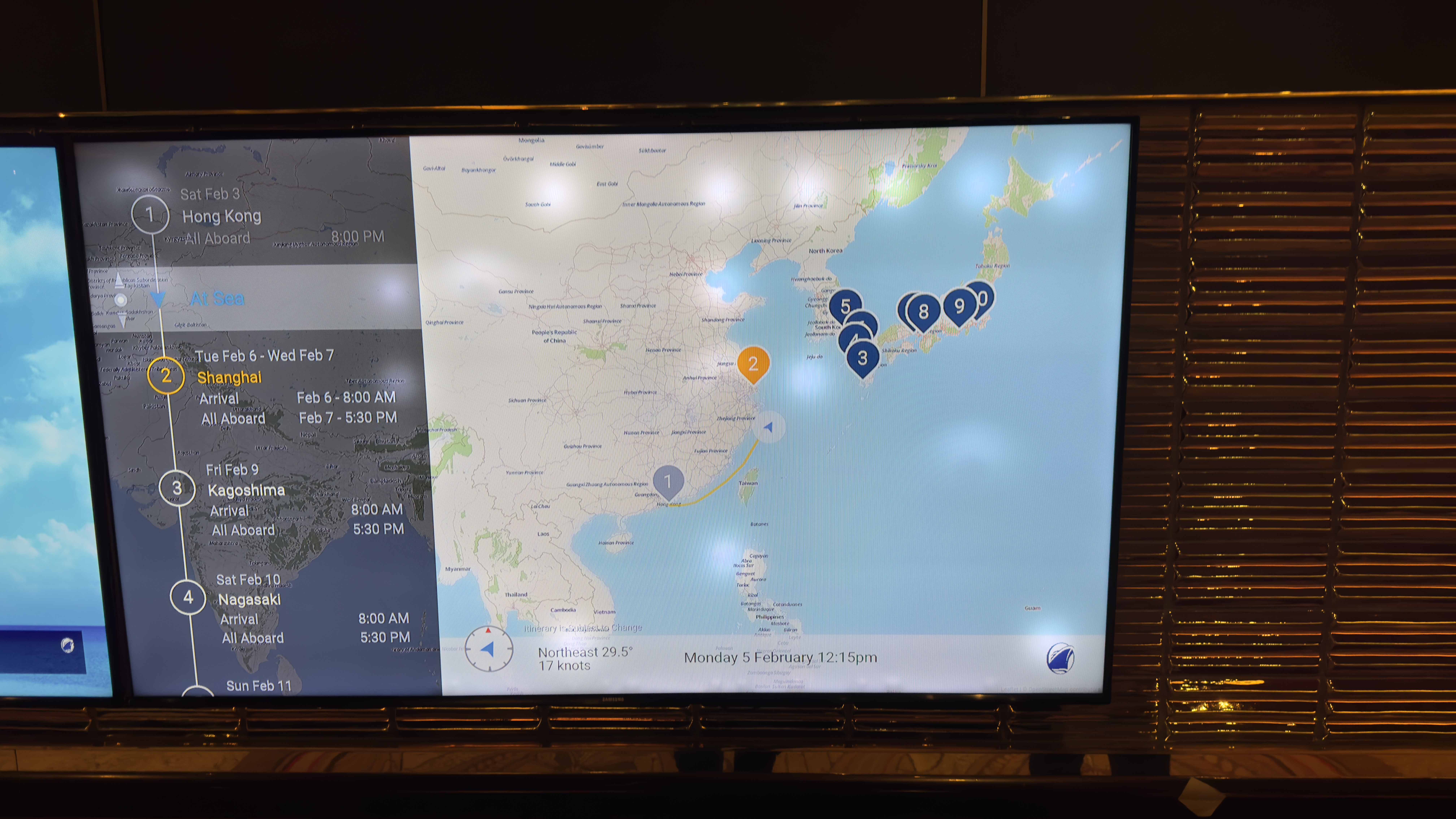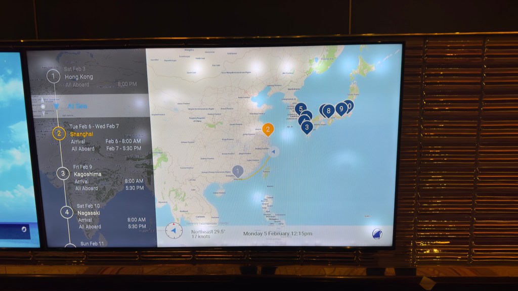 Day 15 (February 4th, 2024) was another sea day.  A little tense as we sailed through the Taiwan Strait today.  No jets nor destroyers sighted so looks like no problems today.  We were not far from Taiwan and China.  Nana and I have settled into our routine.  We get up early, play basketball at 6:30am outside on the upper deck, then exercise class and/or the weight machines for Papa.