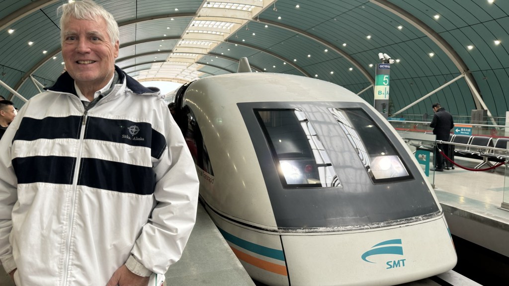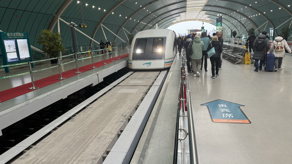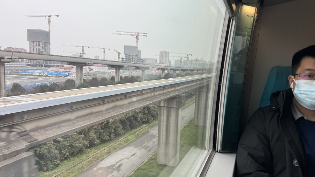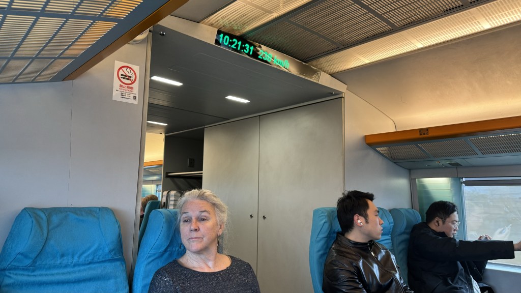 Our excursion today was …… wait for it…… A TRAIN RIDE ! We rode the Maglev (Magnetic Levitation). This train goes between downtown and the airport. 185 mph, an 8 min ride. Taxi ride is over an hour. Very smooth and fast. Only one of 6 Maglev train in the world.   All the Maglev trains are in Asia.  We took it both ways.  The digital display shows the train speed in kmh.