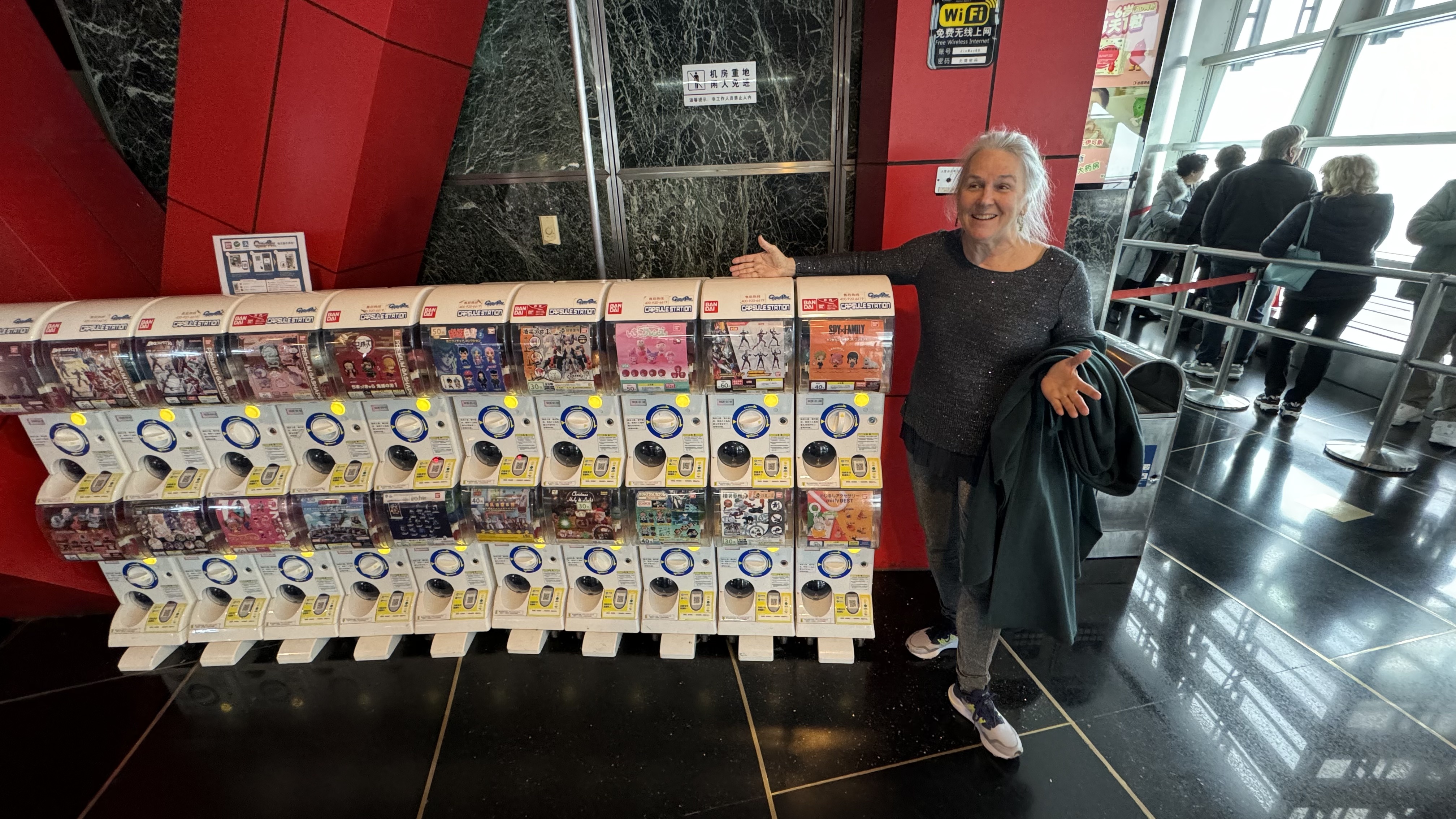 We saw some Chinese children and they stared at us and some wanted to practice their English which wasn’t very extensive. At the top of the high rise that we went up 88 stories, you can look down on the hotel in the middle all the way down to the lobby. Nana thought it reminded her of a star wars movie scene. They also offered a walk around the outside, you are tethered with a strap that you can walk around with. Unfortunately it was not available today. Nana also found some more action figures and all of the dispensers used your phone to buy. As you might suspect though none of the paying apps are foreign friendly, Apple Pay was not available anywhere. With no foreign tourists for 4 years, the paying process has become less foreign friendly.