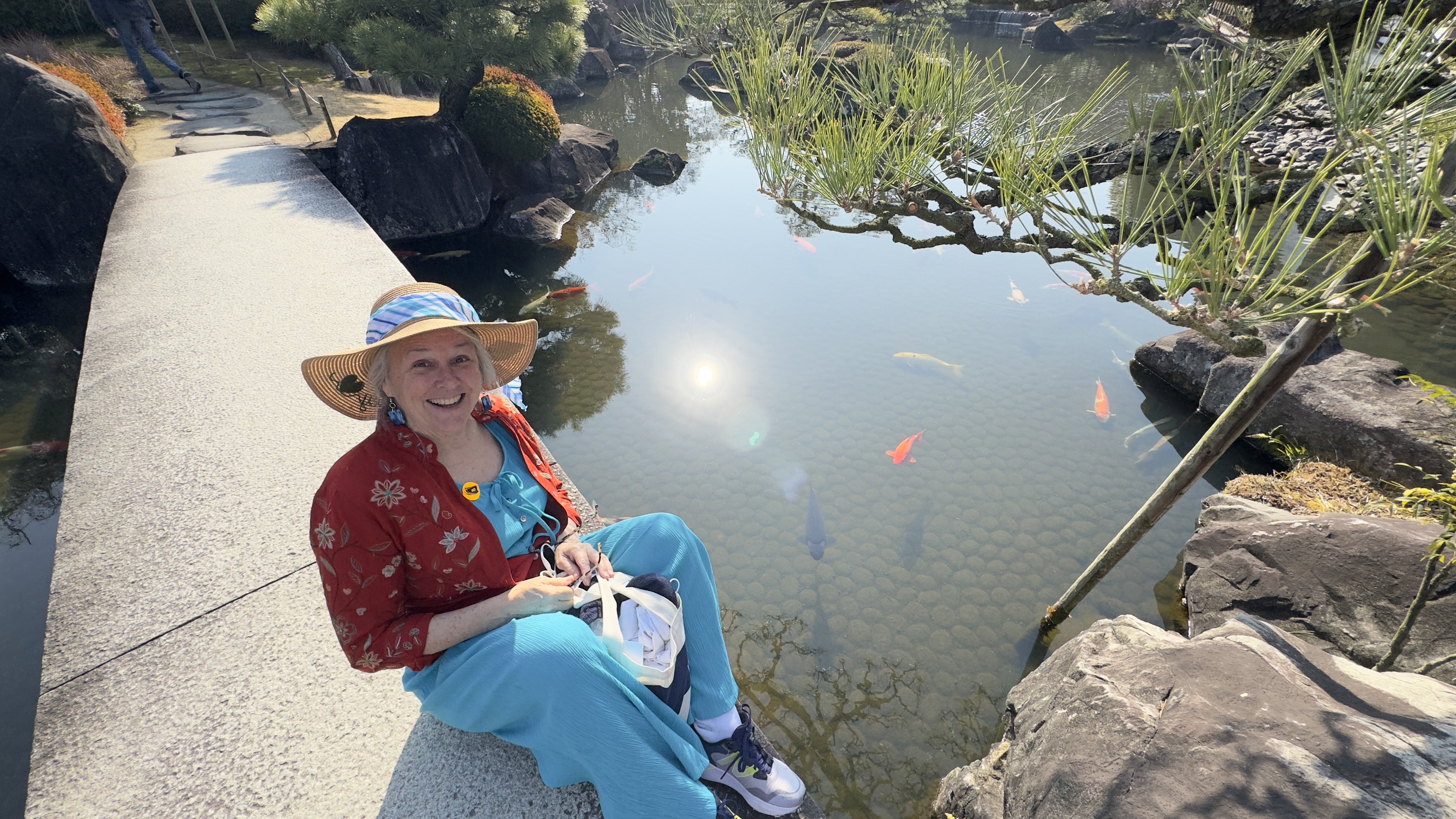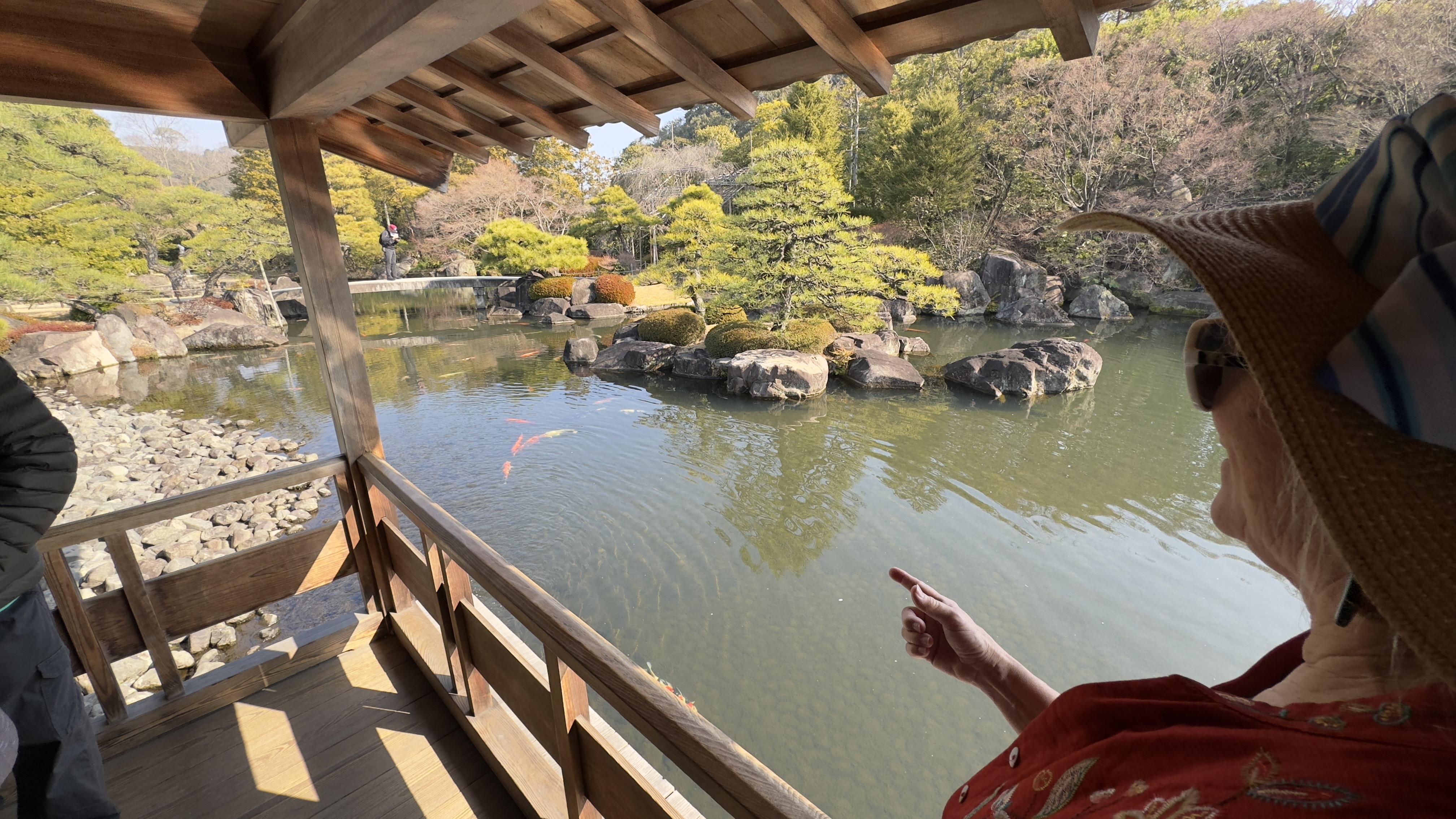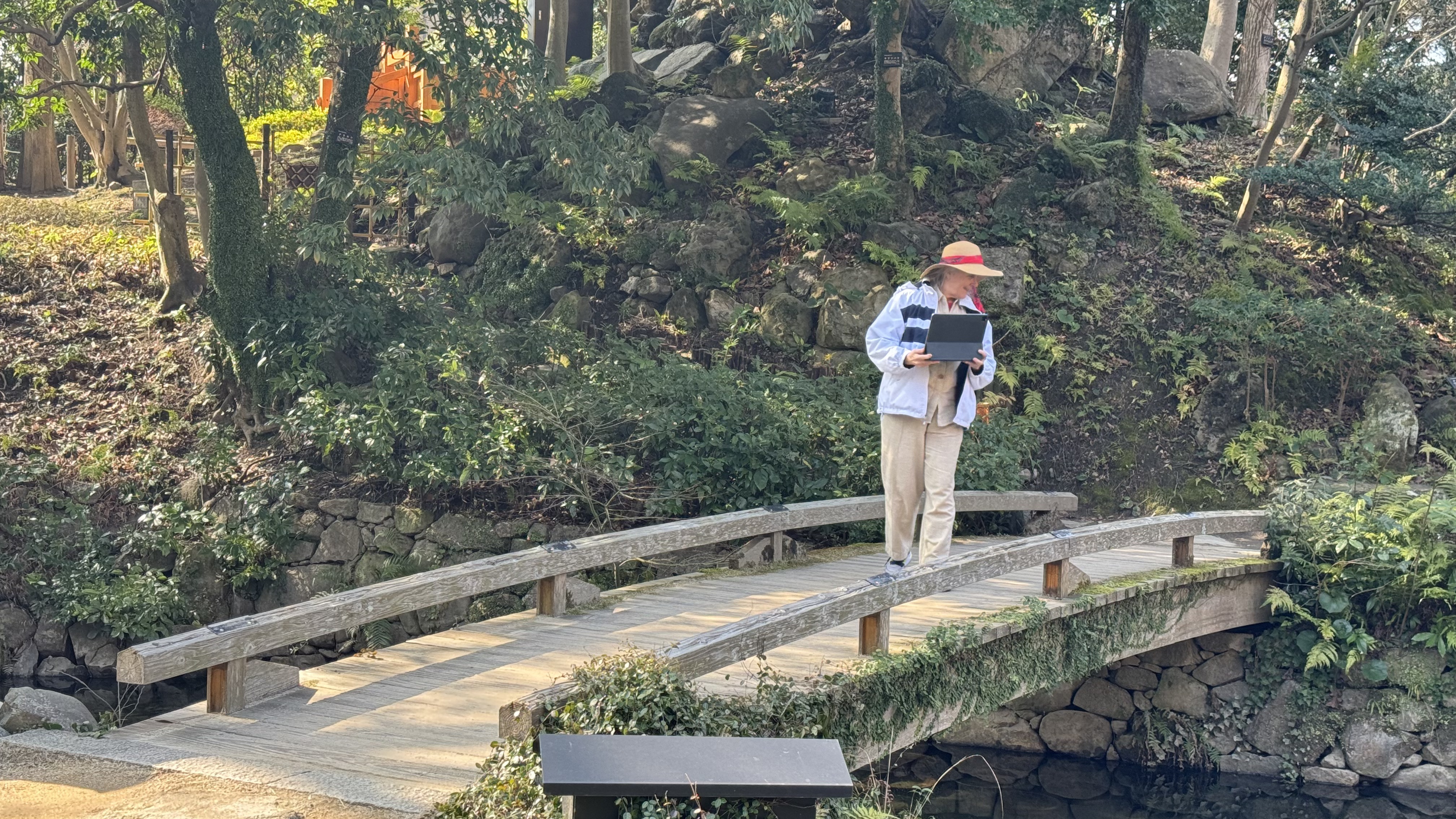 We next visited a traditional Japanese garden. Nana enjoyed walking around with iPad watching the game.