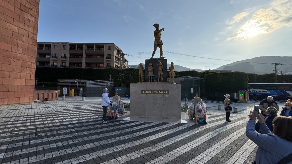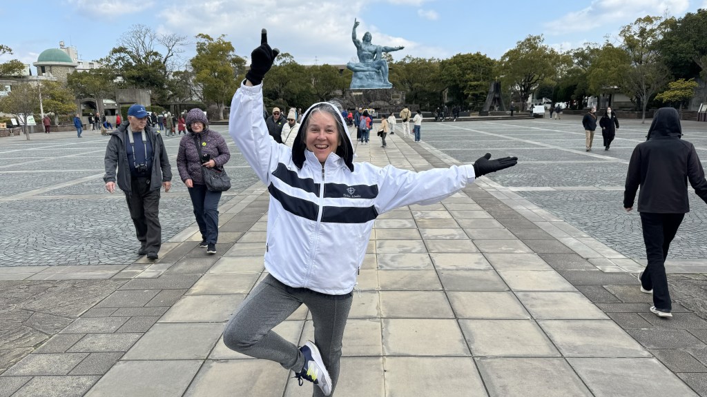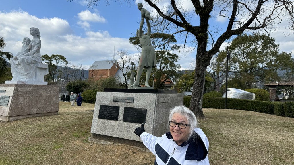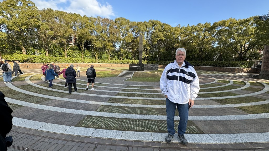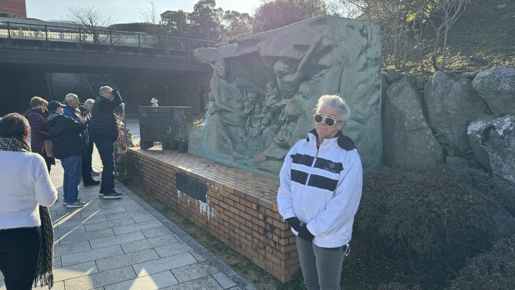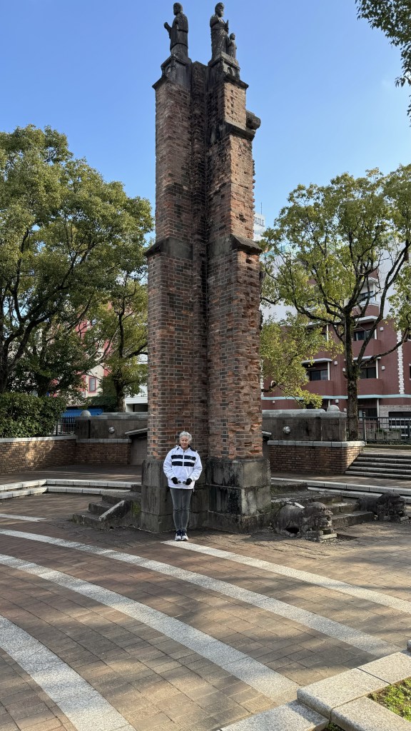 Today we arrived into Nagasaki, where the 2nd atomic bomb was dropped. After stretch class for both of us and breakfast, we left on our tour. First stop was ground zero where the bomb was dropped. The devastation was unbelievable.   Papa is at ground zero. Nana is standing next to column of the Cathedral that survived the blast.
