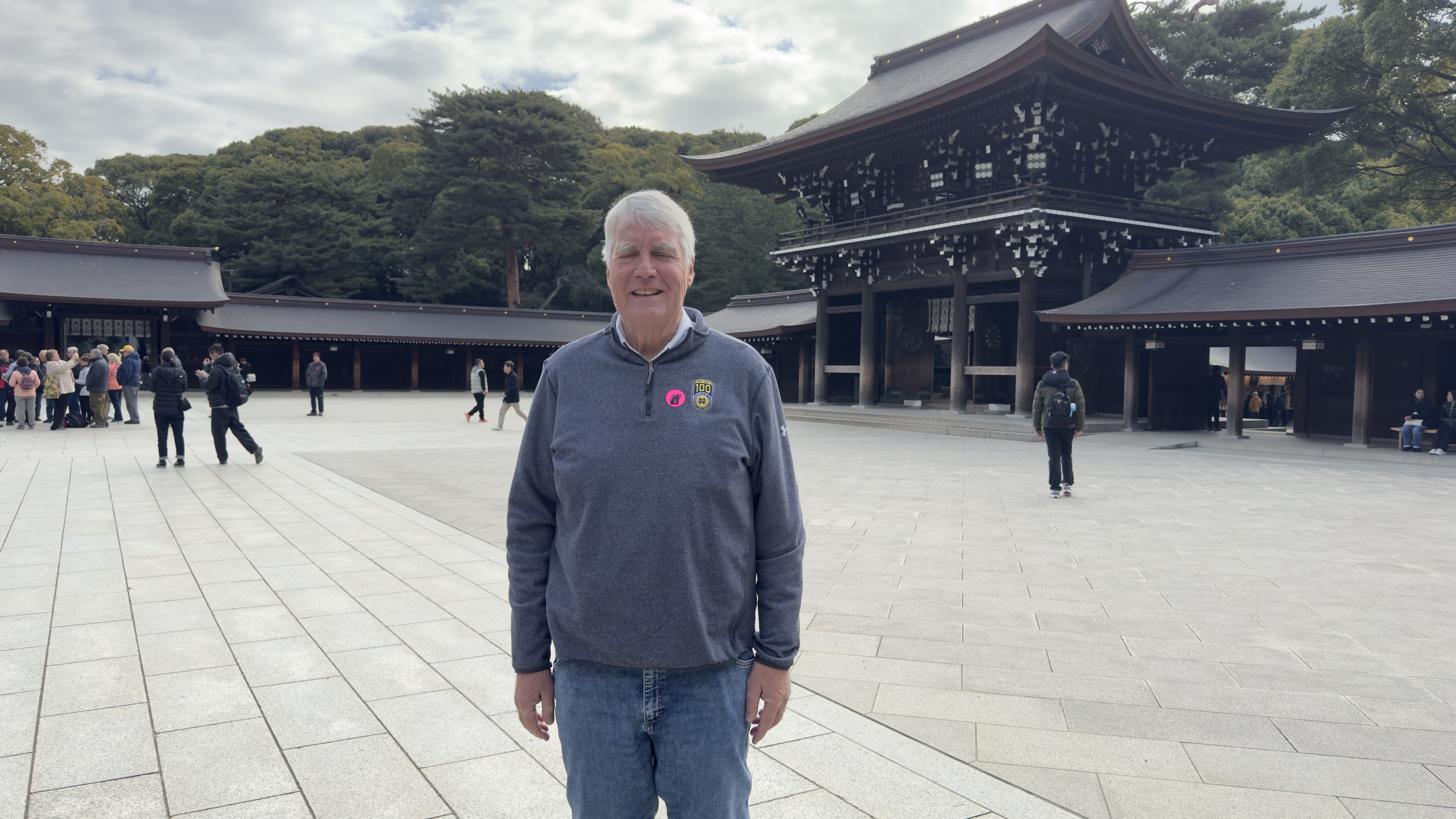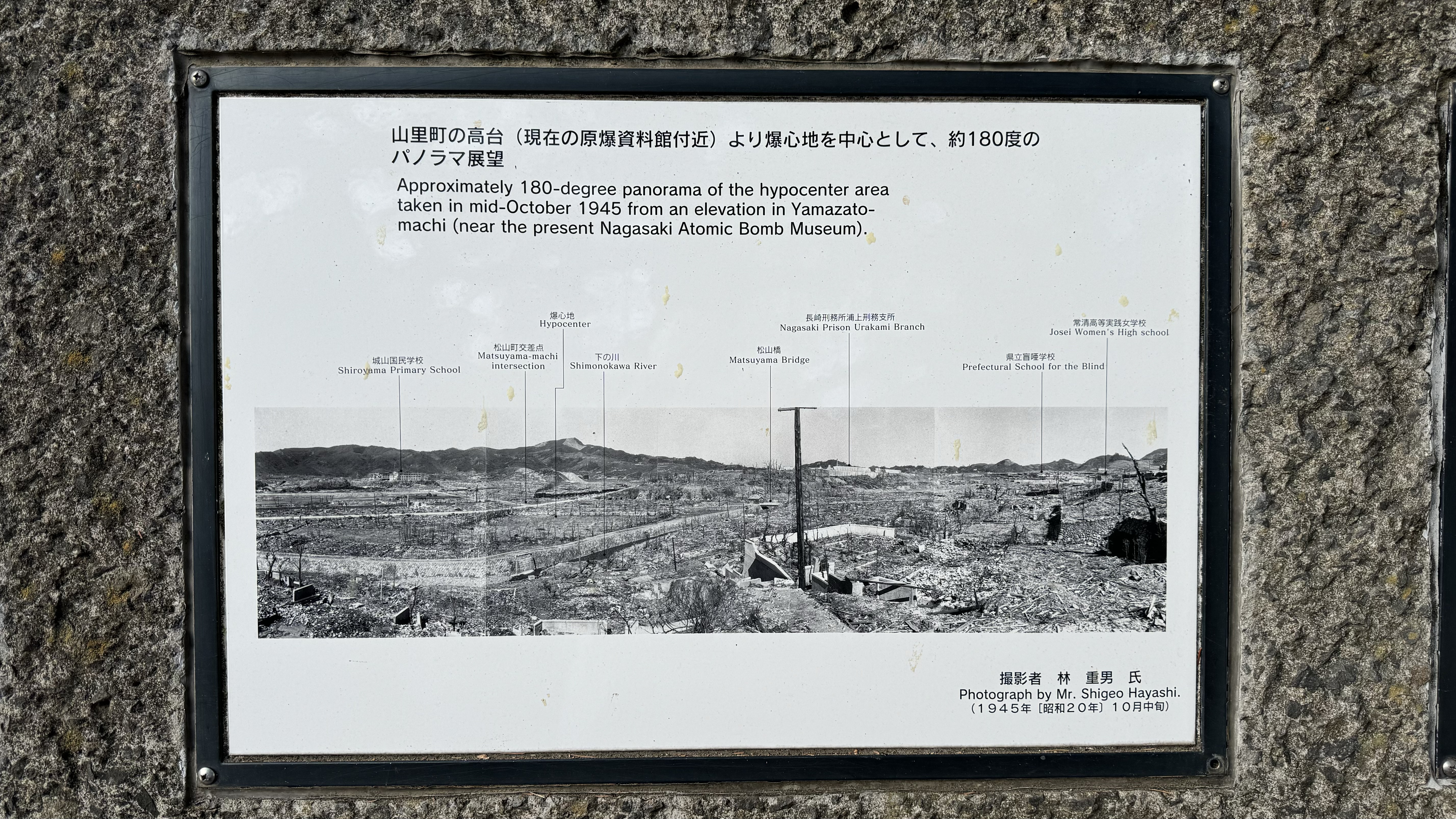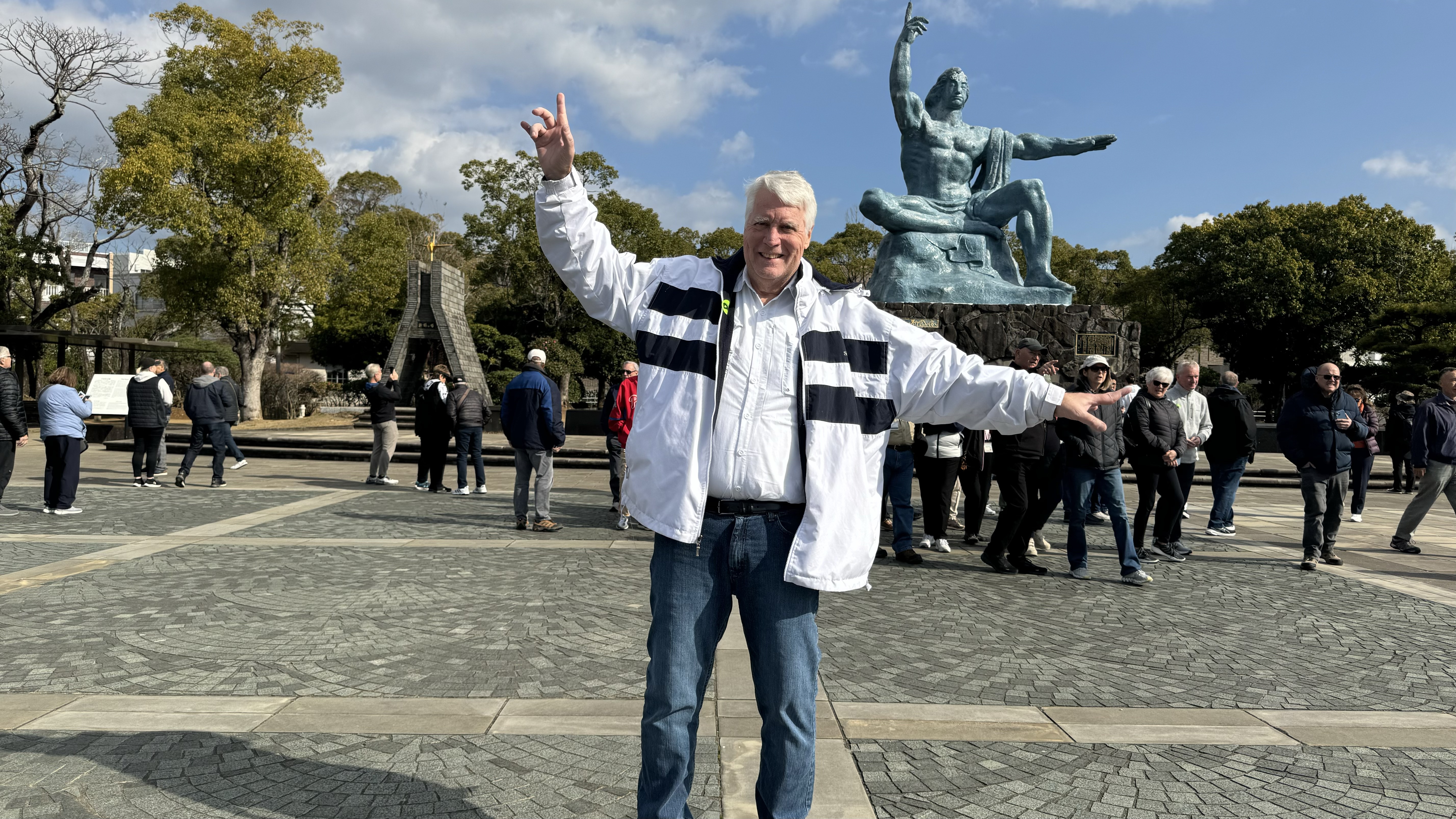 Today we arrived into Nagasaki, where the 2nd atomic bomb was dropped. After stretch class for both of us and breakfast, we left on our tour. First stop was ground zero where the bomb was dropped. The devastation was unbelievable.   Papa is at ground zero. Nana is standing next to column of the Cathedral that survived the blast.