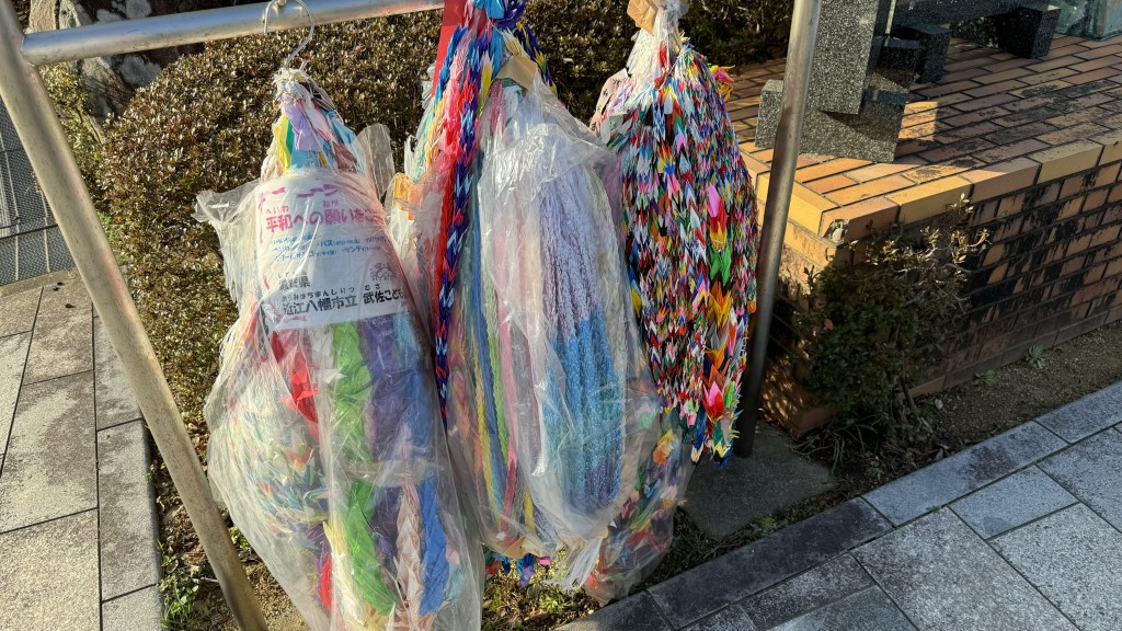 Many monuments to peace and prayers for the people that died. Many people create strings of origami as prayers and put them at the monuments.
