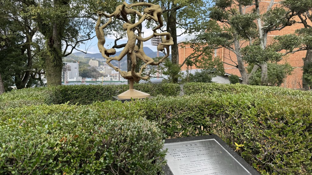 Next stop was the peace memorial which the city erected 10 years after the bombing. Many countries have donated statues including the US.  The peace memorial is very descriptive, the hand pointing up warns of the the nuclear bomb, the hand outstretched symbolizes peace, the closed eyes are for the dead, the face is neither Asian or European symbolizing that we are all in this world together.