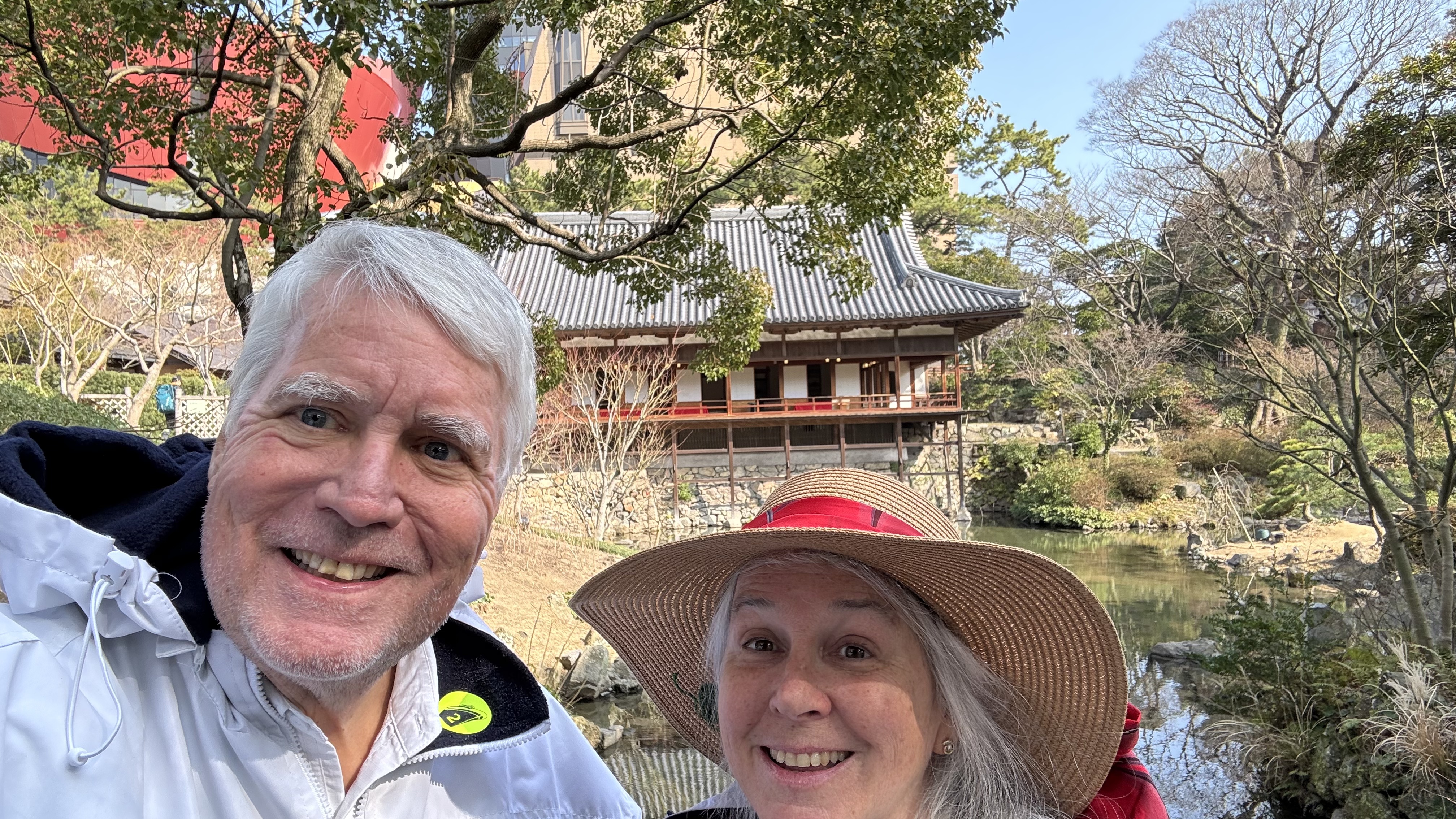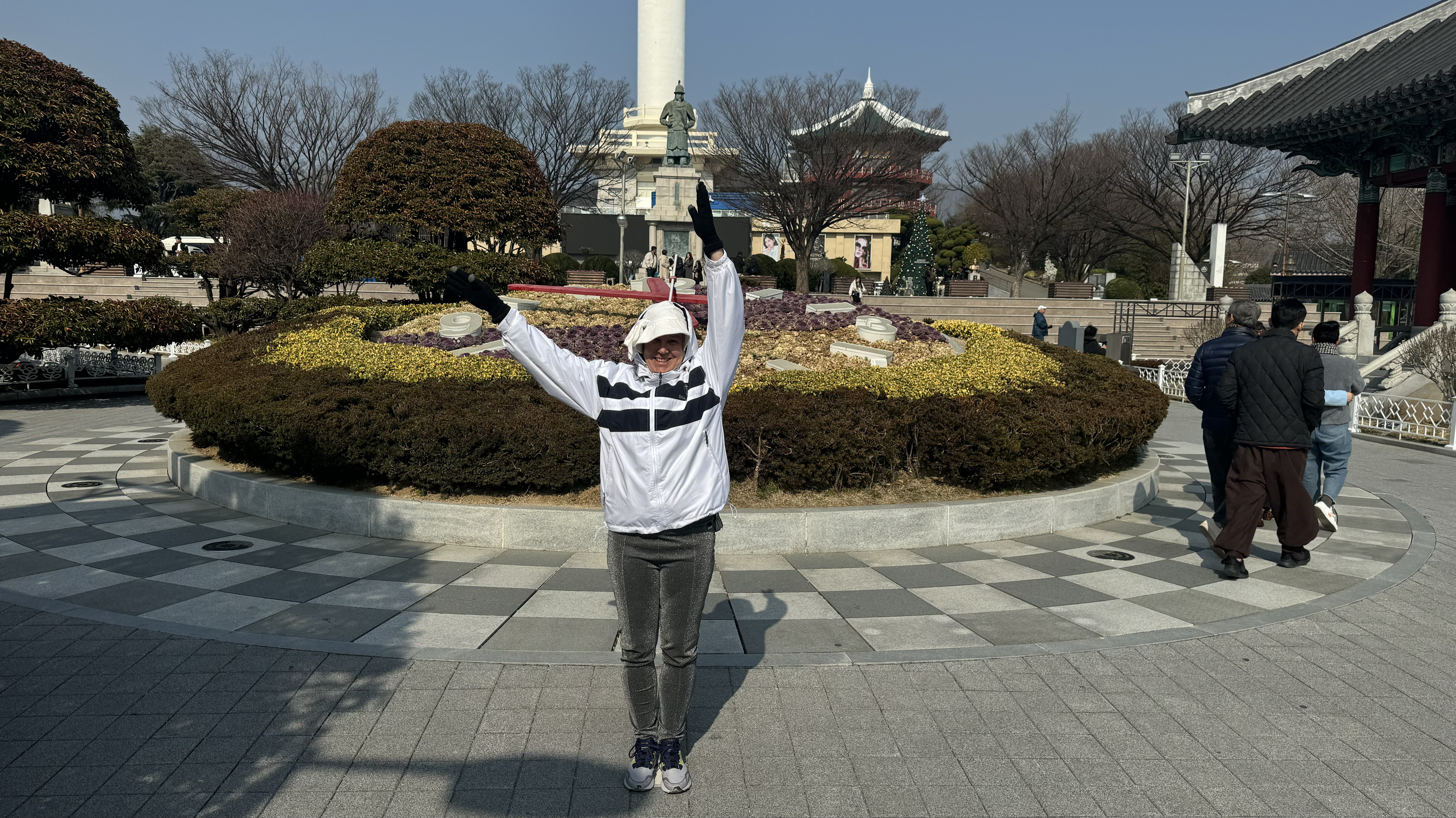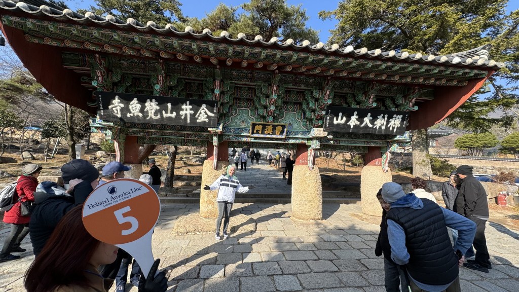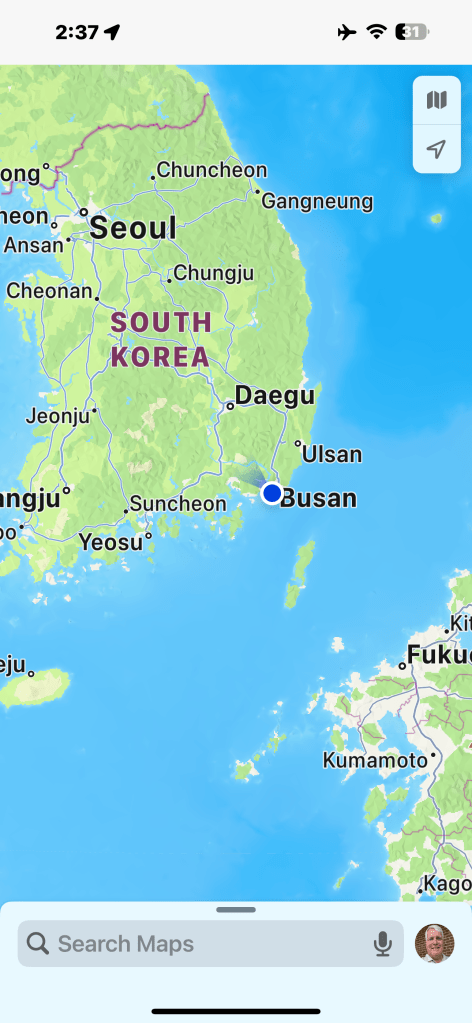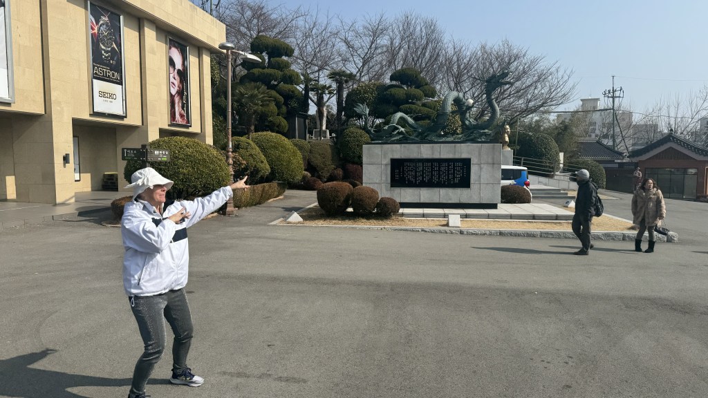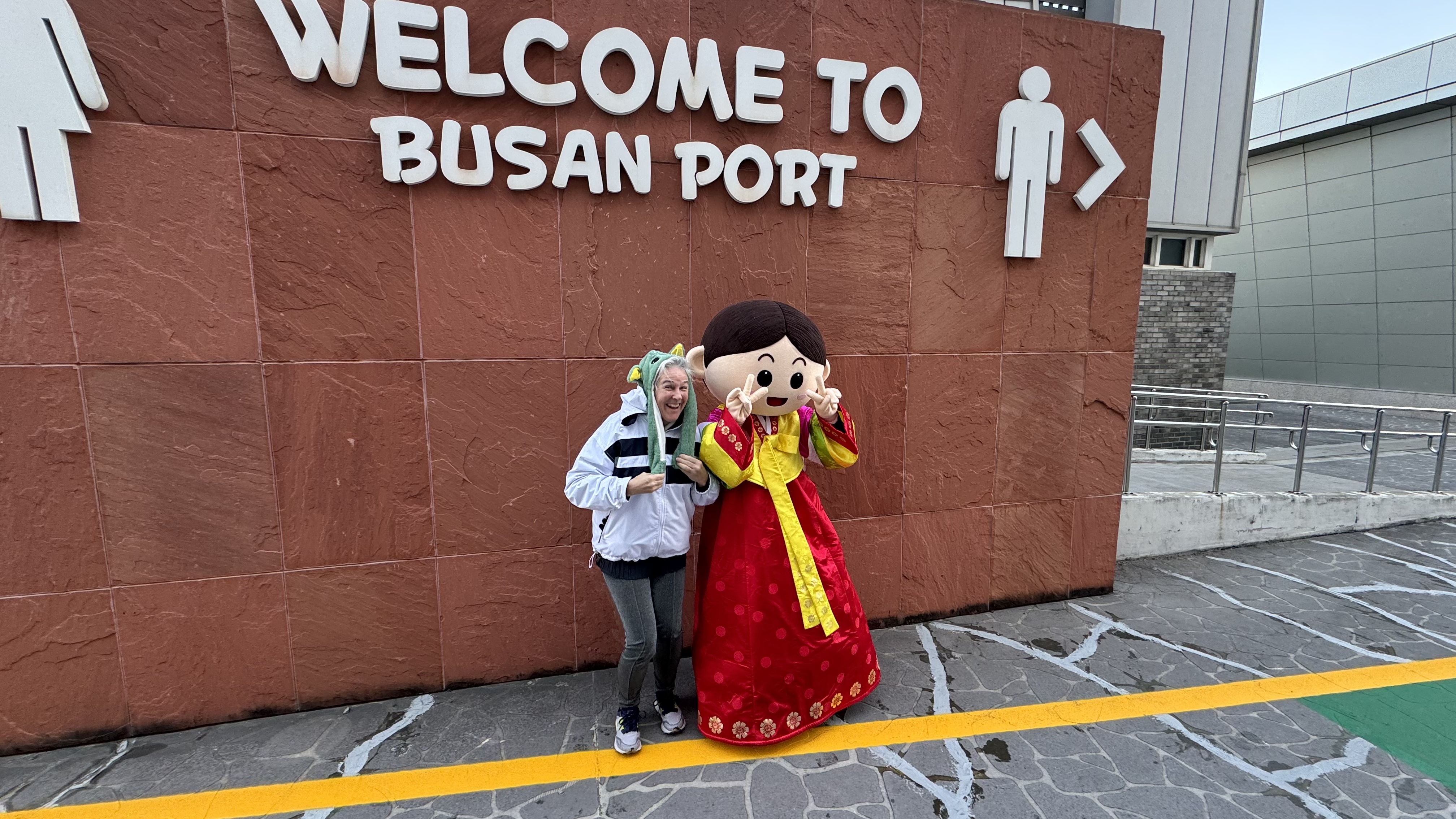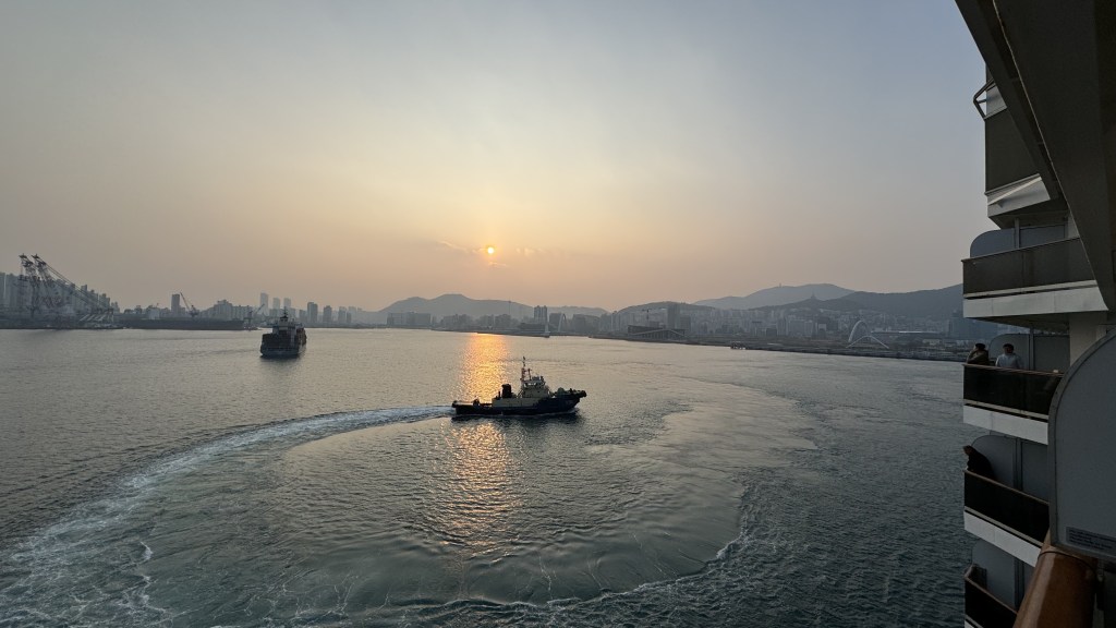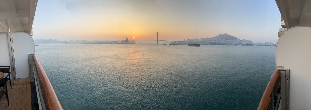Today, day 22, we arrived to Busan, South Korea. We are the first cruise ship to arrive in 2024, but unlike China there were 180 ships last year….. China had zero last year. A gorgeous sunrise from our balcony but very cold today, 32 degrees.  We decided it was too cold for basketball this morning and even too cold for ping pong on the Lido deck. So off to the exercise room for a good workout.  Nana showed off her new Yoda hat as we left the ship.