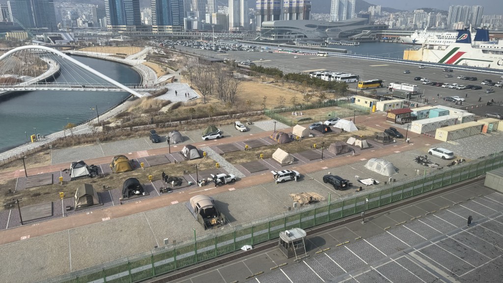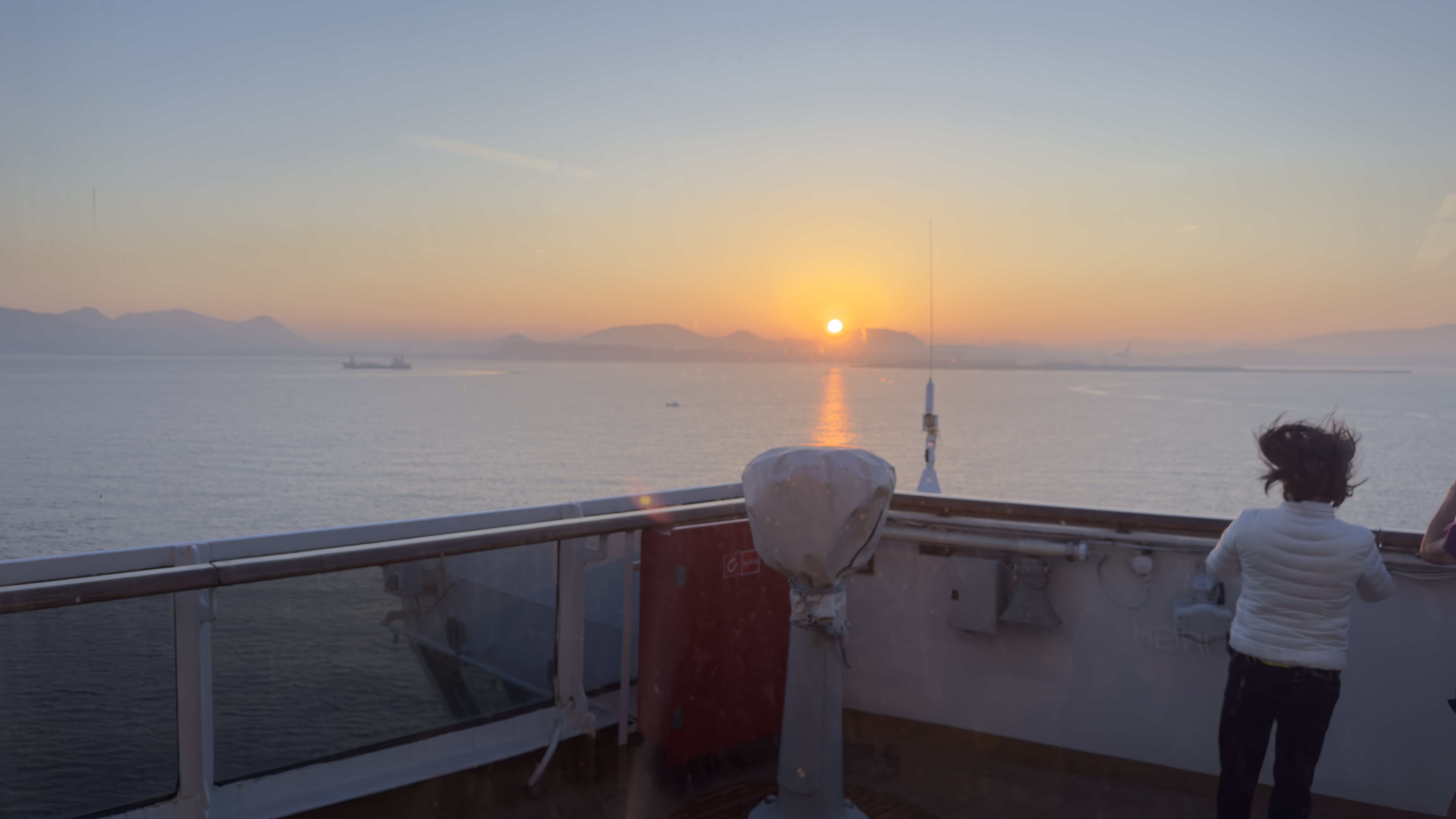 Busan is changing there cargo port into an entertainment area and cruise ship docking to promote cruise ships. Still a long way to go. In the meantime you can camp next to the cruise ship. Another fantastic sunset on our way out of the port.