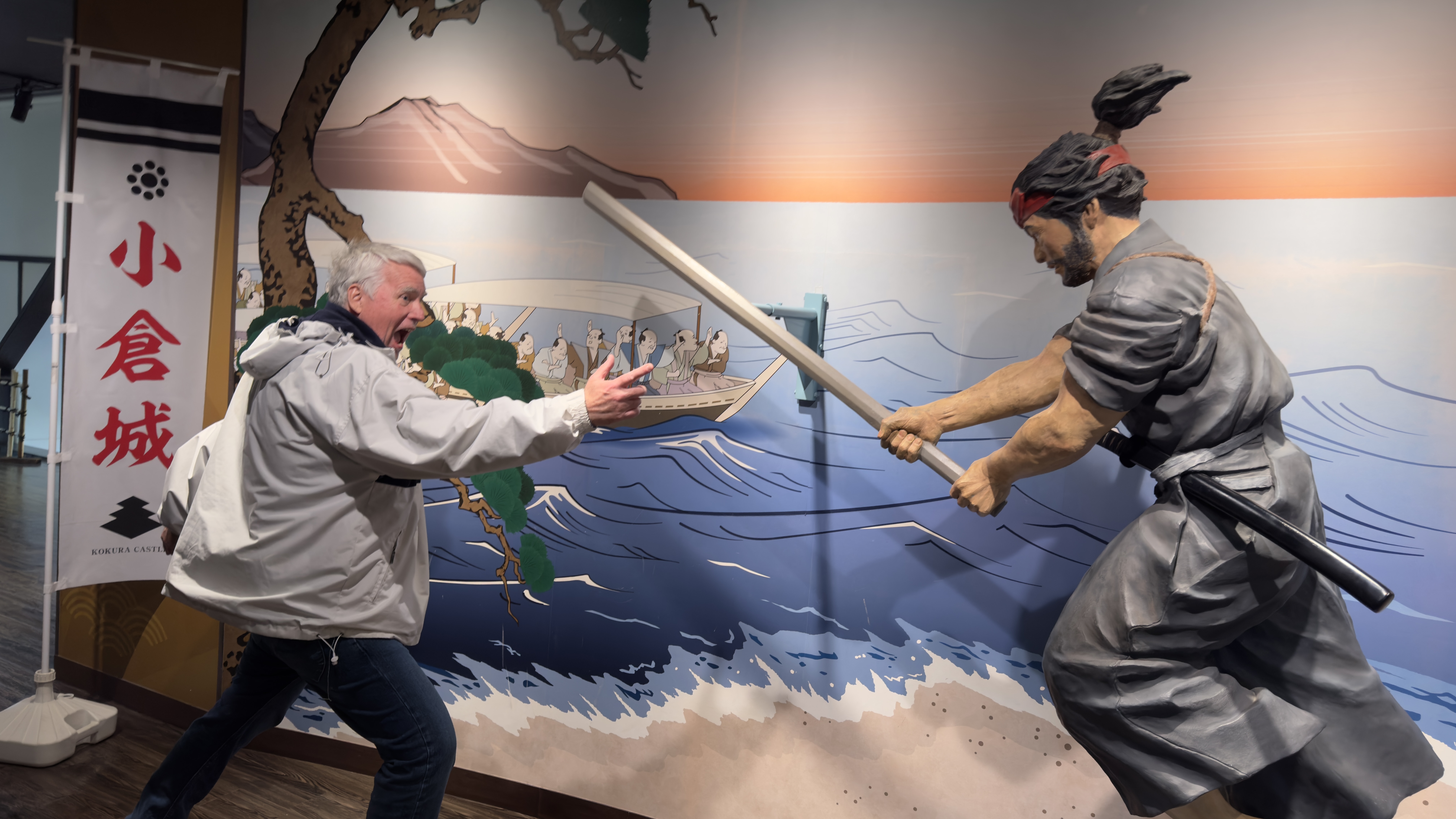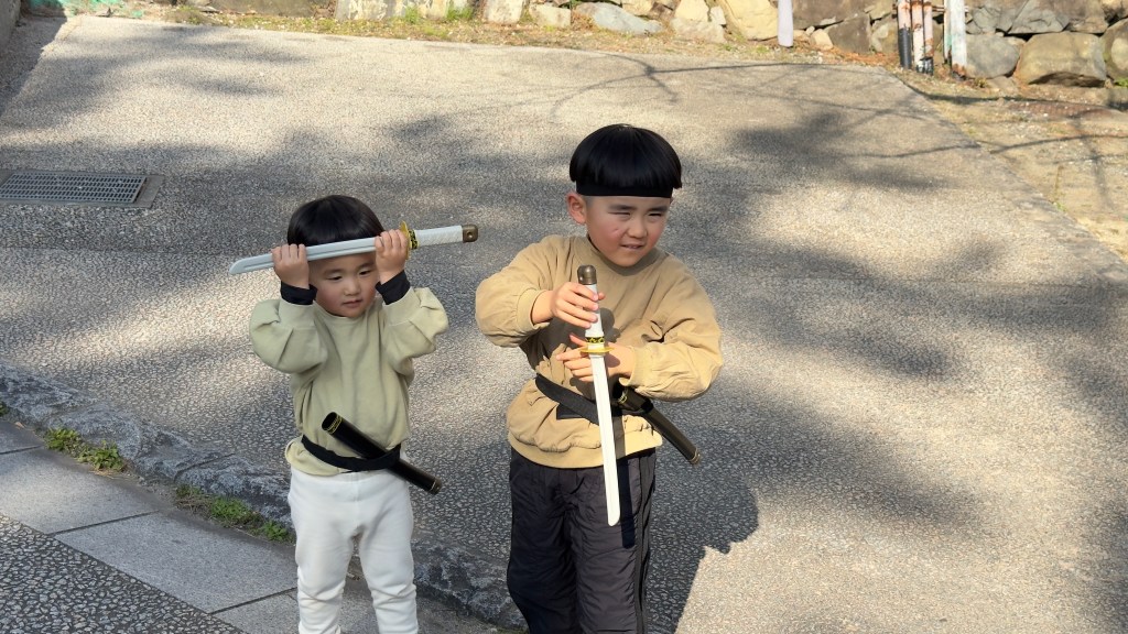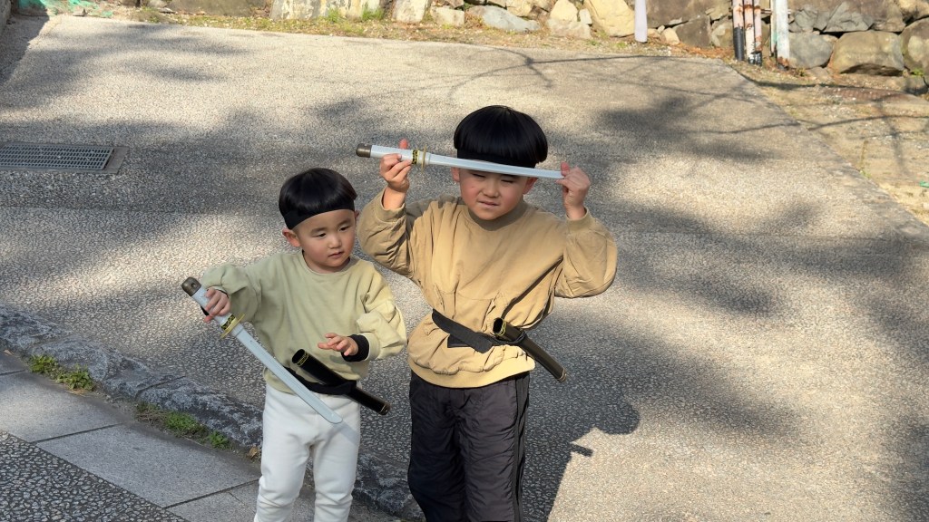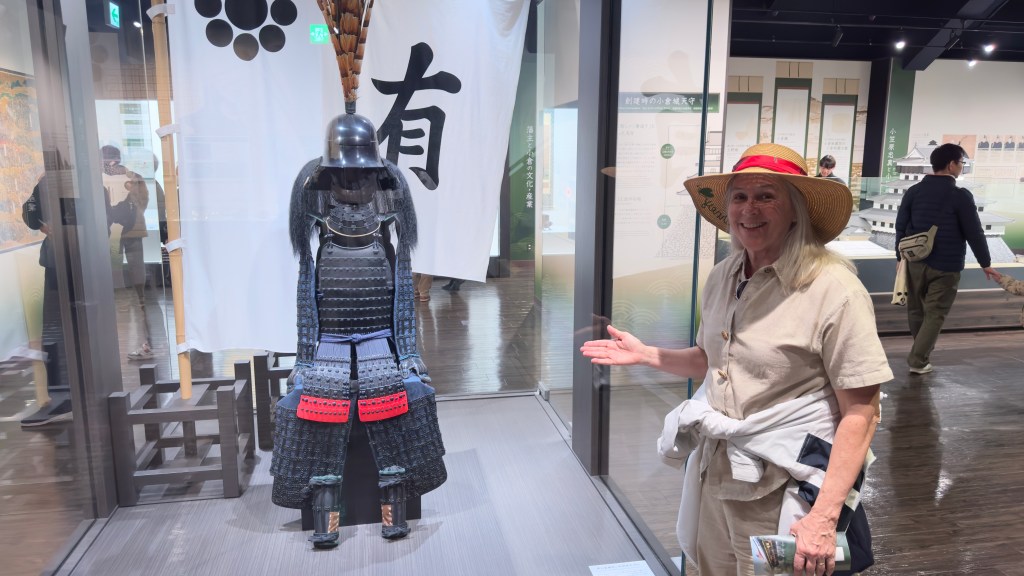 We were then served a traditional Japanese lunch and then visited the Kokura castle. This castle was built in 1607 and the scene of famous battles with famous Samurai. Papa took his chance fighting a Samurai using his fencing skills.  Nana found the real Darth Vader. We also found two boys who were training to be Samurai. Reminded us of several of our grandsons.