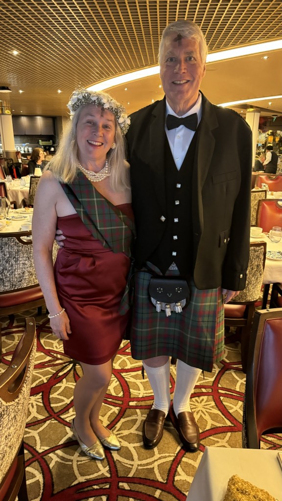 Tonight was another dressy night and Papa wore his kilt again. Lots of compliments for both Nana and Papa. We finished the movie, Oppenheimer, who’s about the building of the nuclear bomb that was dropped twice in Japan. We will be visiting Nagasaki soon where the 2nd bomb was dropped. It was a very thought provoking movie.