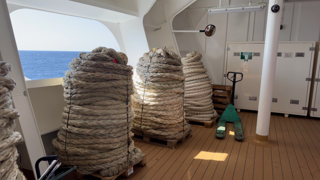 Another great sea day it is always interesting when we take a walk around the deck about what we see. two days ago the back of the deck was blocked and when we asked the person there, they said they were changing out the mooring lines for docking the ship. These were massive lines. Today when we walked around the deck, we saw them banding up the old ones. They all look fine to me, but I guess you don’t want this ship to break the lines when at the dock.