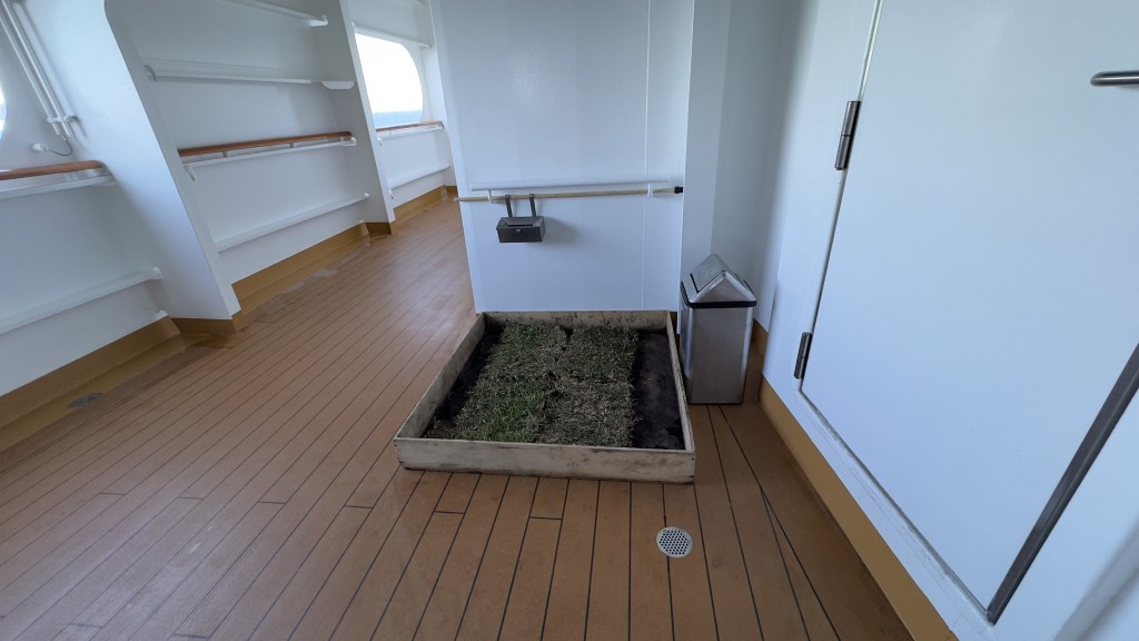 Another interesting find during our walk yesterday was the animal grass spot. Apparently this is for people that bring a dog on the ship. During our first two weeks, we saw someone with a dog and we did wonder where they did their thing but didn’t think too much about it. Now we see this down outside on deck 3, we wonder where it was during the first two weeks. Much too cold for the dog to use on deck 3 so the only thing we thought was they put this on a balcony in the dog’s room.