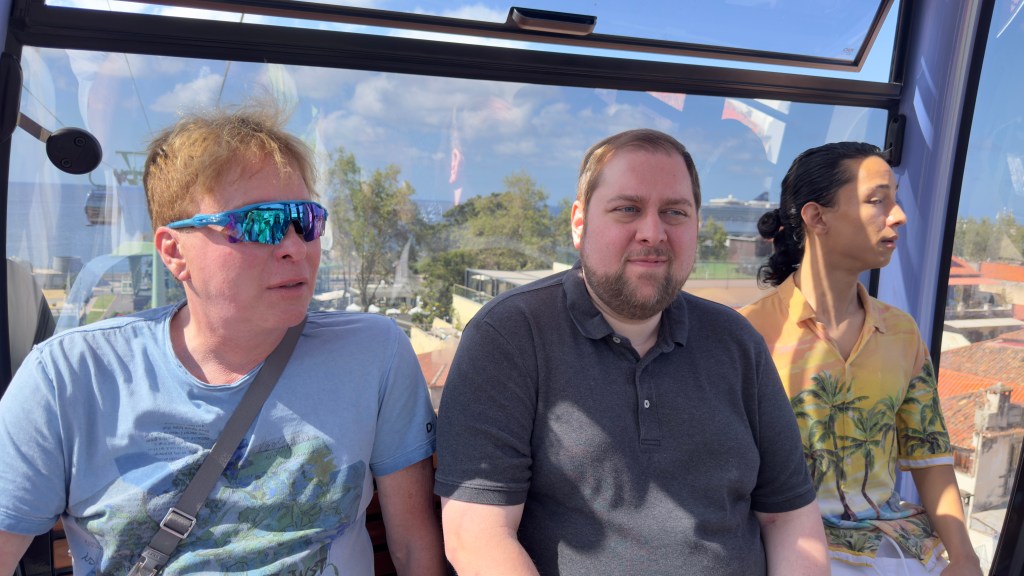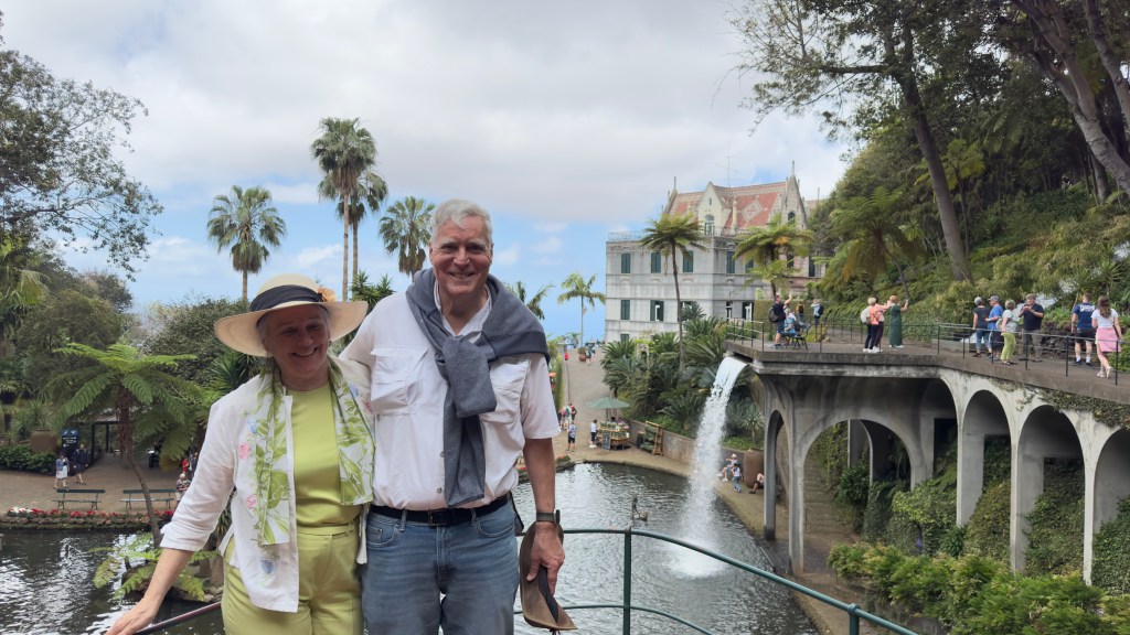 Today we arrived into Funchal (Madeira), Portugal.  A lovely island off of the coast of Africa.  There we met up with a dear friend, Jmichaele Keller.  I have known Jmichaele for over 50 years, we were in scouting trips together, went to Notre Dame together, and have visited him at many places after that.  Jmichaele recently moved to Madeira and there we met up with him, his partner Alex and  his son Josh.