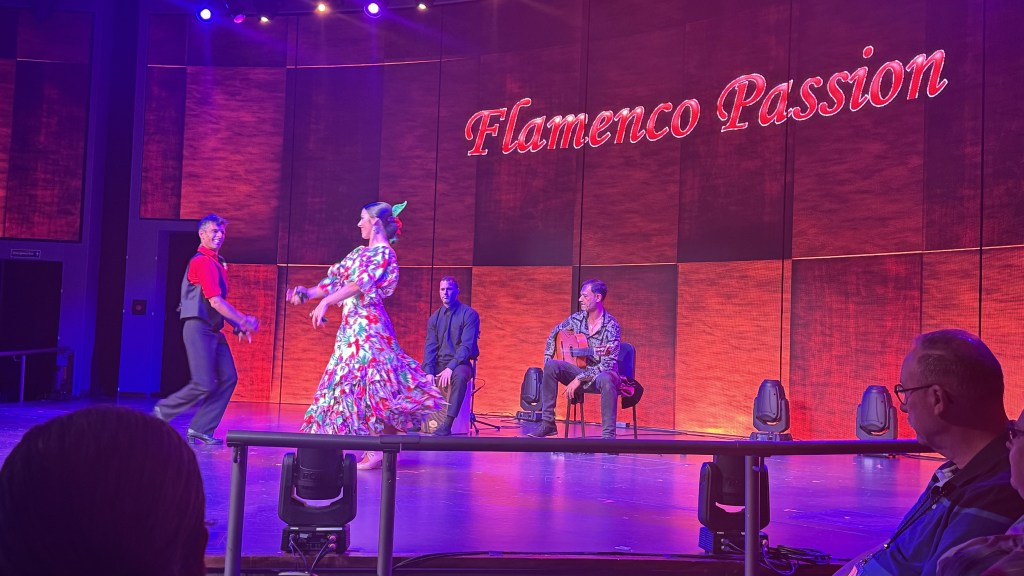 Nana and I attended a show tonight put on by locals from Tenerife. It was called the Flamenco Passion. The show featured a very talented man on the guitar as well as a couple that danced. I would have liked a lot more dancing and more dancers and less solo paying of the guitar but overall it was very enjoyable.