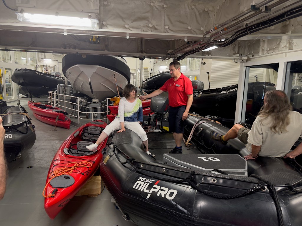 After we arrived back at the ship we had to attend a mandatory training and test for our Kayak excursions. We have two scheduled for this cruise. We have to take a rubber zodiac boat off our main ship, then get into the kayak from the zodiac. They taught us the best way to do it and also checked to make sure we could actuallly do it.