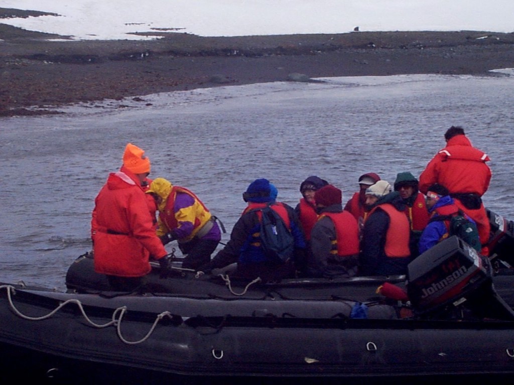 So Kayaking it was. We were the first group to go out. We boarded a zodiac from our ship that was anchored. Since we were the first group, we towed behind us 6 kayaks. The waves were pretty rough and it took us a while to get to our place where we were going to kayak. Along the way 4 of the 7 kayaks, turned over due to the waves and we had to stop, flip them over and empty them out. Our destination was a wind protected cove along the shore.