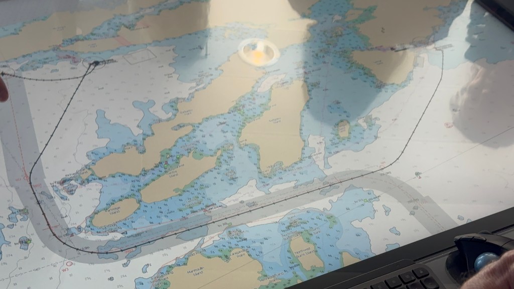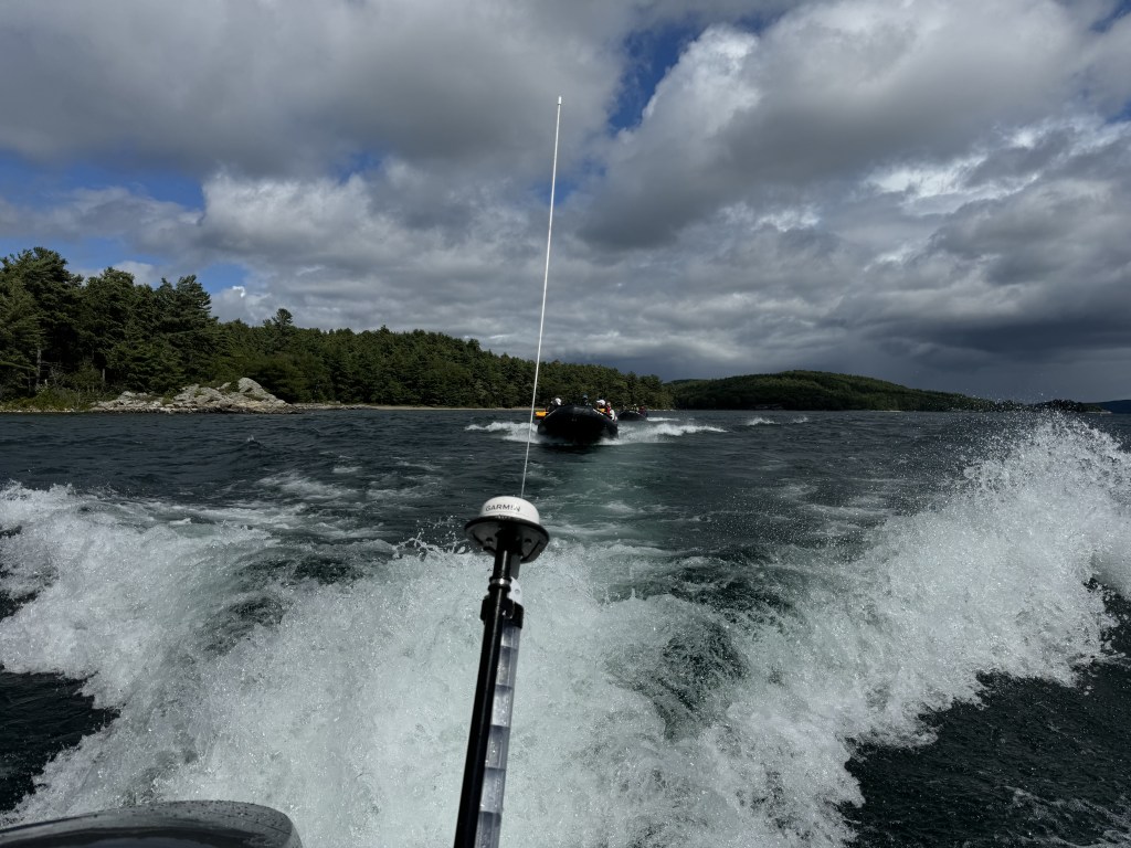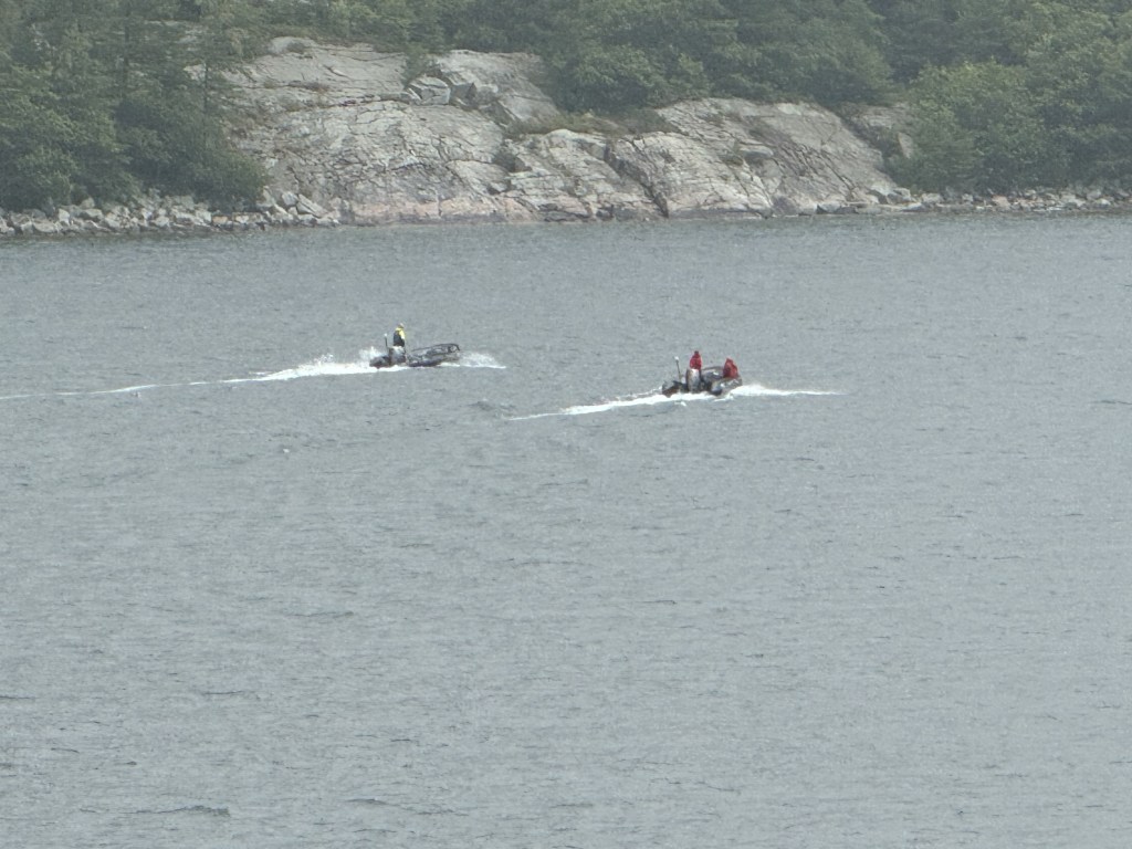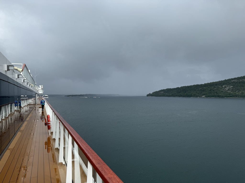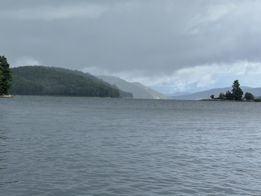 We anchored just around the corner from Killarney last night and spent the nice in a peaceful cove. This morning we woke up to a lot of wind and rain. The captain decided to move the ship to a more sheltered area and this consequently changed the schedule all around. The plan for today was a zodiac ride, a visit with an Indian tribe and a barbecue lunch off shore. All excursions were cancelled except the zodiac ride. It had rained so much, the Indian tribe coming from Killarney could not make it along with the barbecue lunch as they could only travel by boat to get here. They pushed back our zodiac ride to a little later. Nana (always the adventurous) decided she would go on the zodiac ride no matter what. Since Papa has been on the zodiac many times, he decided to stay at home and stay dry. As Nana was leaving, I started to have regrets because it was nice and sunny. Well that changed in less than 15 minutes and a large storm came racing through and hit our ship as well as the zodiacs. I was very happy to be on the dry ship, Nana though had the time of her life……. She did have to goto the spa to warm up though…… See the video below of the storm coming so quickly. It is so interesting to see the weather patterns here. The video below is a 2x speed which means that storm came in about 2 minutes. Papa loves to watch the storms develop and happen.