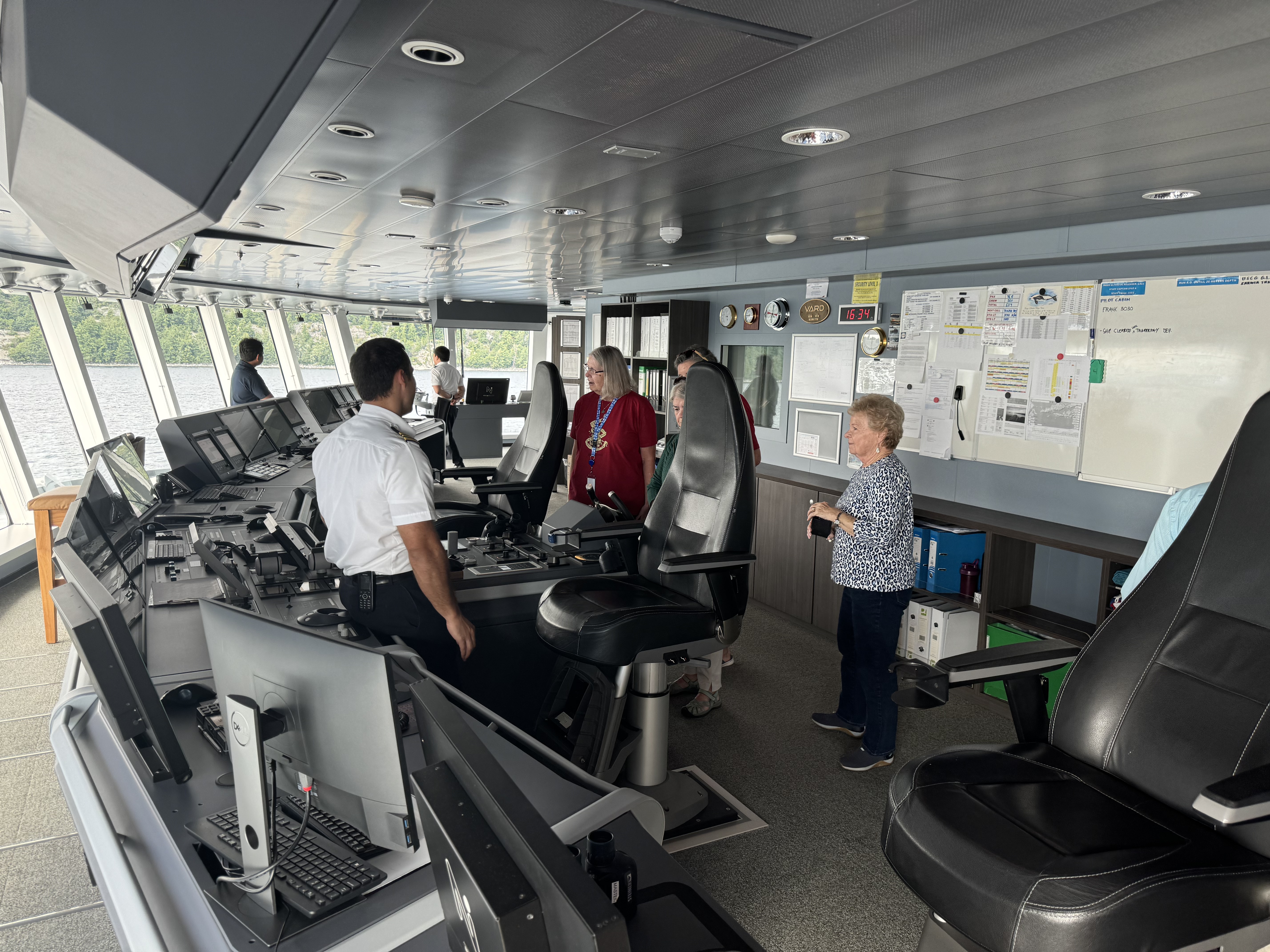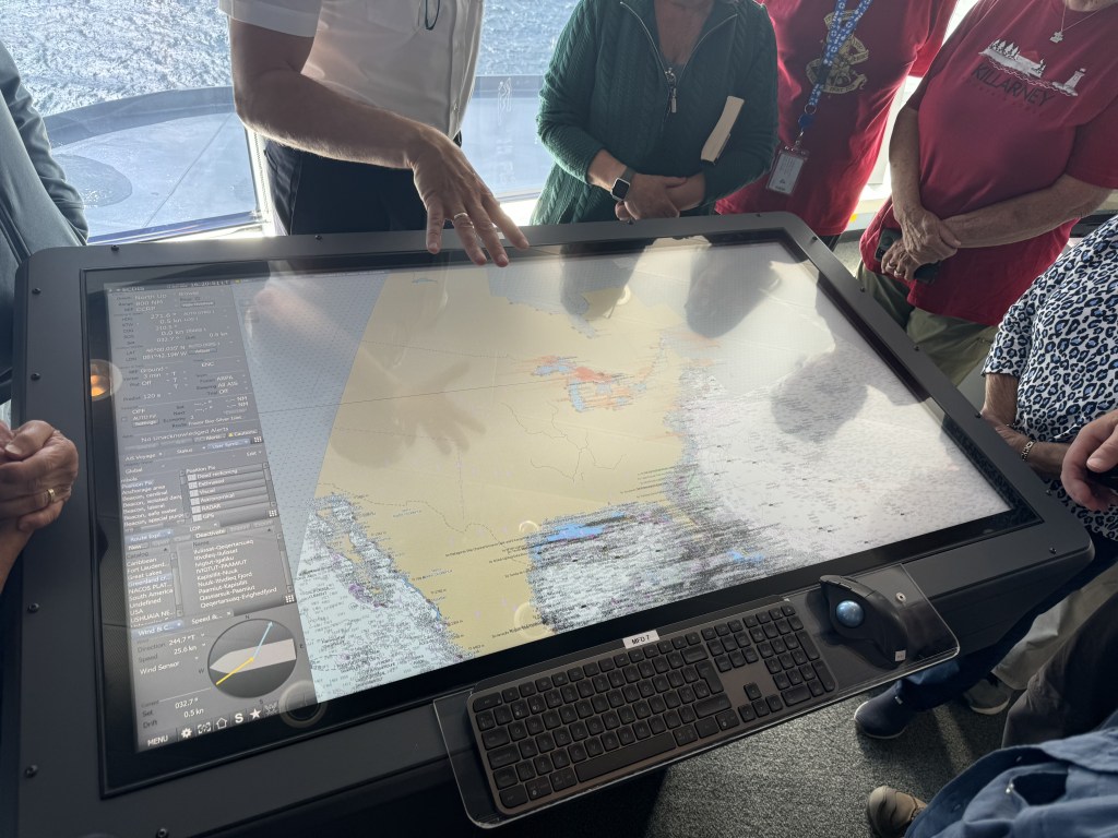This afternoon they opened up the bridge for a tour. I took some special movies for my Uncle Pat, a retired tug boat captain and very familiar with the ships that ply the Great Lakes. It is unbelievalbe how automated the ship is and how much technology is on the bridge. We are the middle of the bay and the ship is automatically adjusting itself (without any anchors) to maintain it’s exact position. The crew has positioned the ship to protect the loading and unloading doors for the zodiac away from the wind. This allows for a much smoother getting on and off the zodiacs. The ship uses pods at the stern of the boat that can be rotated 360 degrees and has 3 bow thrusters. With this 5 blades the ship can maintain any position. Below is a long video and the officers talking about the bridge and how it works.