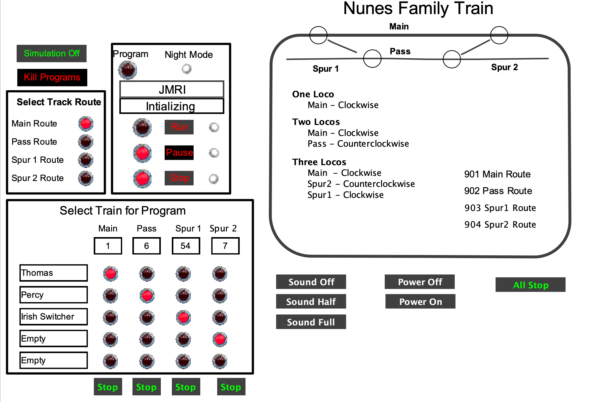 I created a One Train program, a Two Train program, and a Three Train Program.  The programs utilize JMRI (Java Model Railroad Interface).  This is an open source program that runs on Raspberry Pis, Macs, and Window computers.  I created the programs on my Mac and then transferred them to the Raspberry Pi.  I am utilizing a Raspberry Pi 4 with a 10” touchscreen.