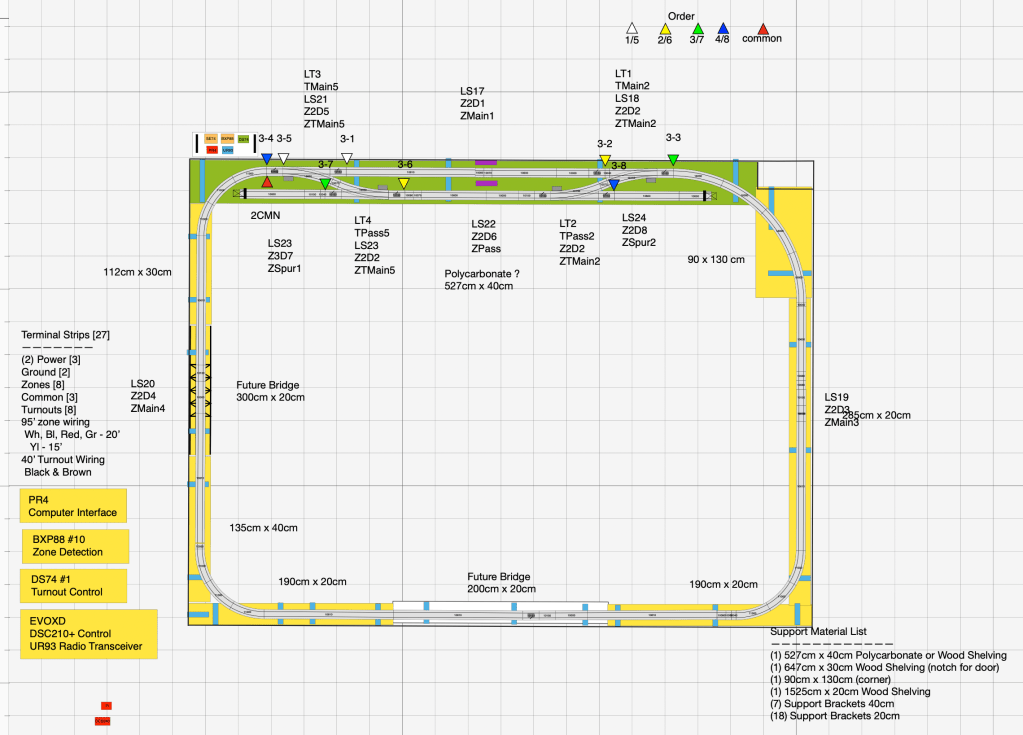 Some of my children can have an outdoor layout and some cannot.  Since I cannot visit my children for extended times and I just needed something more to do, I also built an indoor layout in my Battle Creek condo and also in my shop in Peachtree City GA.  This has allowed me to work through issues, determine features and work on the programming. I use RailModeler Pro on the Mac to design out my layouts and layout all of the blocks, wiring, and track support details.