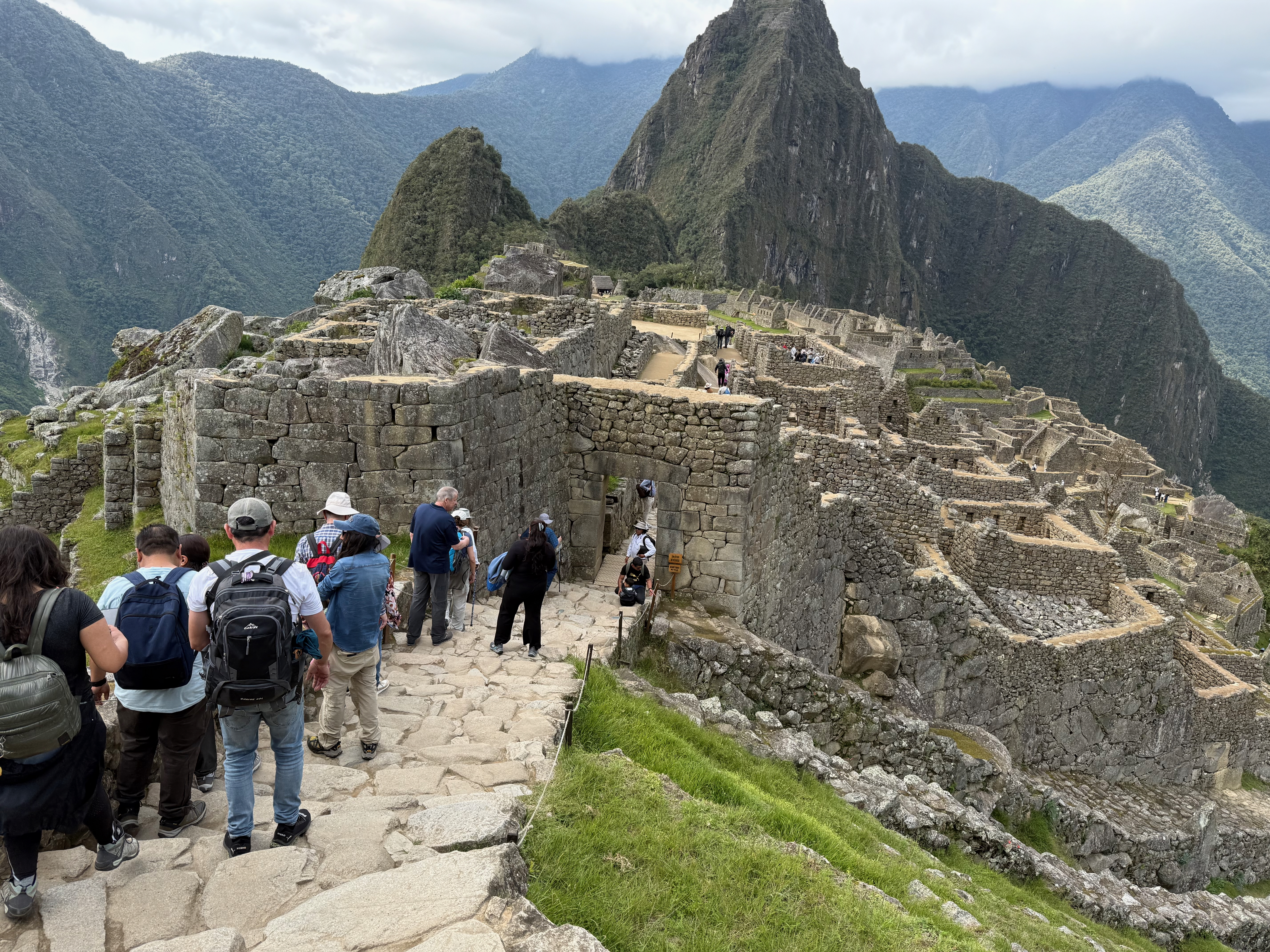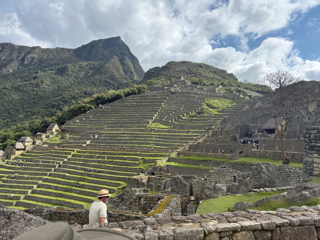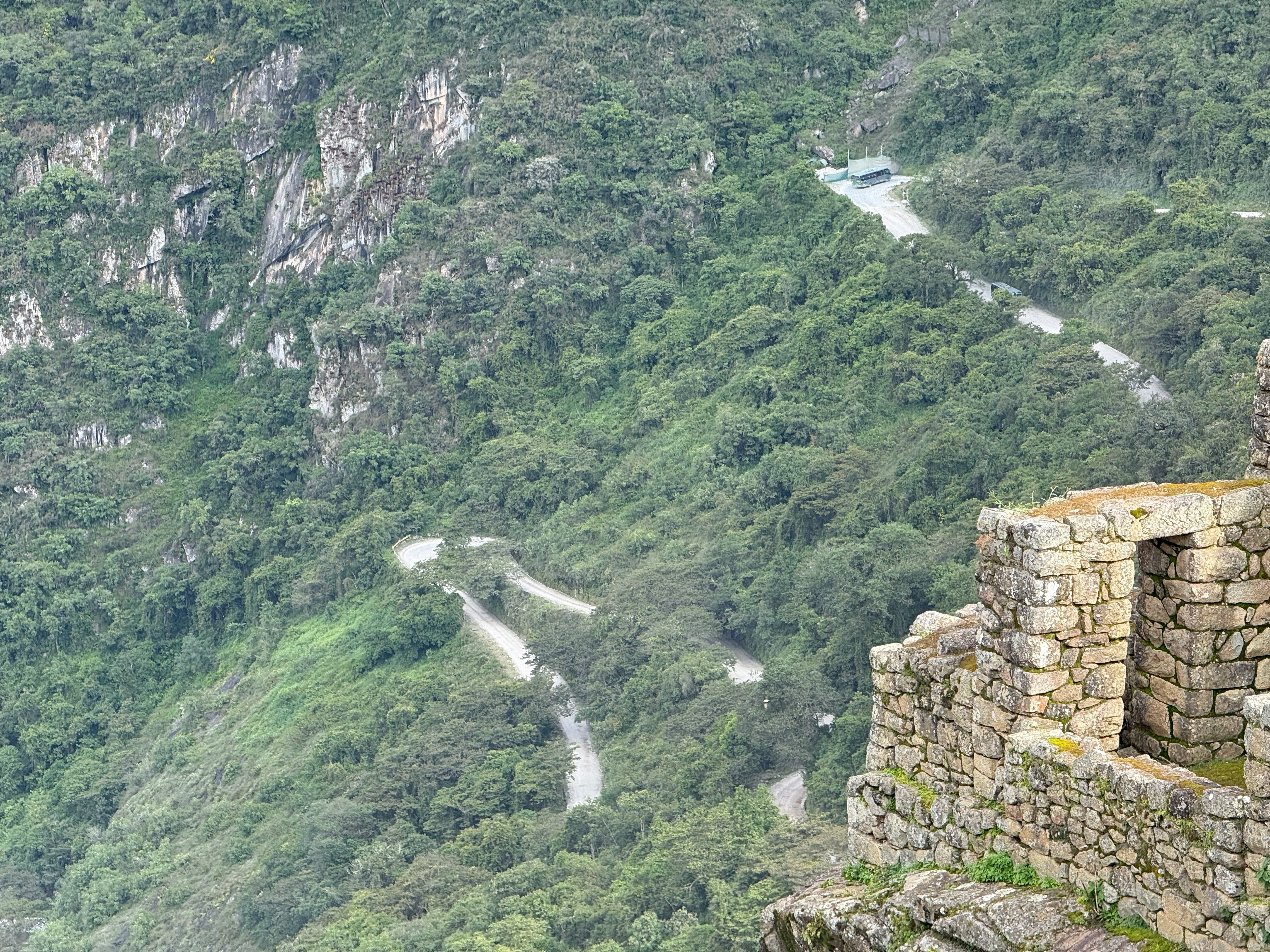 We arrived deep in the Andres mountains at the base of Machu Picchu. We took a very windy steep road via a bus up the mountain with many switchbacks, a narrow road and no guardrails to be seen. The site limits visitors to 4,000 per day and lets in 500 per hour. You had to register with your passport and we had to wait until 2:00pm before they would let us in.
