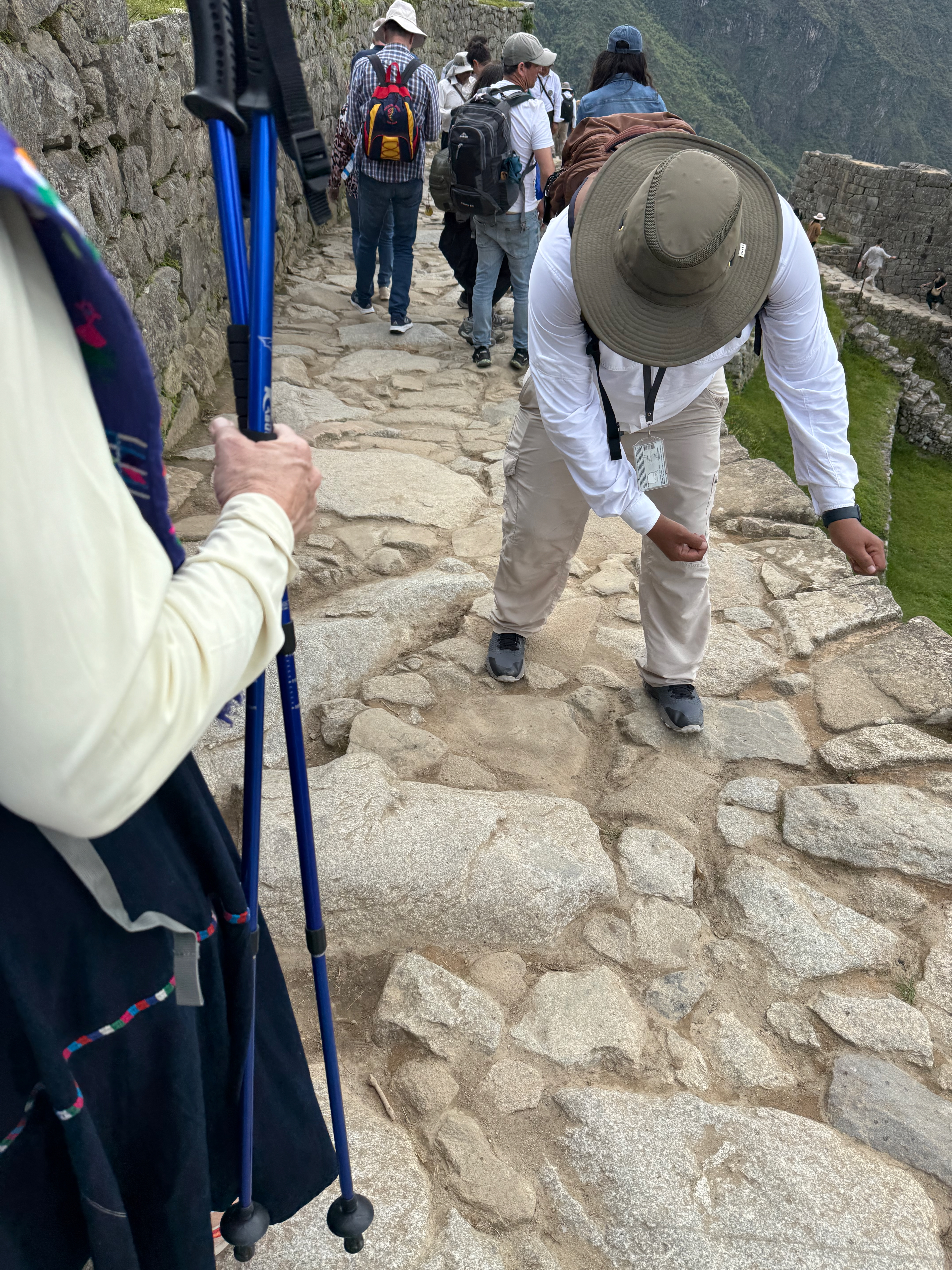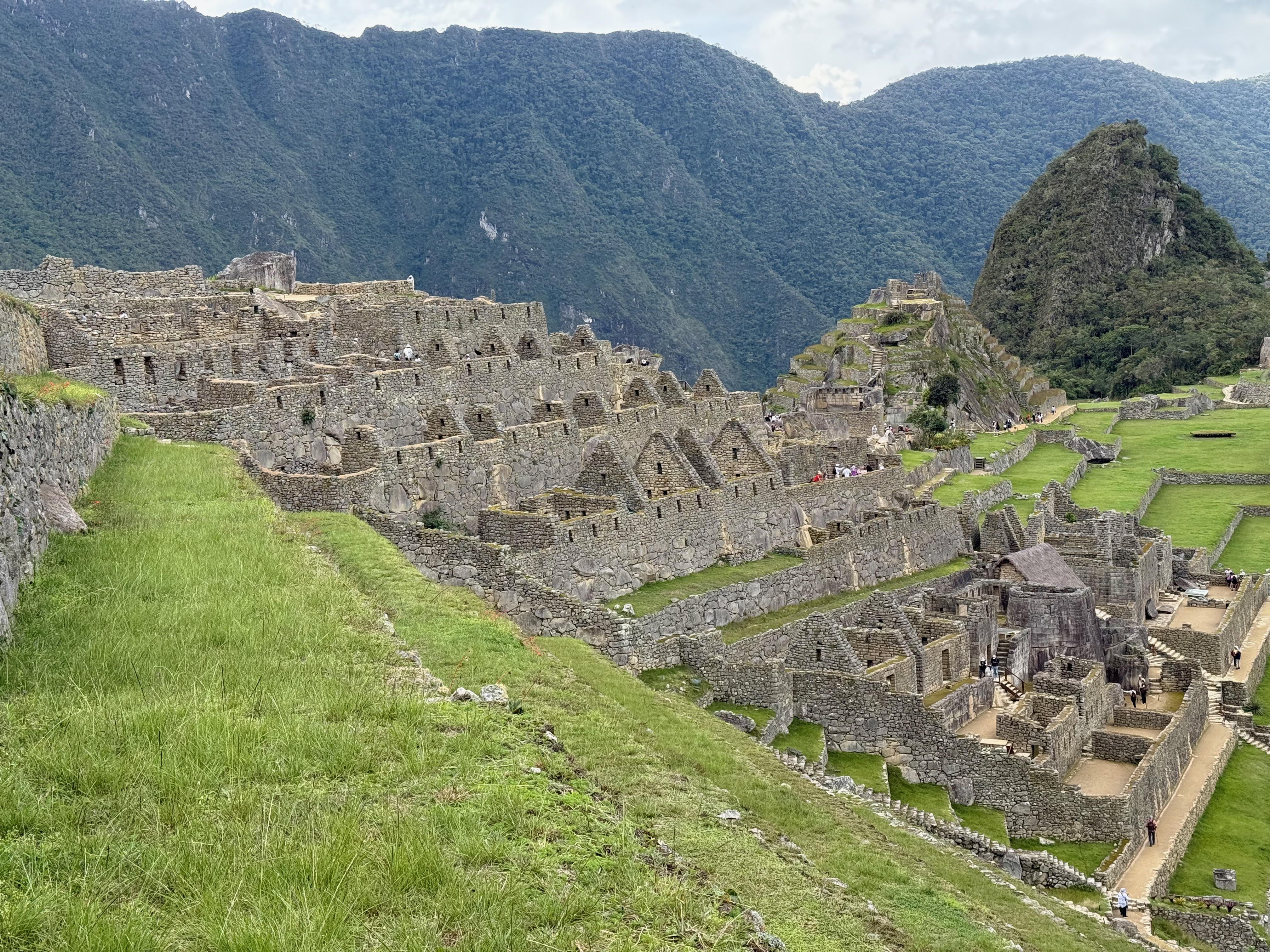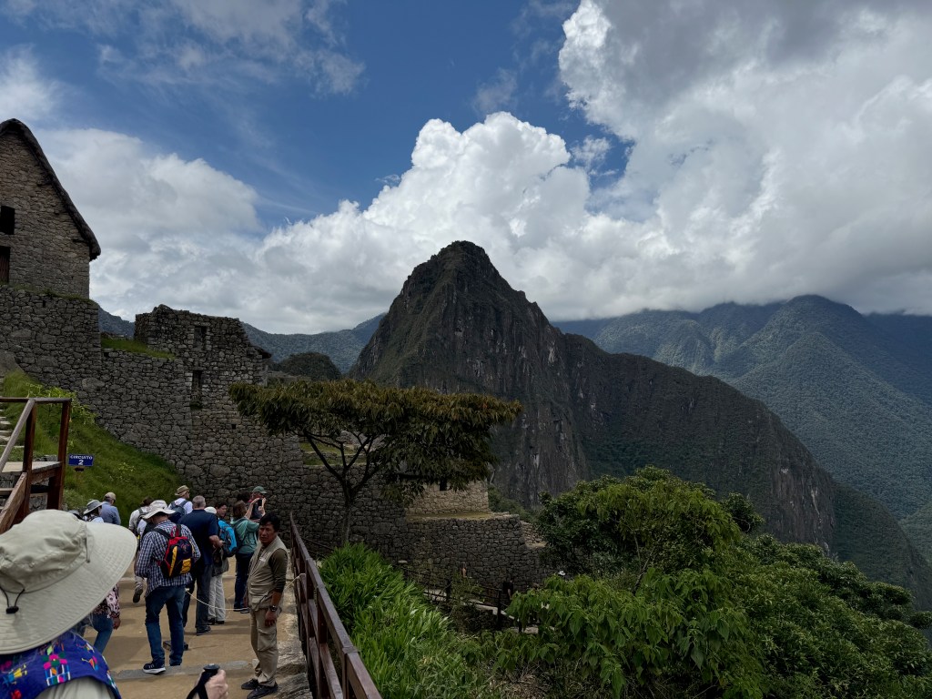We arrived deep in the Andres mountains at the base of Machu Picchu. We took a very windy steep road via a bus up the mountain with many switchbacks, a narrow road and no guardrails to be seen. The site limits visitors to 4,000 per day and lets in 500 per hour. You had to register with your passport and we had to wait until 2:00pm before they would let us in.