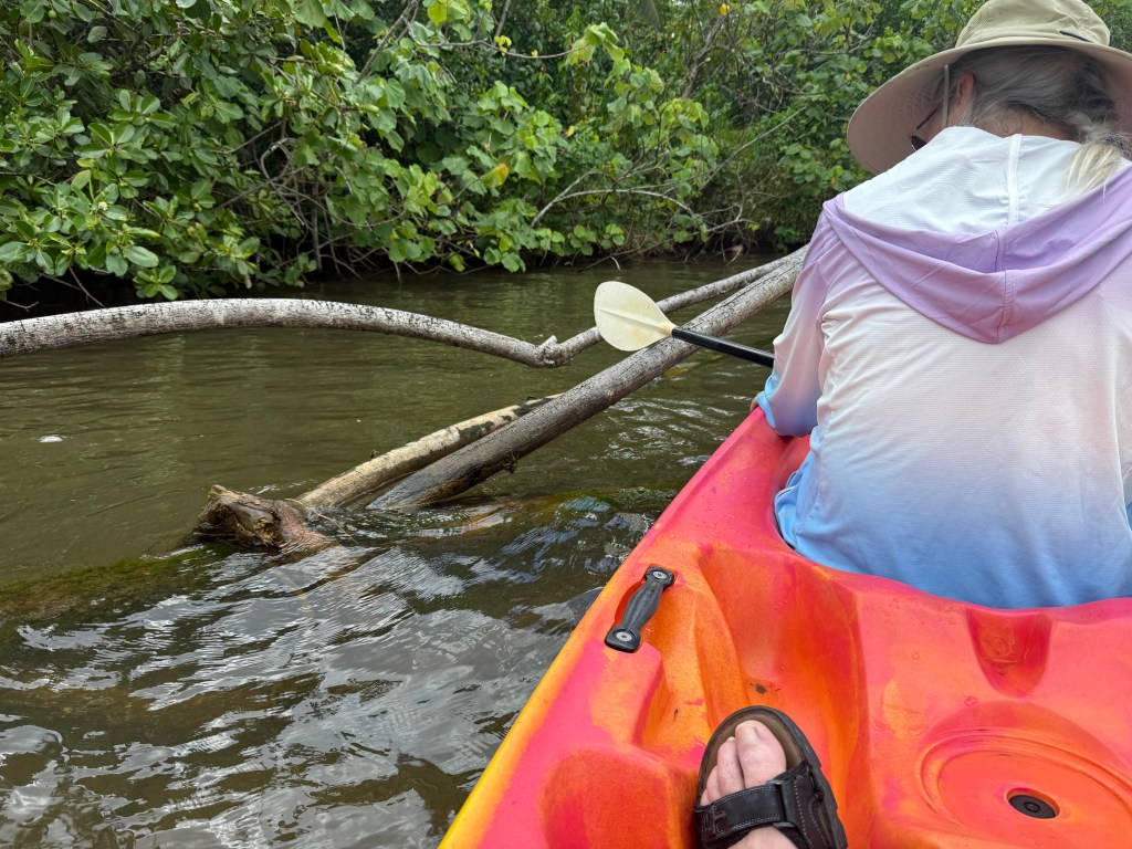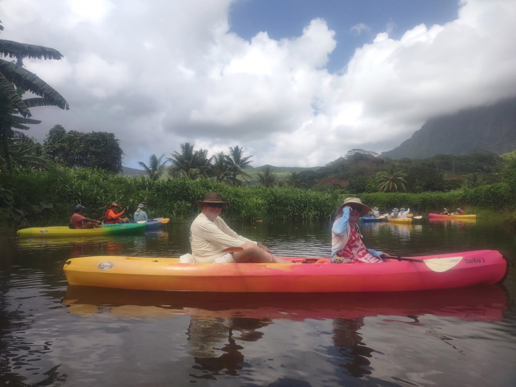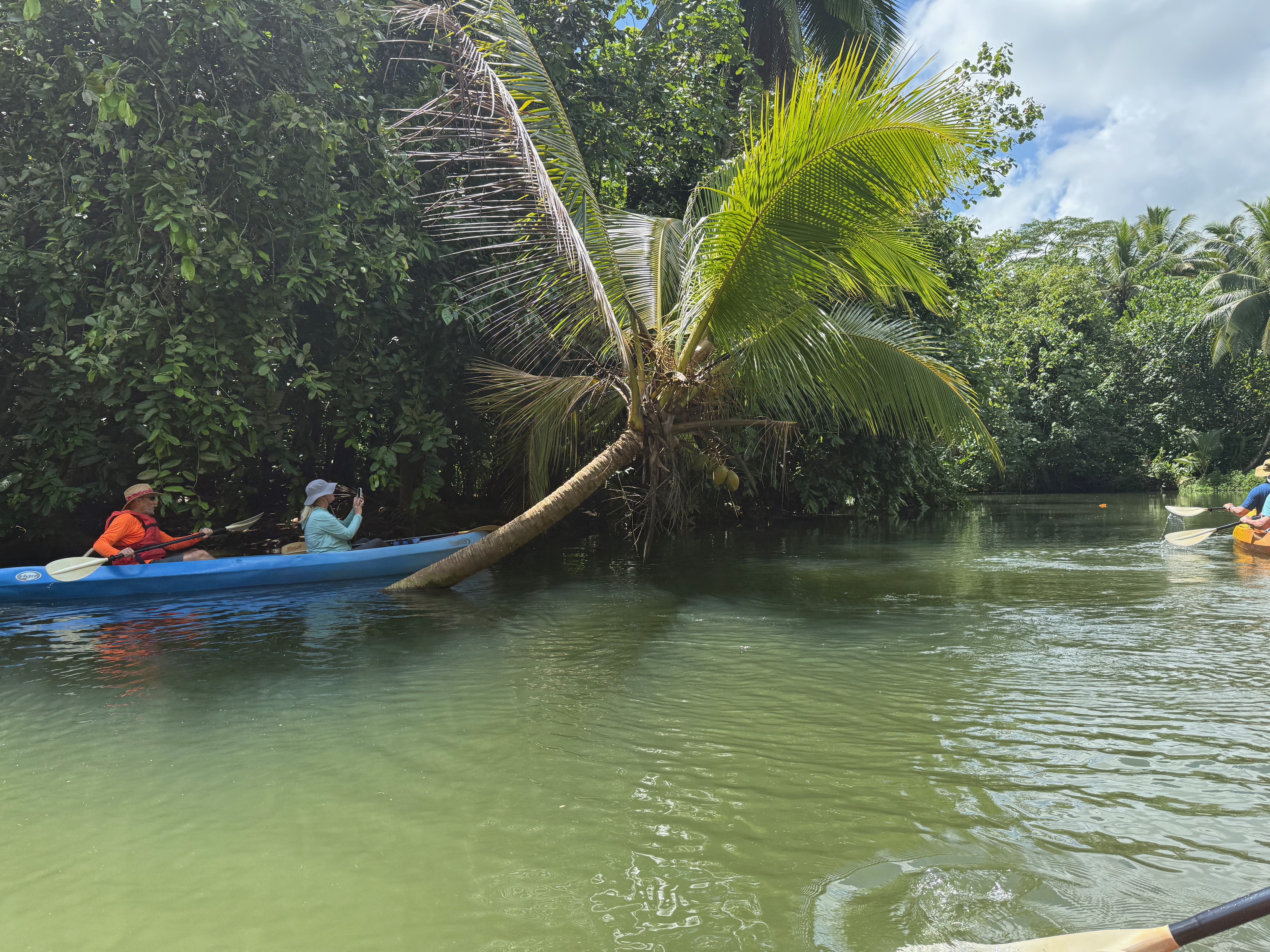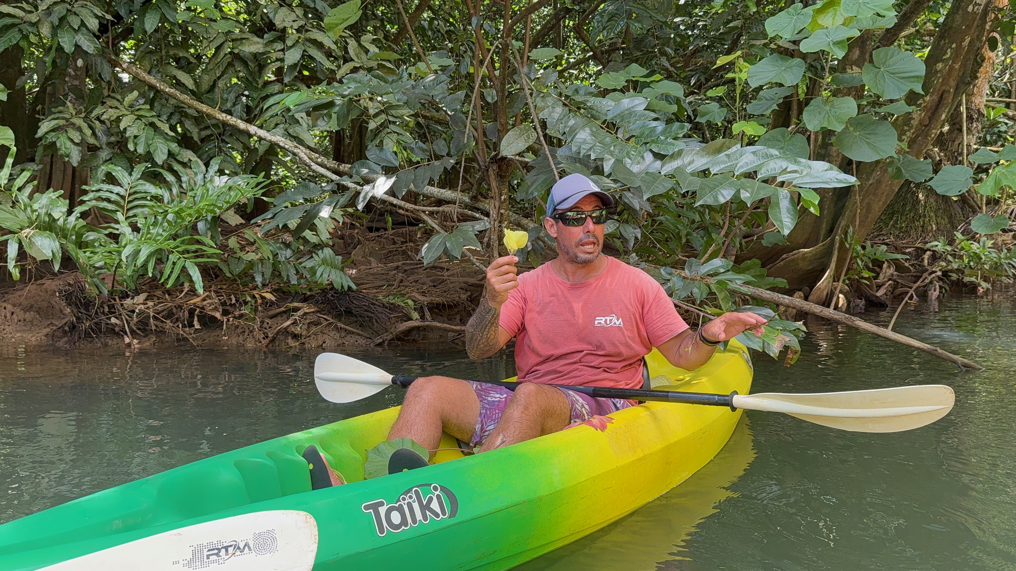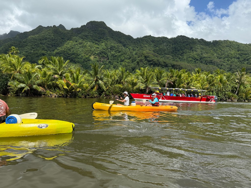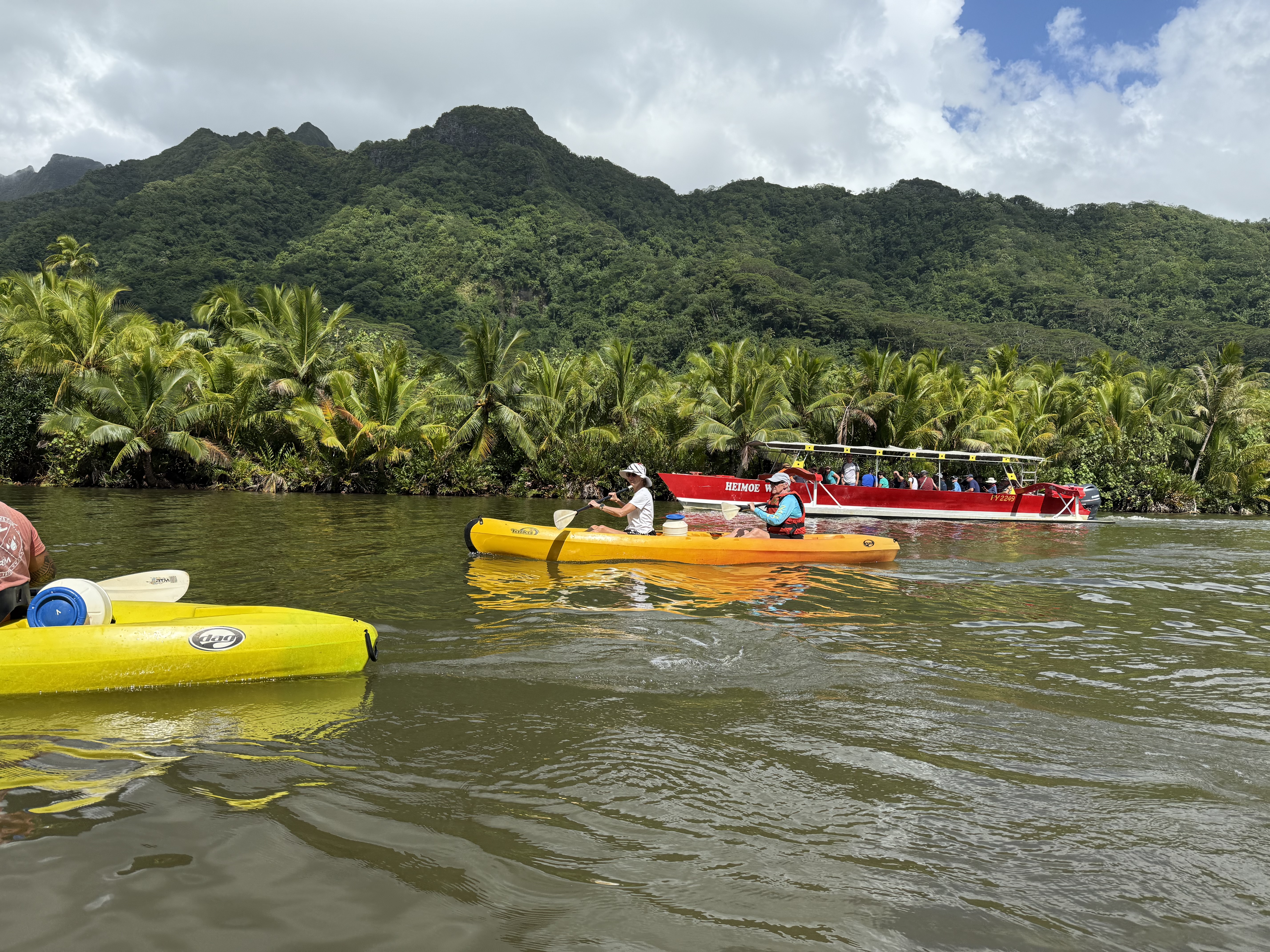 Today we arrived into Uturoa, Raitatea, another island a part of the French Polynesian Islands and very close to the previous two stops. Today was a a kayak adventure on the Faaroa River. We discovered the pristine natural beauty of Raiatea we began in the fjord-like inlet of Raiatea known as the Faaroa Gorge. We continued up the scenic Faaroa River, where the steep riverbanks are clad in lush jungle foliage and are home to a diverse range of bird species. Wild hibiscus (purau) trees are found along the sheer cliffs at the edge of the rain forest. Nana enjoyed learning about the trees, the flowers and the animals we saw along our trip. Our guide was worried about us paddling under coconut trees. Apparently there were 2 people killed recently from falling coconuts. We also had to avoid bee and wasp nests but our guide was there to point them out and no issues avoiding them.