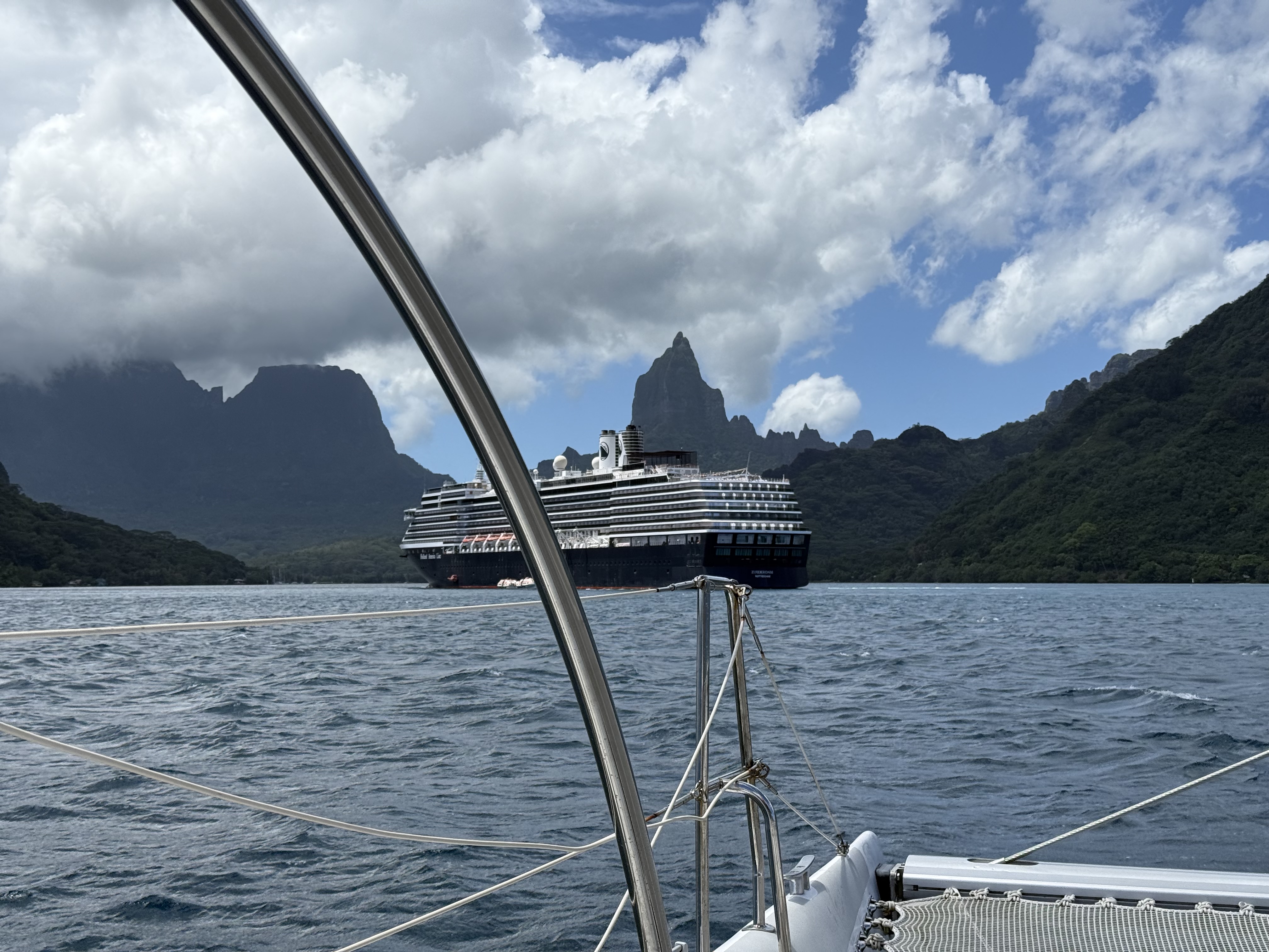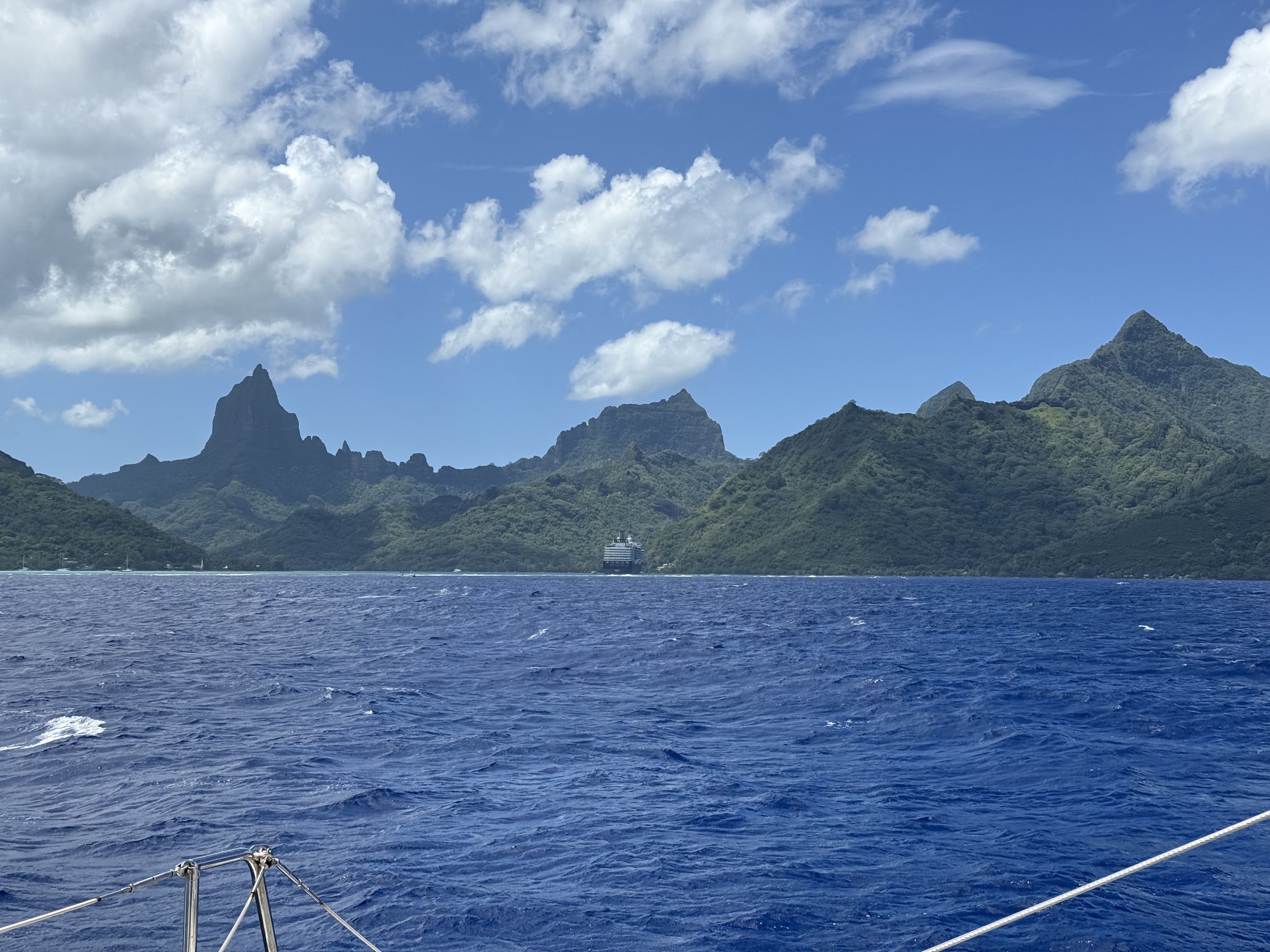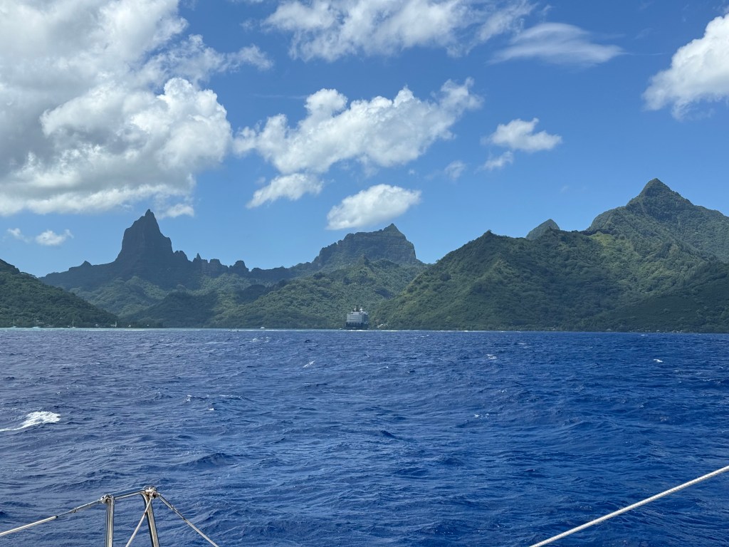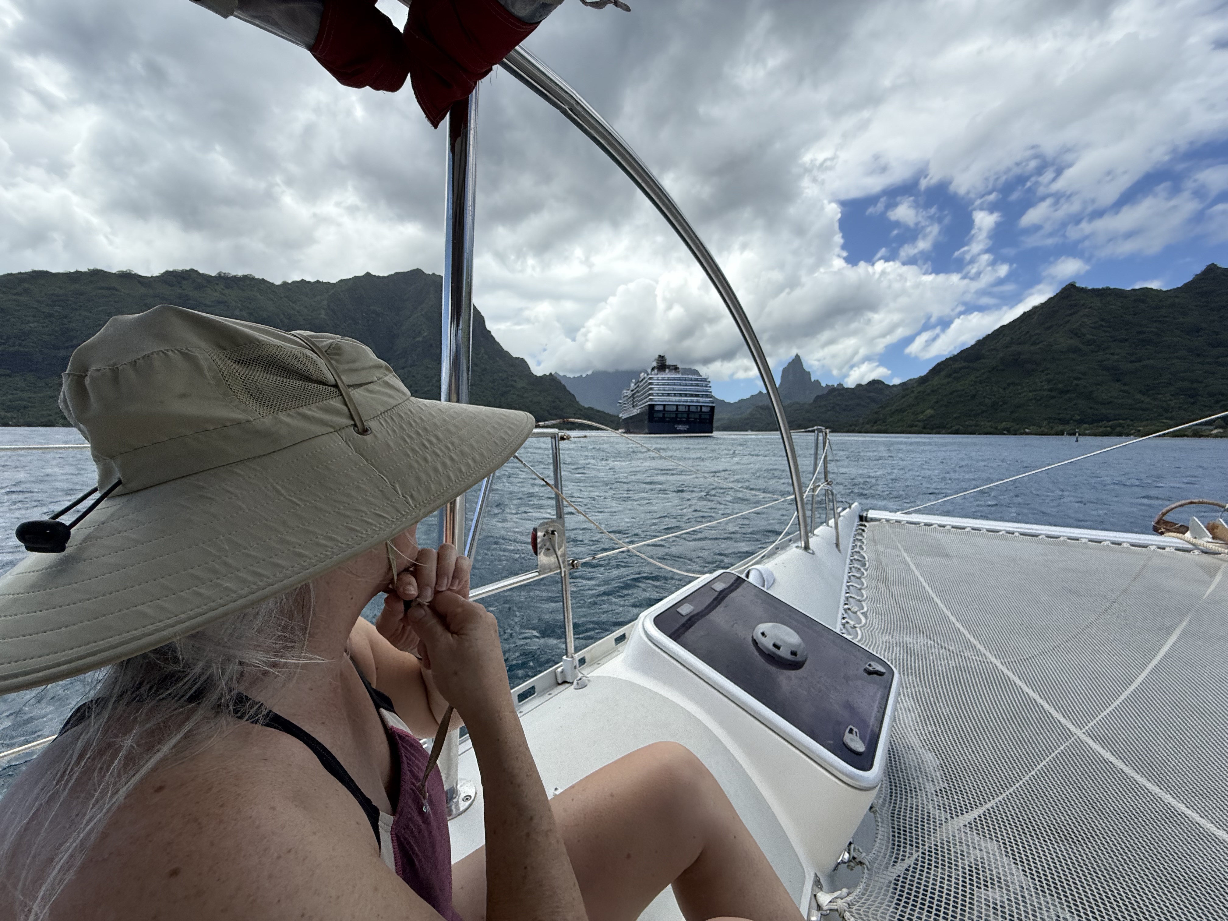 Yesterday we head to Bahia d Opunoha, Moorea We took a catamaran sail on a leisurely two-hour cruise along Tahiti’s coastline. We were on a 53’ catamaran and the wind was 25-30 knots. Papa was glad he was not sailing in his J24 with it that windy. Nana (and Papa) did Nana’s favorite activity snorkeling and swimming. Nothing like snorkeling off of a catamaran sailboat. The waters were clear, warm (84 degrees) but a little choppy. A very majestic island. During our sailboat ride (under sails) we circled our ship, it was a great way to see the ship from the water.