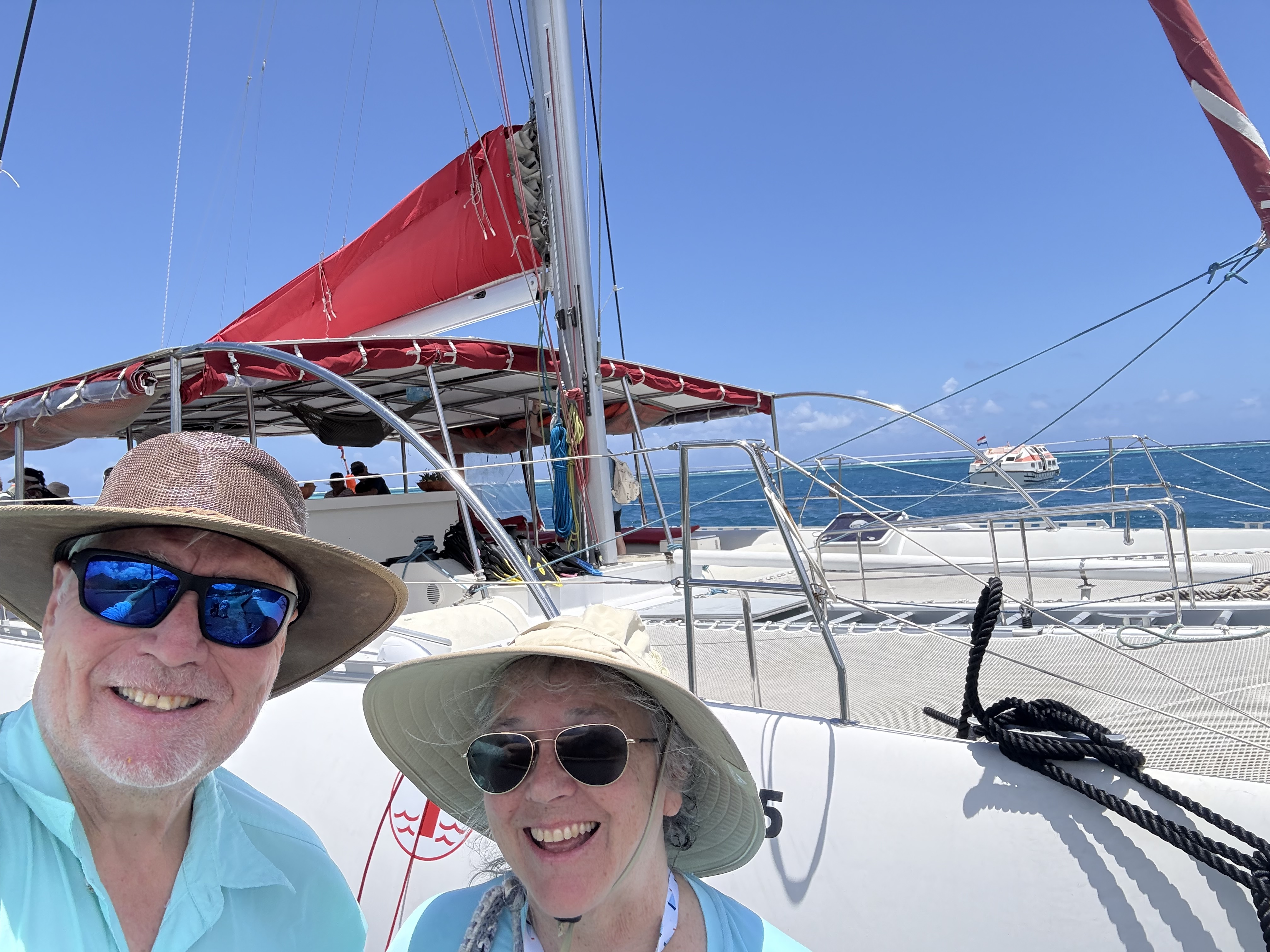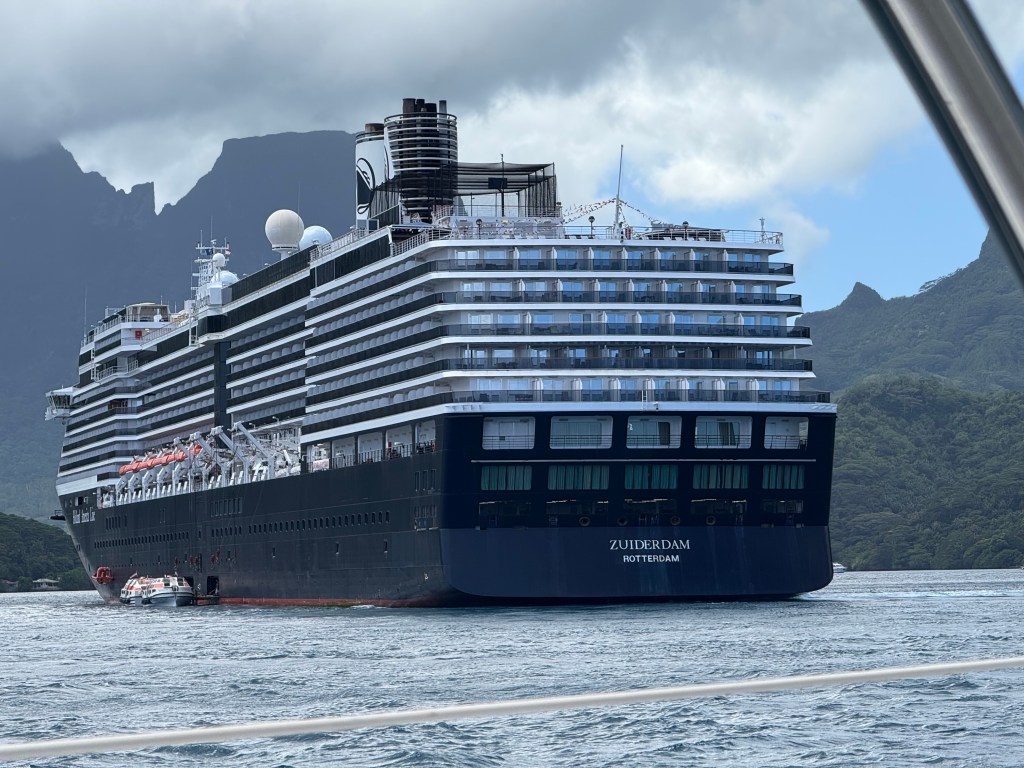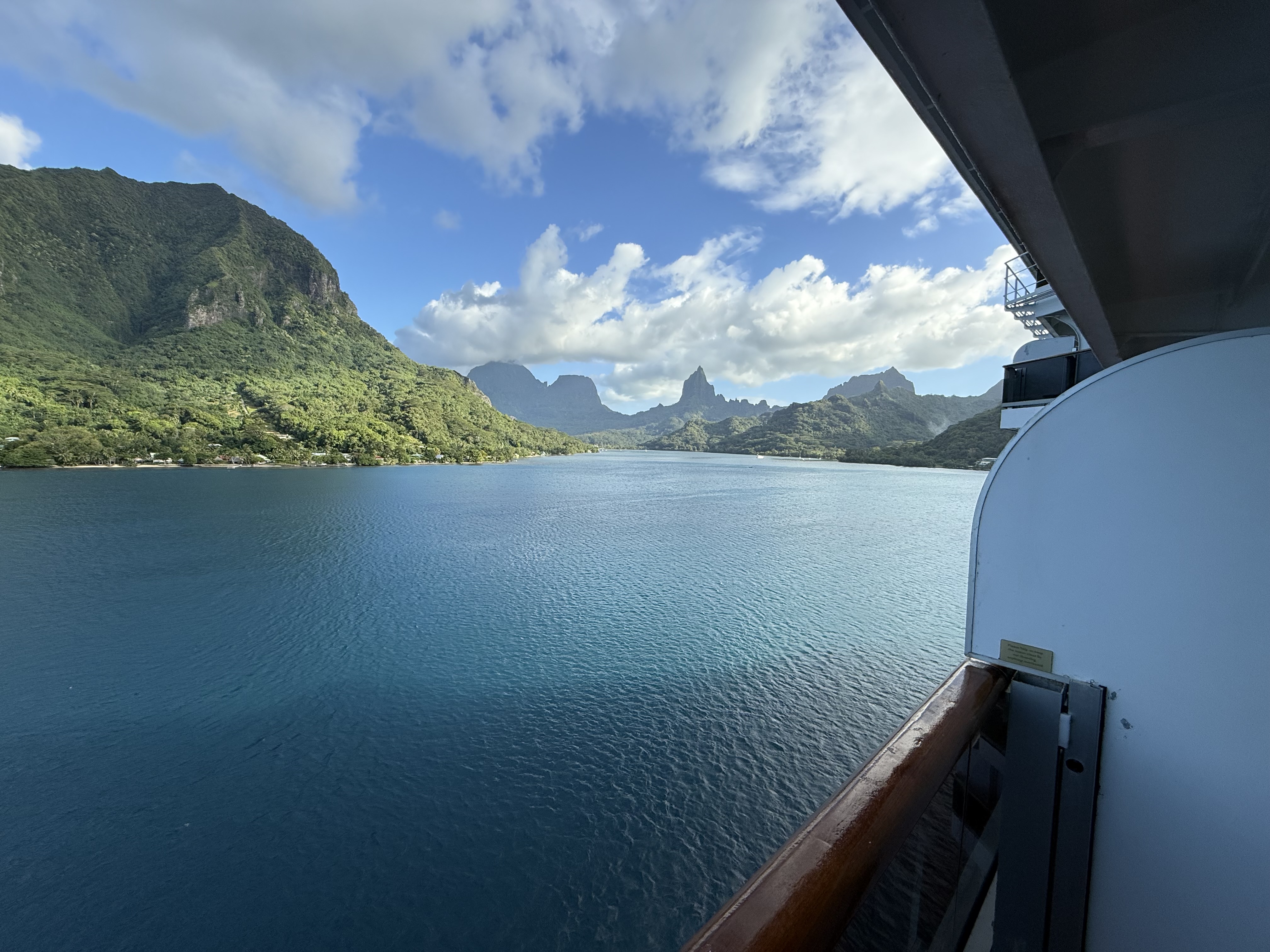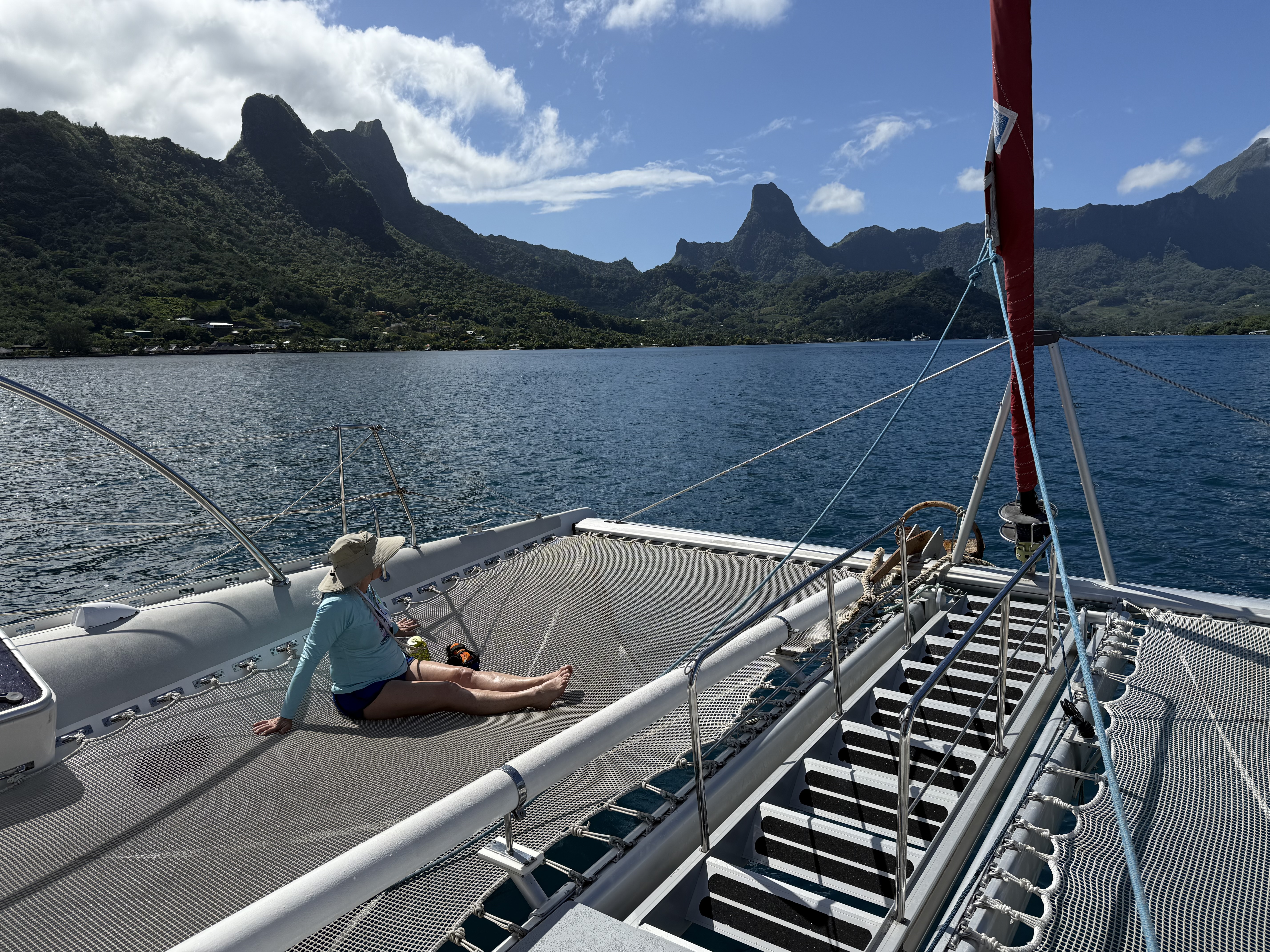 Yesterday we head to Bahia d Opunoha, Moorea We took a catamaran sail on a leisurely two-hour cruise along Tahiti’s coastline. We were on a 53’ catamaran and the wind was 25-30 knots. Papa was glad he was not sailing in his J24 with it that windy. Nana (and Papa) did Nana’s favorite activity snorkeling and swimming. Nothing like snorkeling off of a catamaran sailboat. The waters were clear, warm (84 degrees) but a little choppy. A very majestic island. During our sailboat ride (under sails) we circled our ship, it was a great way to see the ship from the water.