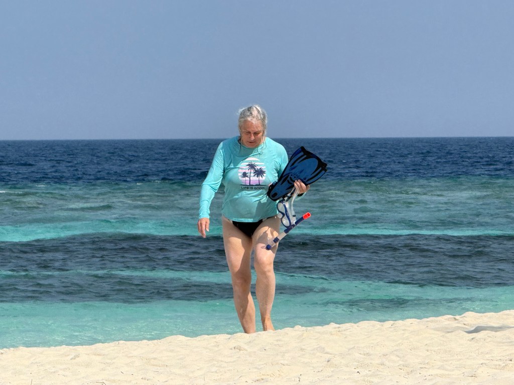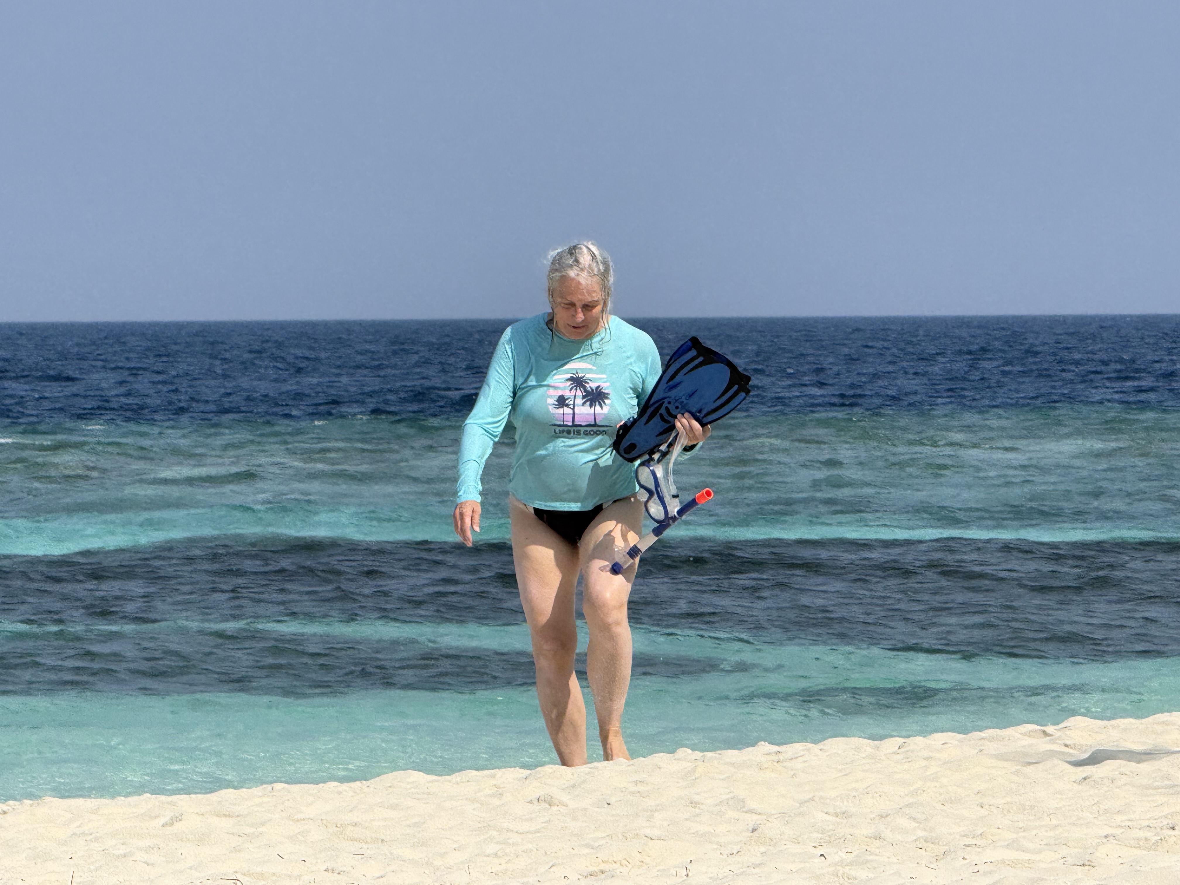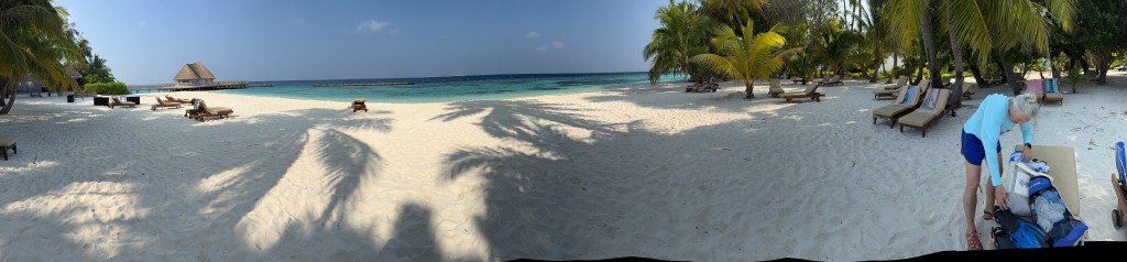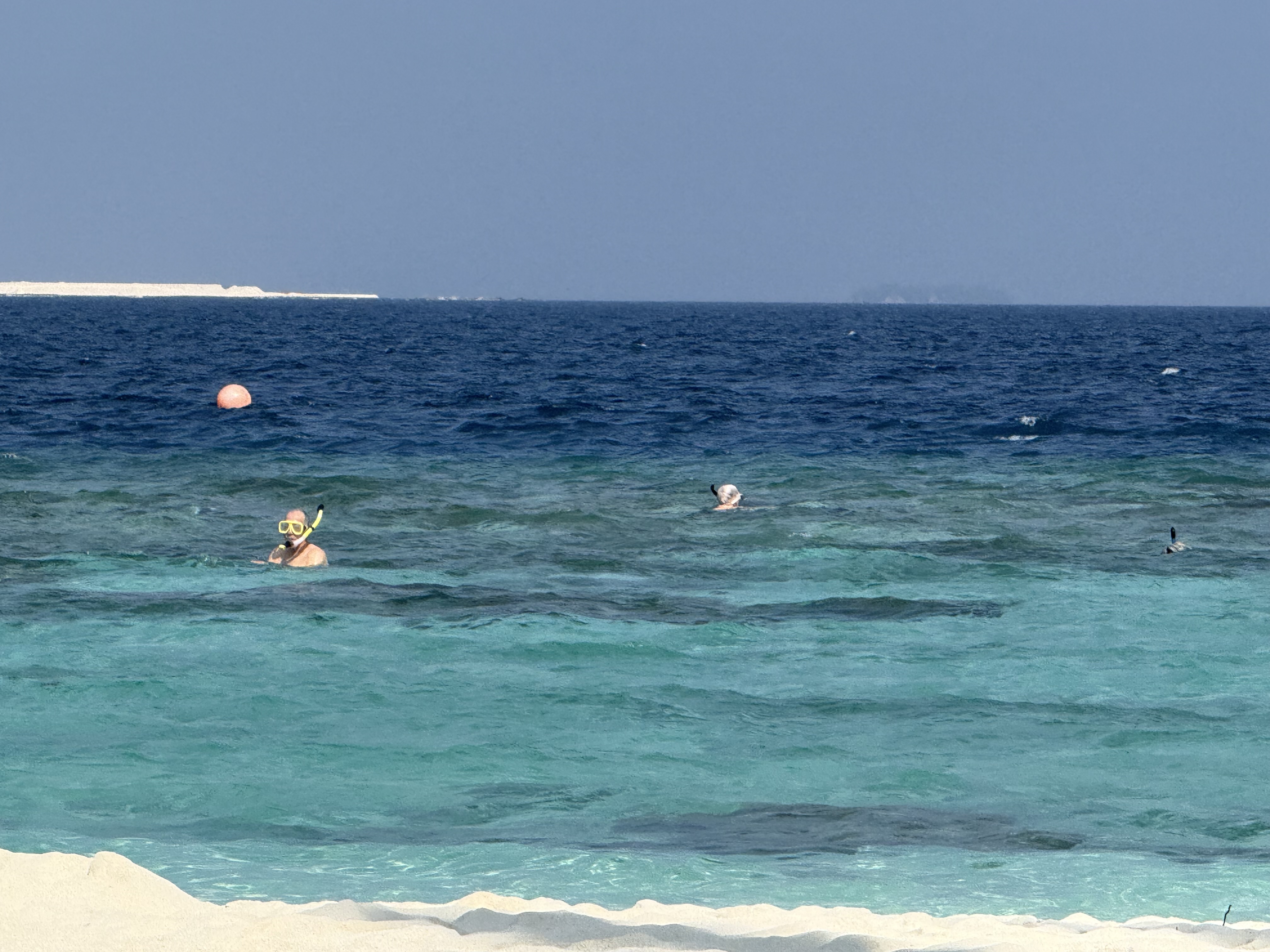 We then began to explore this small island hideaway, swathed in lush vegetation, that embodies the essence of the Maldives, with coconut palms and tropical greenery surrounded by the resort’s famed white sand beach and crystal clear water. Turquoise merges with sapphire as the lagoon meets the ocean at the edge of the reef. It’s a unique experience and the architecture celebrates and preserves the beauty of the surrounding nature. We explored the beach around the resort and went snorkeling which is ideal for snorkeling. Nana loves her snorkeling.