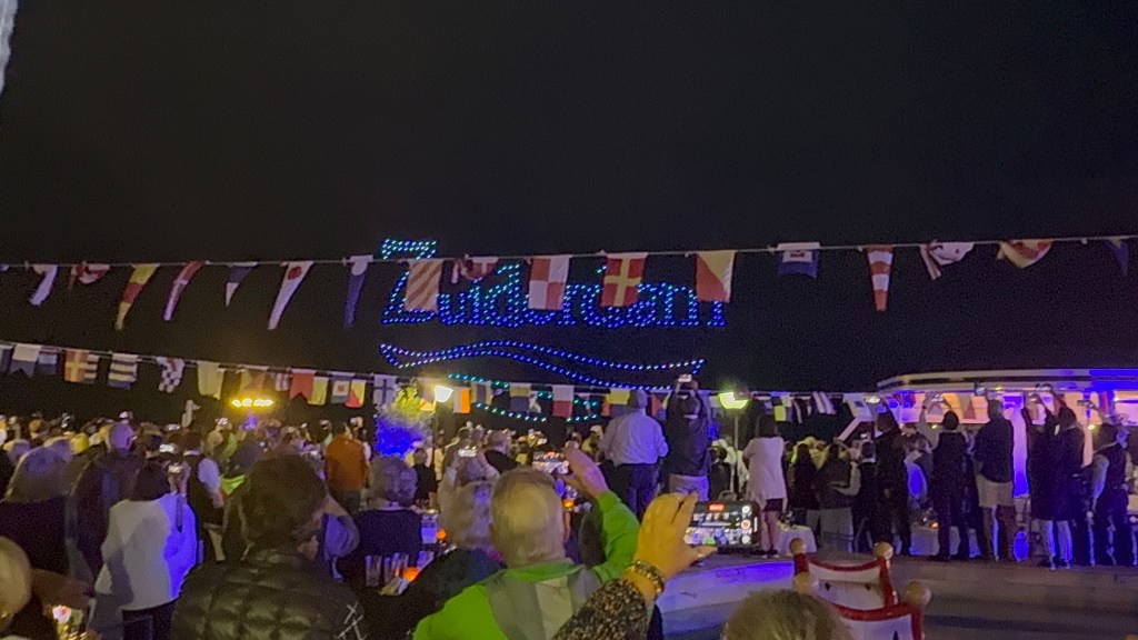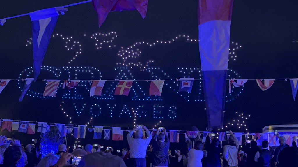Last night we had dueling parties with the Volundam. With the two ships stern to stern we had party on our back deck and they had a party on their back deck and we could see them and they could see us. I couldn’t believe how crowded the two decks were. We had food and free drinks all night long. After the sunset we were entertained by a drone show that was spectacular.