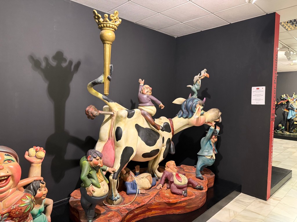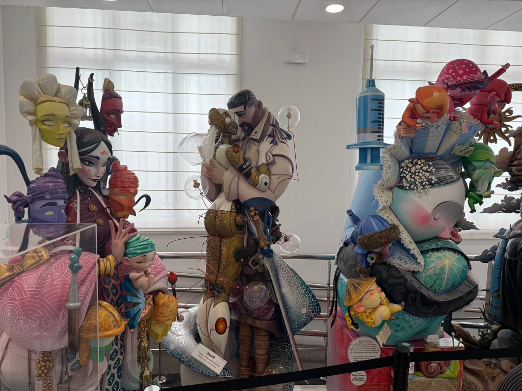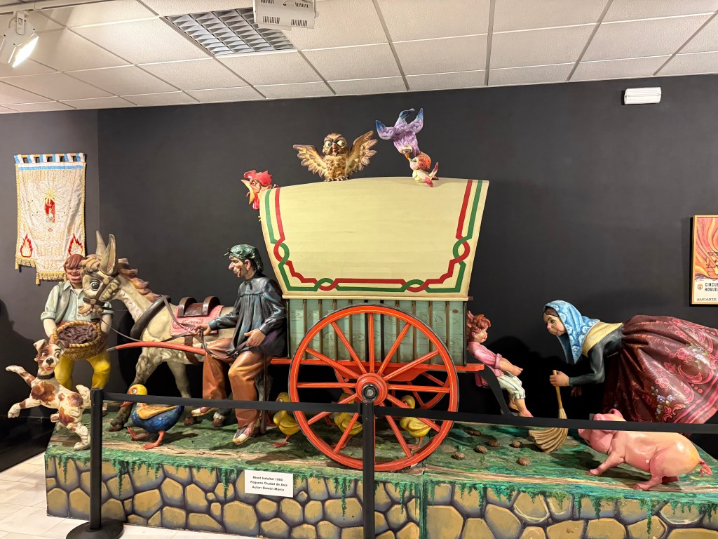 We stepped inside the Museo de Fogueres, which features photos and sculptures of plaster and papier mâché, depicting the different periods of the region’s history. Every June, Alicante bursts into flame and celebration during Las Hogueras de San Juan — the Night of the Bonfires. Originally tied to the summer solstice, the festival has evolved into a spectacular event where enormous, colorful sculptures called hogueras fill the streets. Made of wood, cardboard, and papier-mâché, these towering works of art are often satirical, poking fun at politics, celebrities, or local life. On the night of June 24th, after days of music and parades, the sculptures are set ablaze, lighting up the sky in a fiery dance of art and destruction. Fireworks crackle, bands play, and the spirit of Alicante shines brightest in the glow of the bonfires, welcoming summer with passion and joy. The museum shows a smaller model of the winning sculptures for each year.