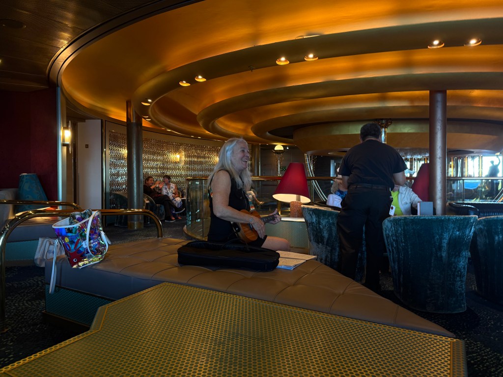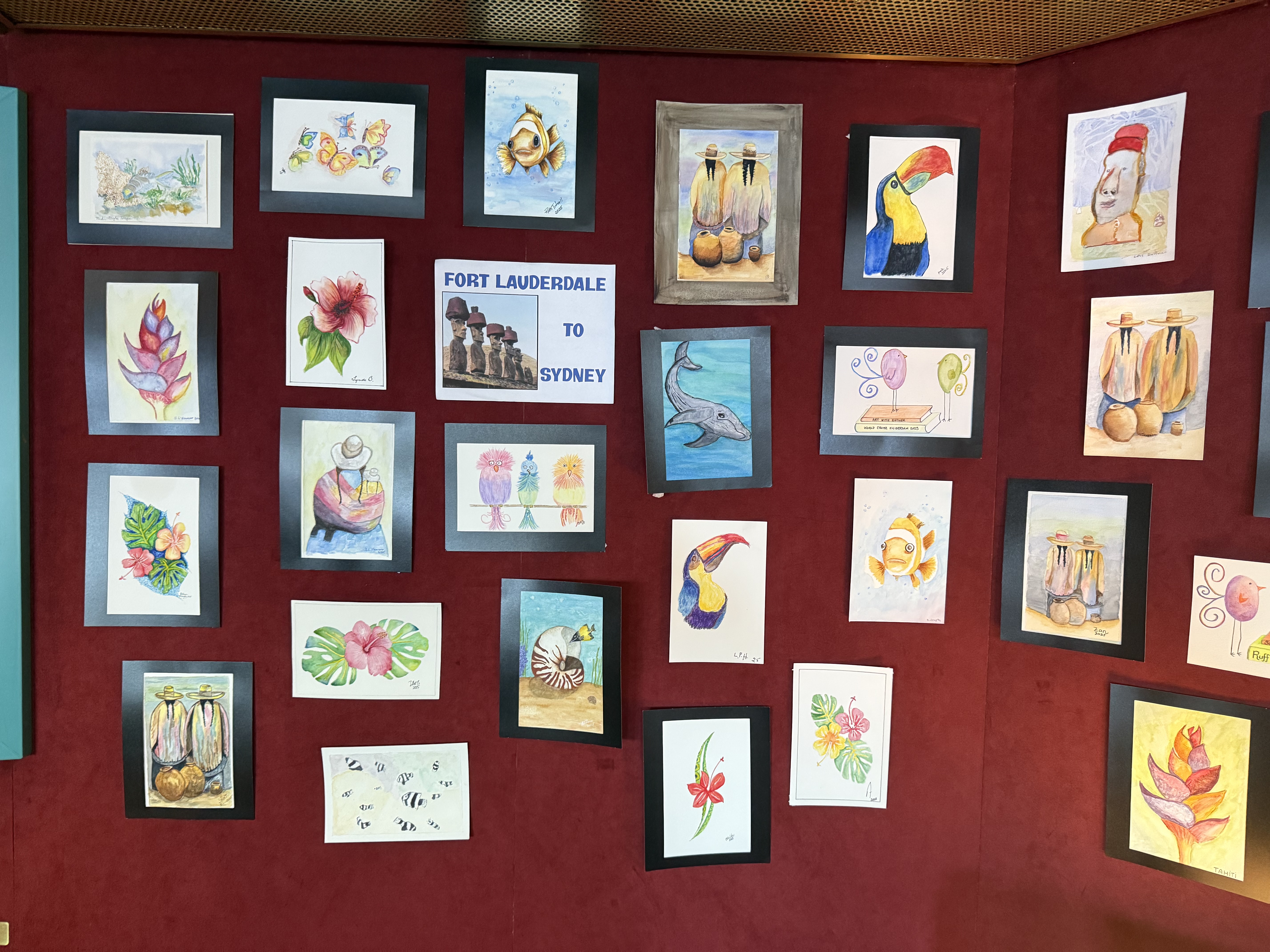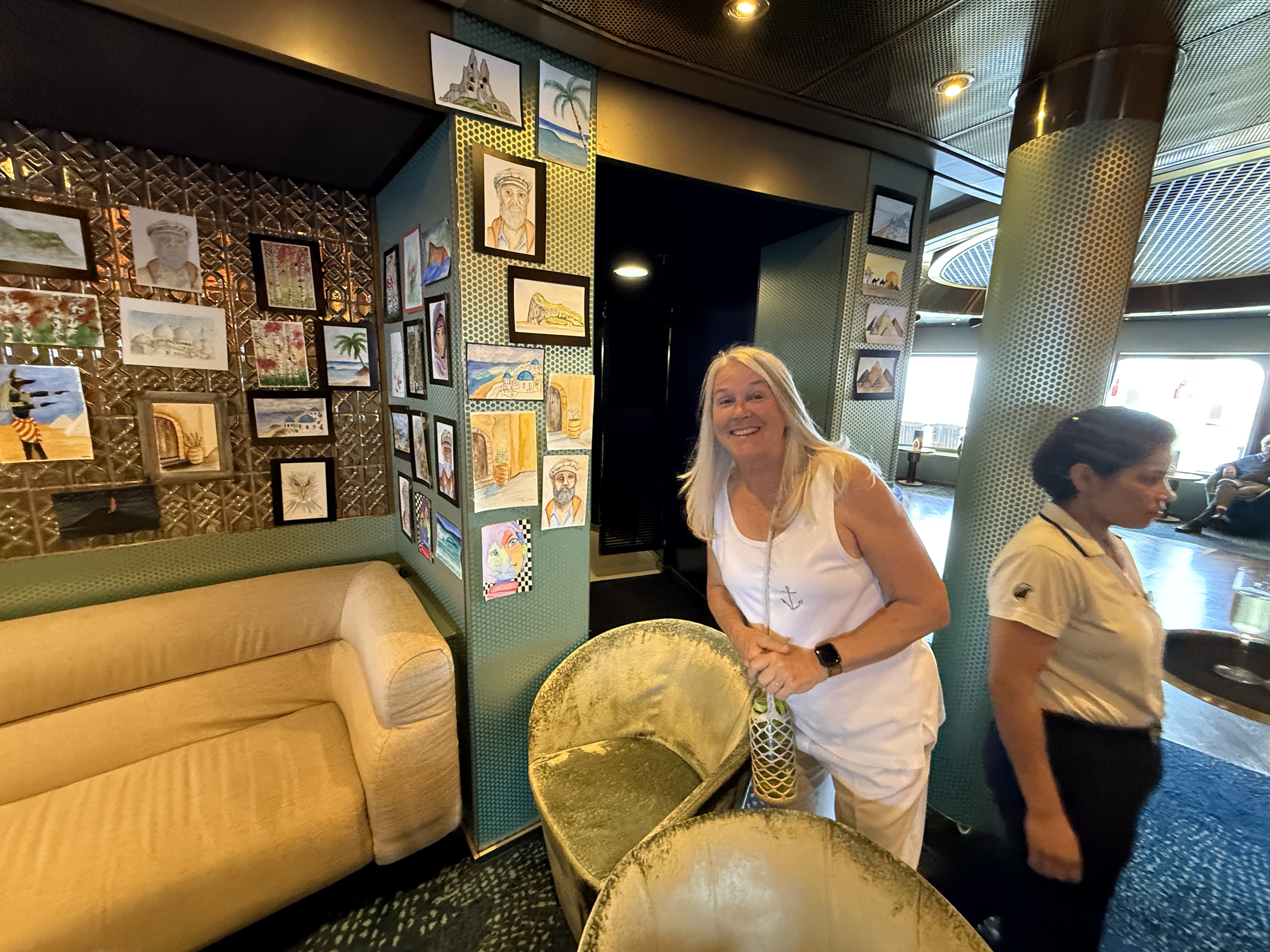 Yesterday was a big day for Nana, she showed off her watercolor paintings she has done during the cruise, jam with the band with her Ukulele, and sing in the guest talent show. Here is Nana spotlighting her pictures (she only has 3 in the lounge, the others are from other artists).