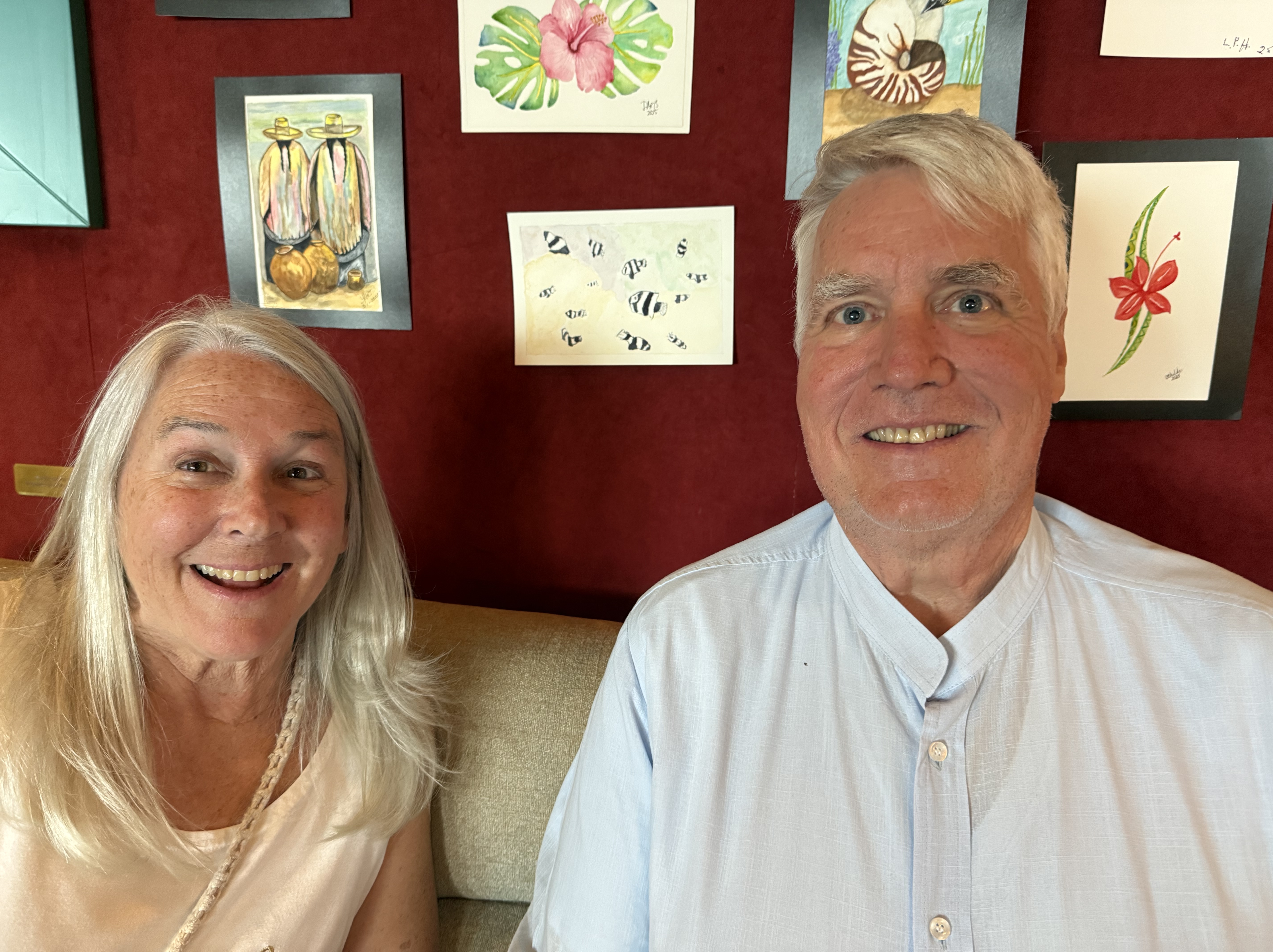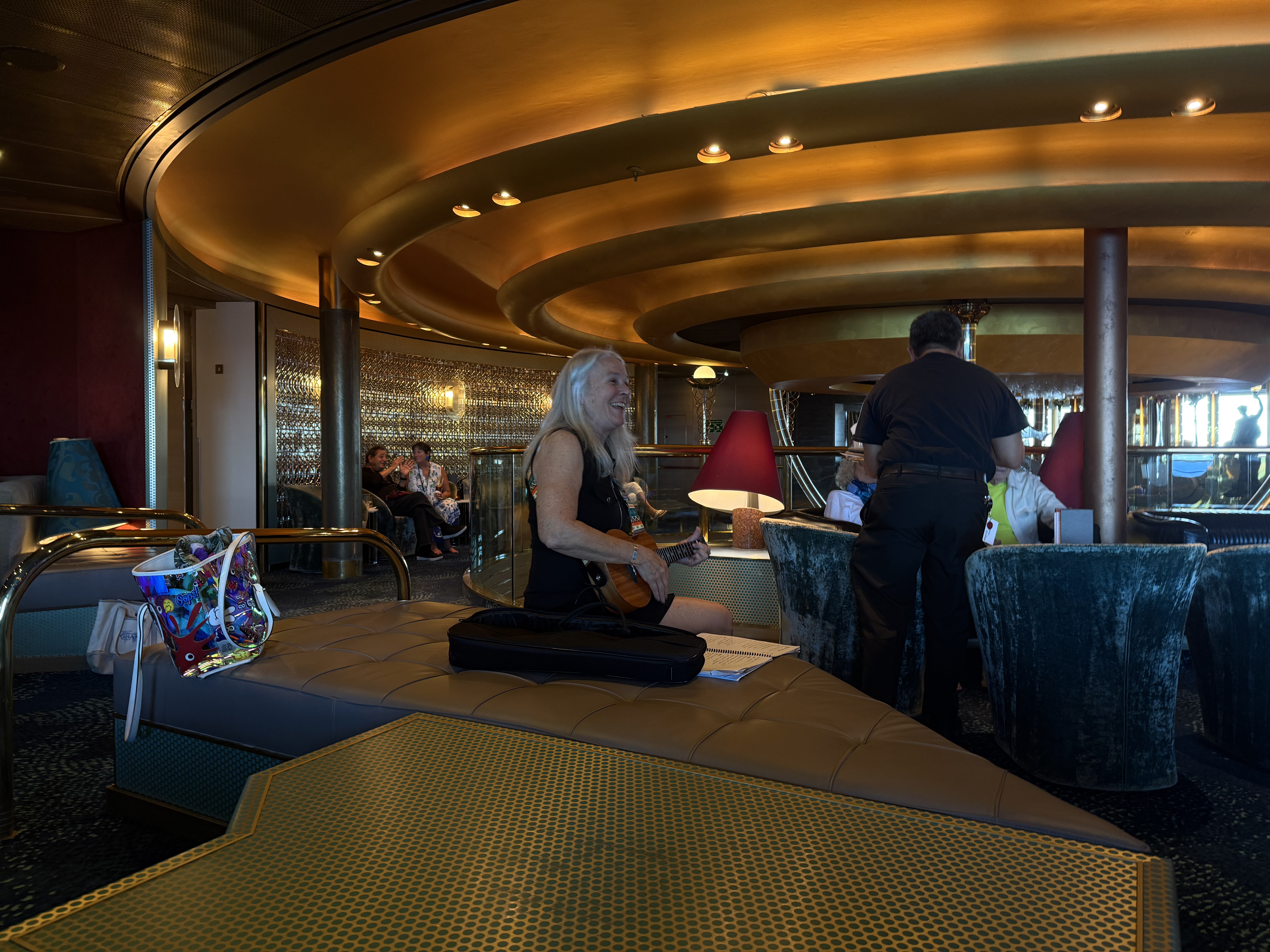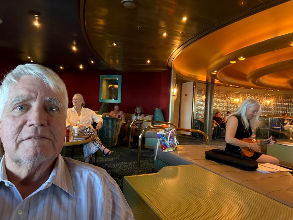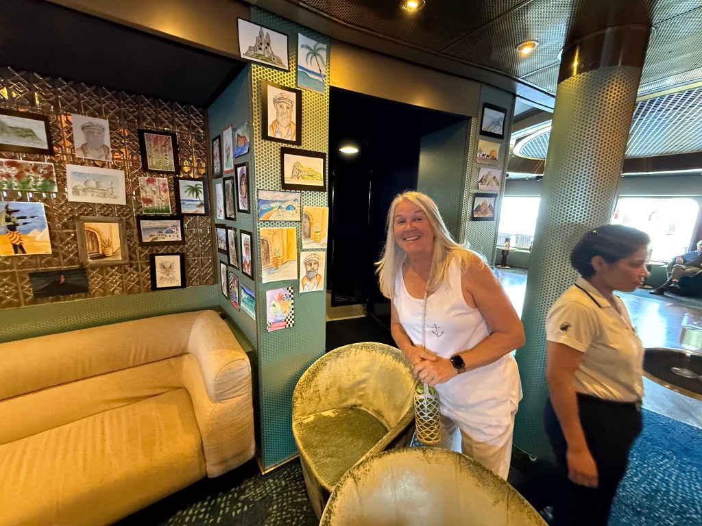 Yesterday was a big day for Nana, she showed off her watercolor paintings she has done during the cruise, jam with the band with her Ukulele, and sing in the guest talent show. Here is Nana spotlighting her pictures (she only has 3 in the lounge, the others are from other artists).