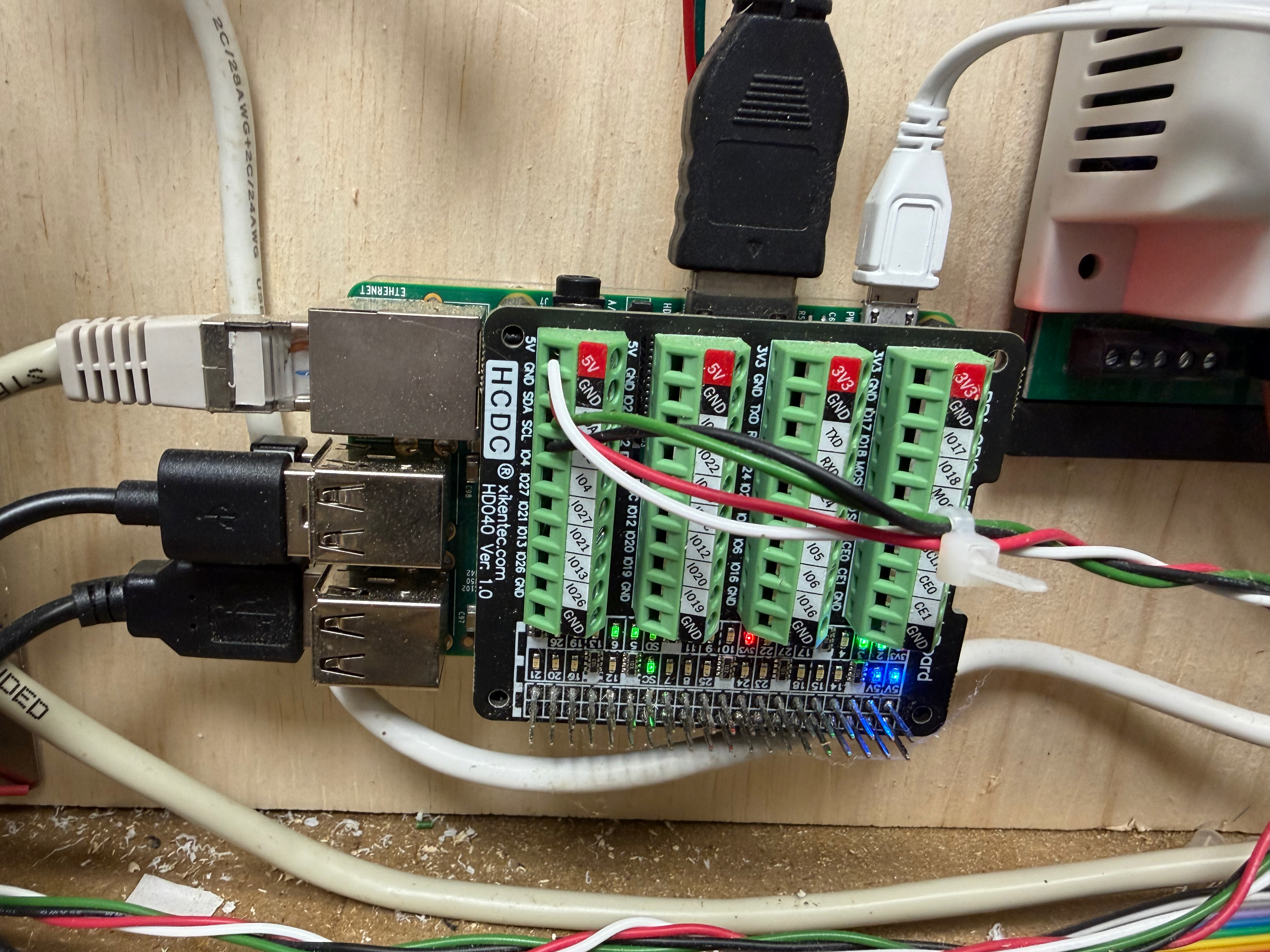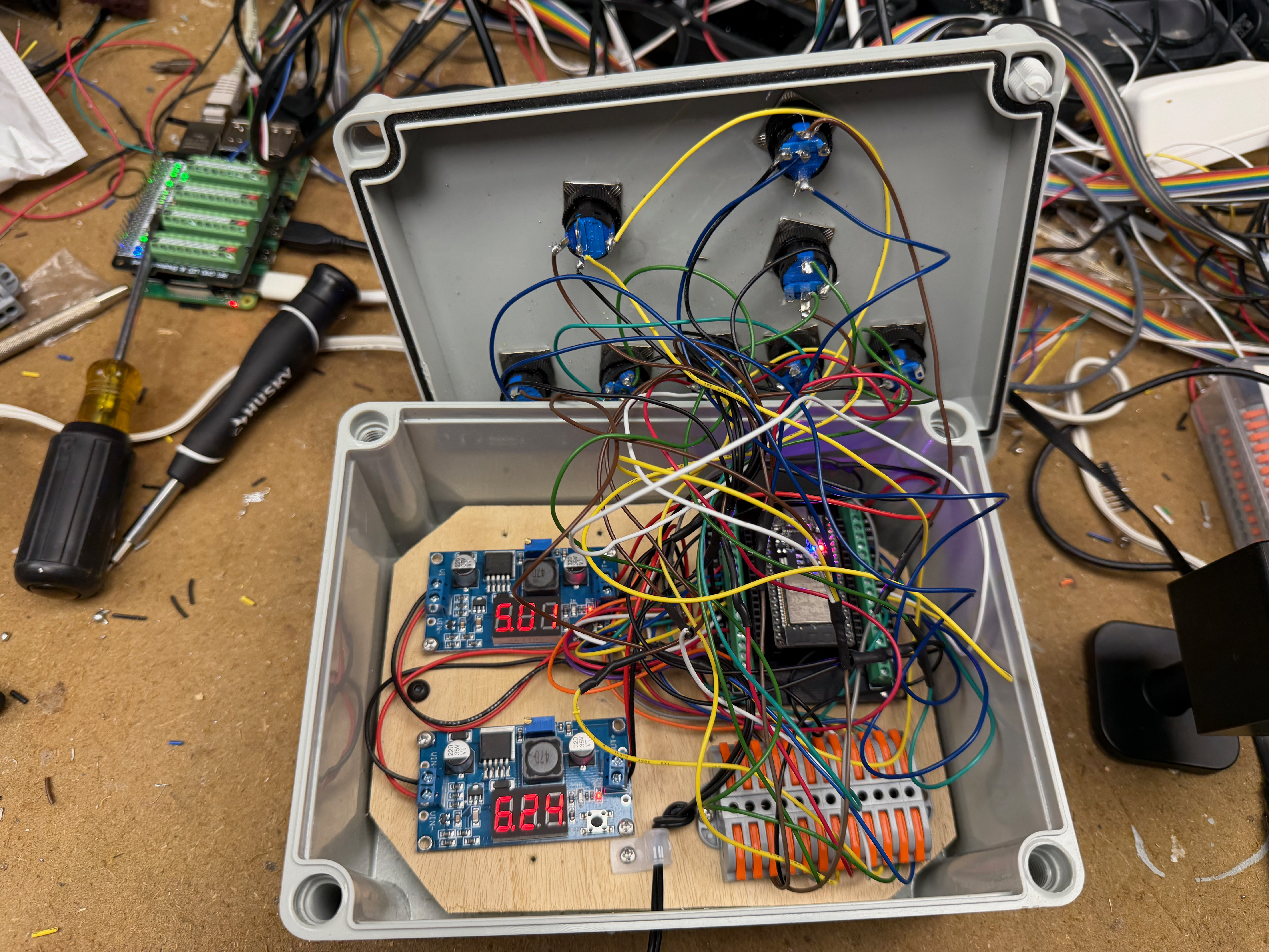 So I tried a different version that utilized a ESP32. This way the only wires needed for coming to the control box was a power cable. The ESP32 was the perfect choice as it had over 8 inputs and 8 outputs and could send MQTT commands to the Raspberry Pi. The inputs came through MQTT to the Pi as MQTTT sensors. I used ChatGPT to write the program for the ESP32. Now I can control the LEDs via MQTT Turnouts and the button come in as MQTT sensors. I again utilized the ULN803A to switch the 6.3v LED buttons via the outputs of the ESP32.
