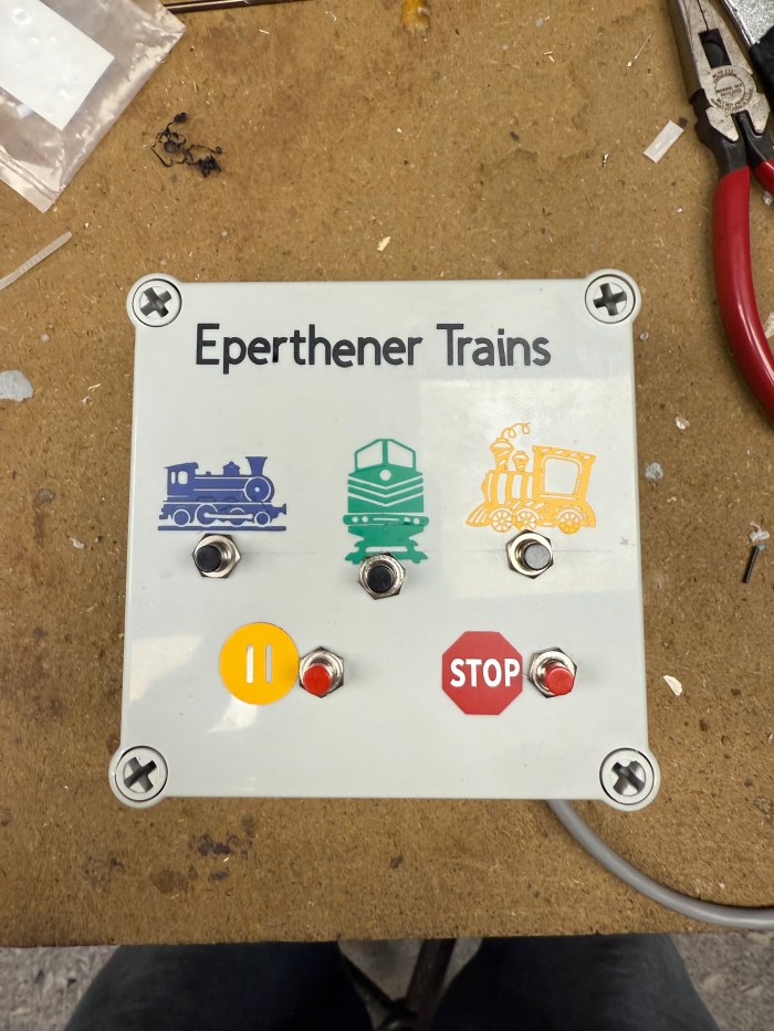 To make it simple my first control box utilized simple pushbuttons. I had 5 buttons that controlled the trains in additional to a run, start, and pause button. The initial program allowed the children to select 1 of 5 programs and then to push the run button, when they were ready for the train to stop they would push the stop button. Now my grandchildren range from 1 year old to 15 year old so the older ones could figure it out the younger ones just pushed buttons.