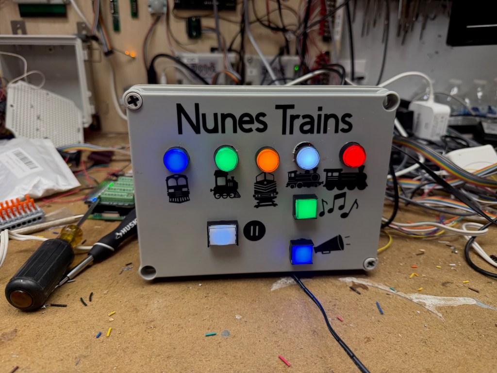 I then changed the buttons to individual trains running, a pause button, a song button, and a voice button. The program would run the color of the train in a loop and then stop. The grandchildren could then pick a different train to run after the first train stopped. They could pause the train anytime and push the song button if they wanted to play a song or a voice button if they wanted to hear their voice from the train. I utilized Zimo decoders for the sound and engine control and I utilized Digitrax boards (specifically a DS74 and SE74 for the push buttons. They were tied to sensors in JMRI. I wrote several scripts utilized by JMRI (Java Model Railroad Interface) that managed the sensor inputs and changed the function of the buttons as needed. This was a lot better and the train layouts were better utilized by the grandchildren. The new problem was that the grandchildren would keep pushing buttons and not understand when they could use a certain button.