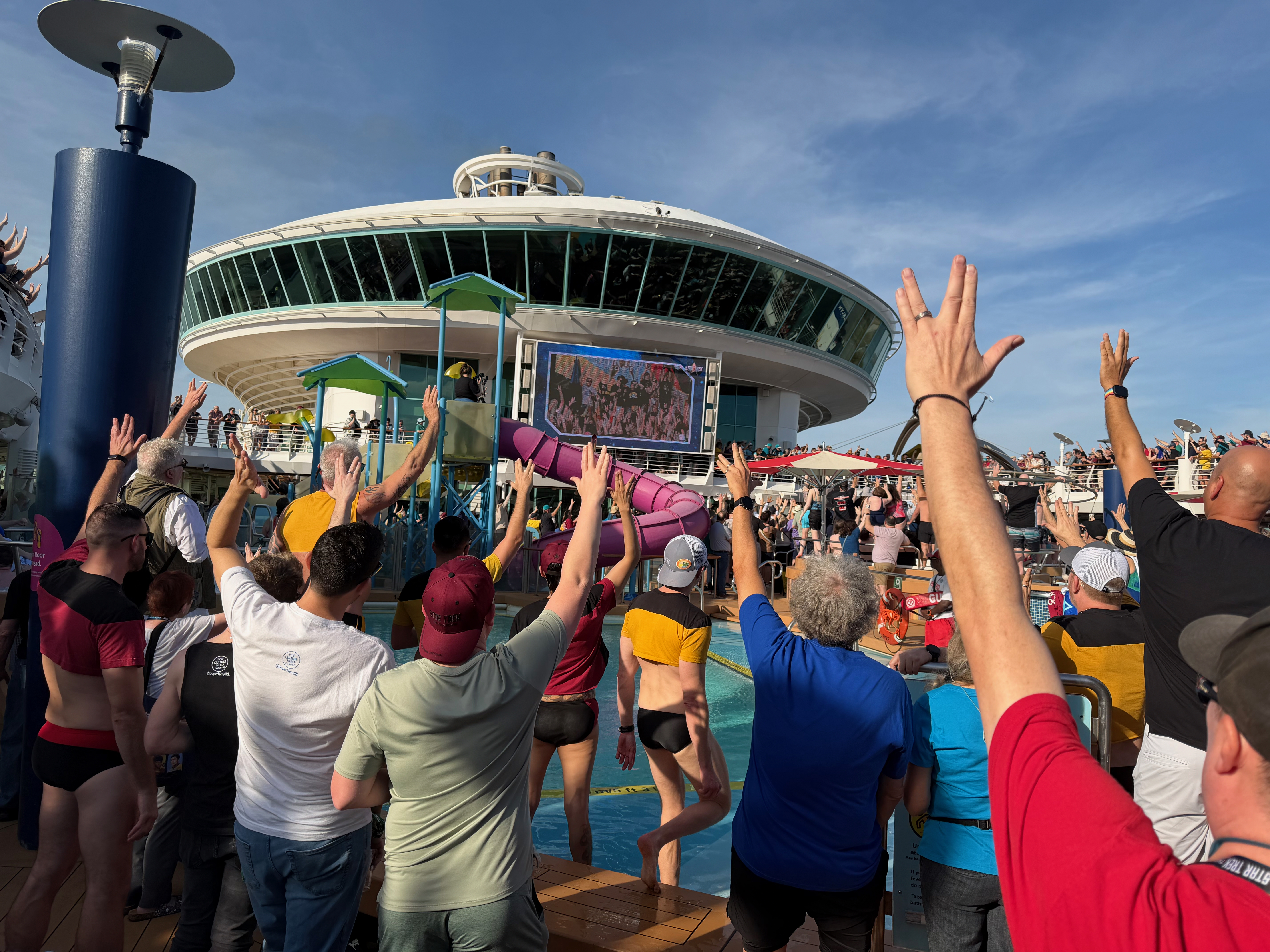 The sail away party was a big event in the pool area. Everyone showed up and all of the actors that came on the cruise were introduced to us all.