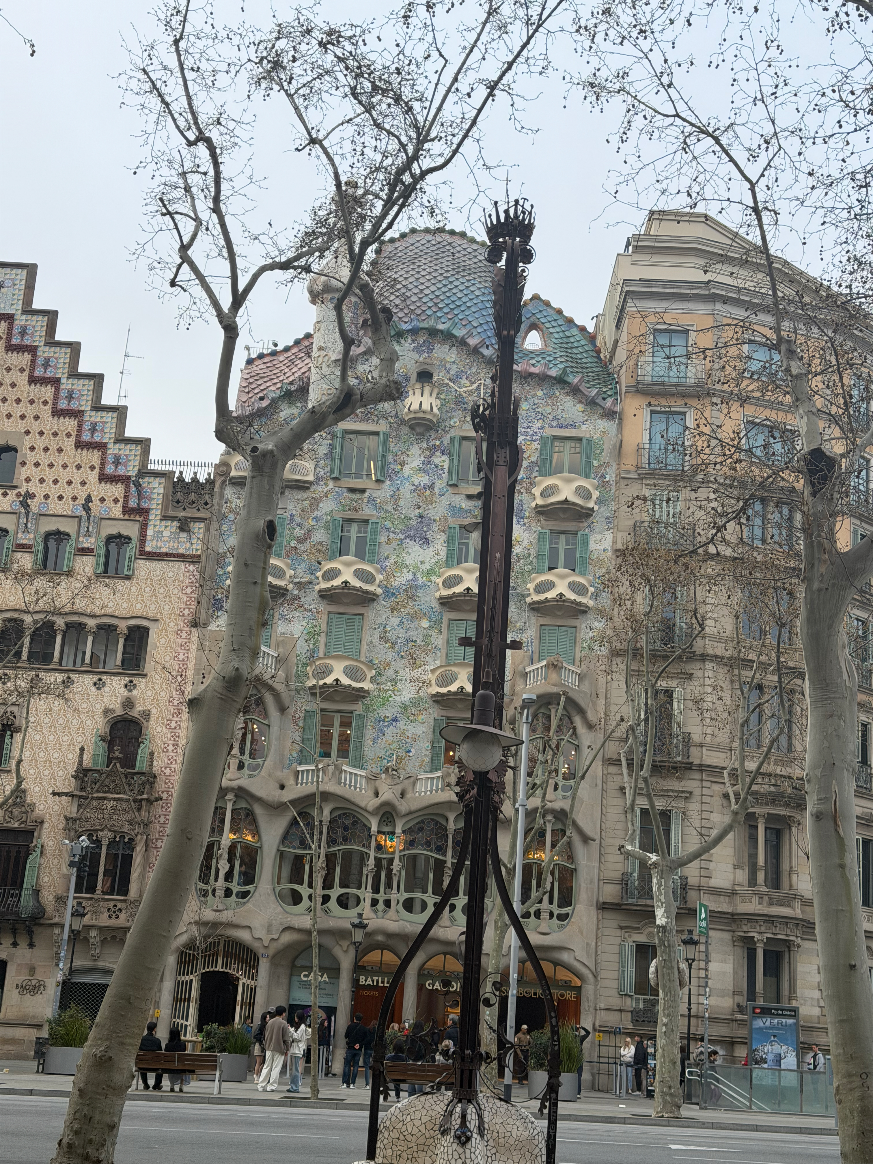 A wild, almost surreal building in the middle of a normal city block — clearly designed by Antoni Gaudí.